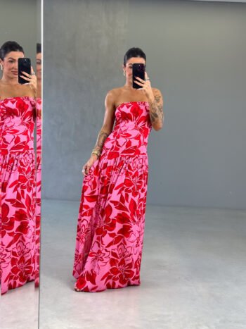 • Vestido Midi Sem Alça Detalhe Bufante no Busto Vermelho R$1,200.00 em até 6x de R$200.00 sem juros R$1,080.00 no pix