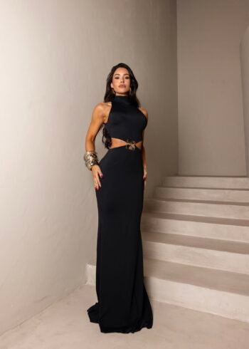 A modelagem sereia é incrivelmente elegante e o detalhe do cut-out lateral com a fivela dourada é um toque de glamour que valoriza a cintura. É o vestido ideal para madrinhas, formandas ou qualquer evento de gala. Peça de luxo