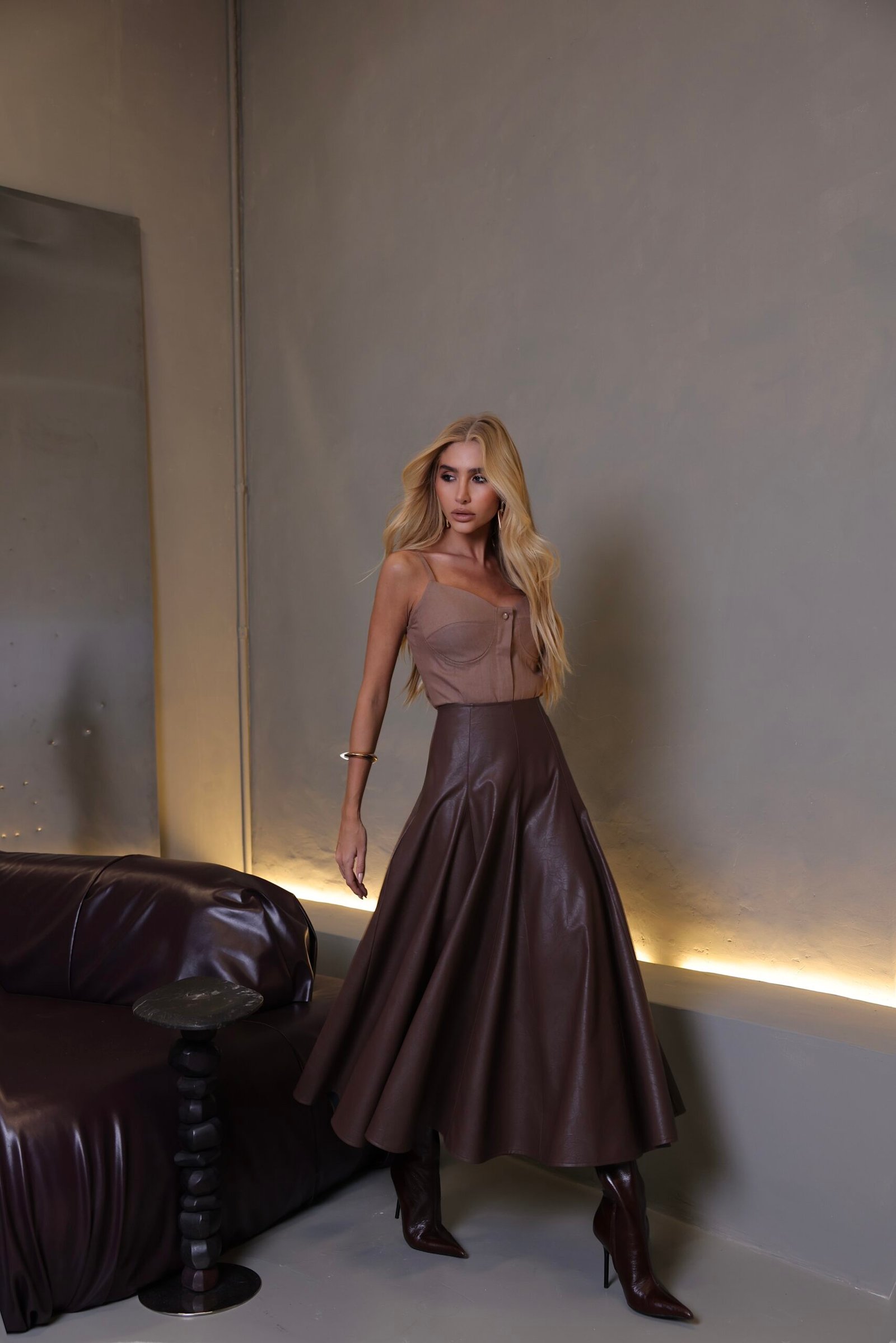 Vestido curto confeccionado em couro sintético com toque macio.