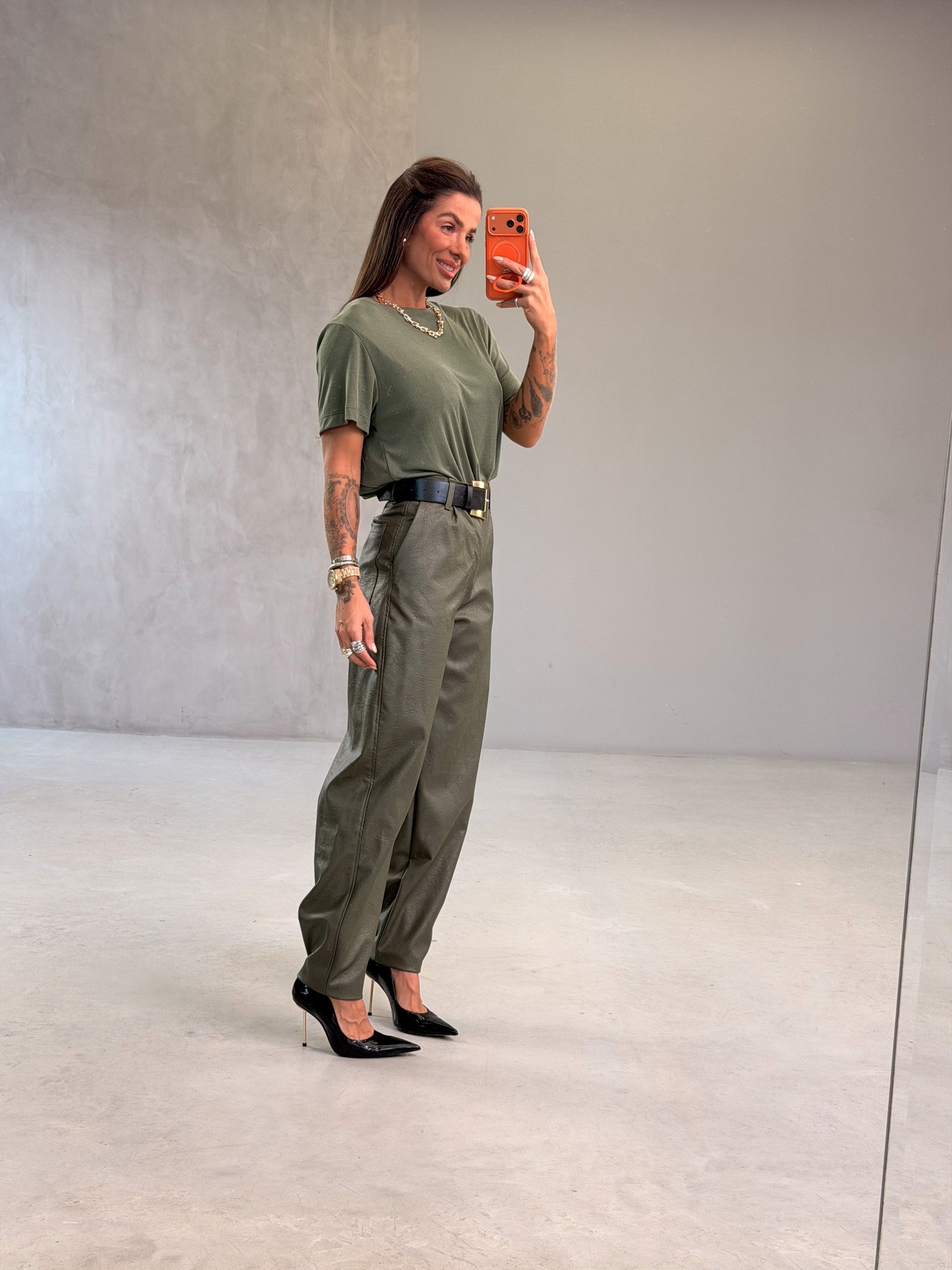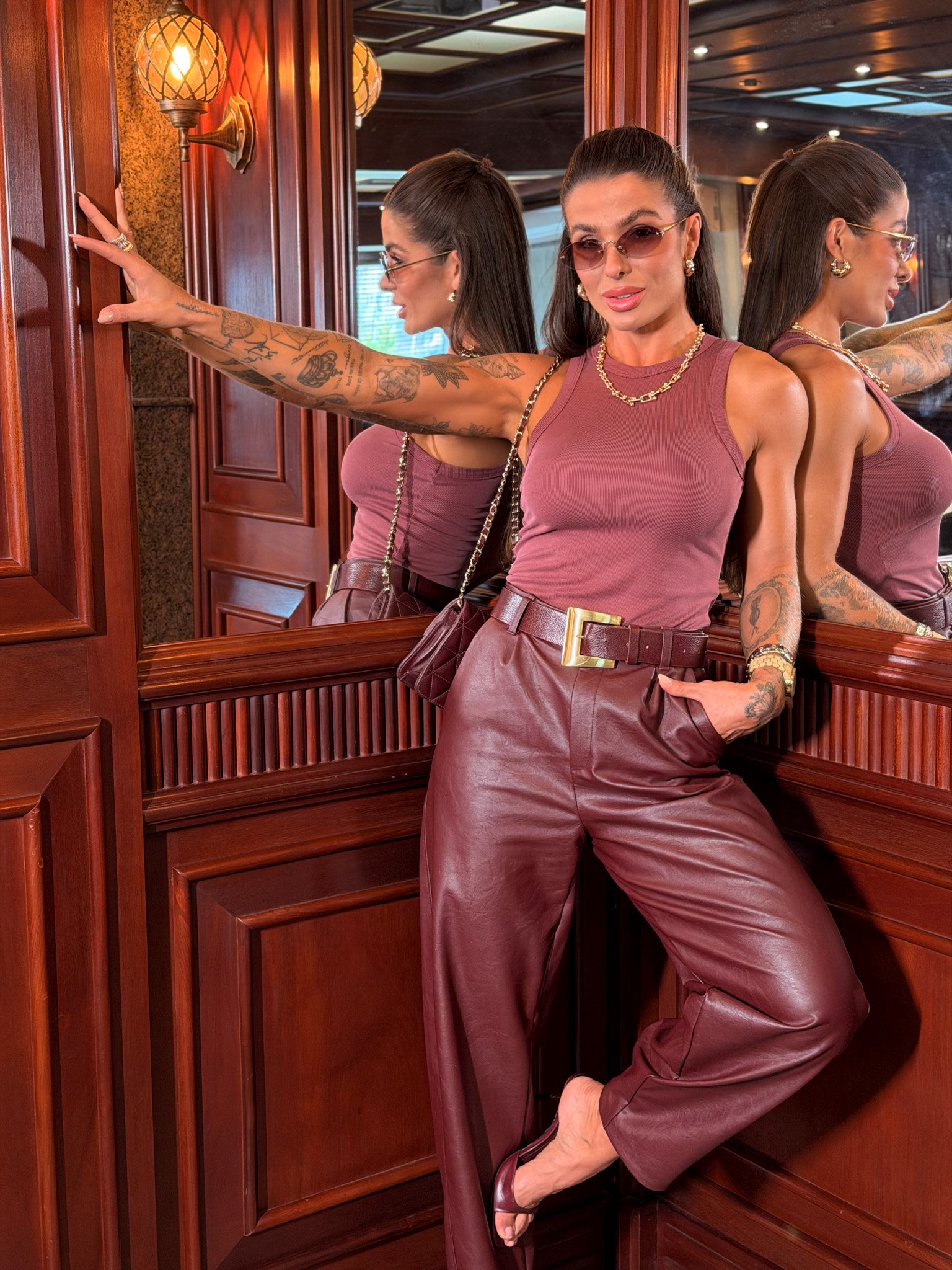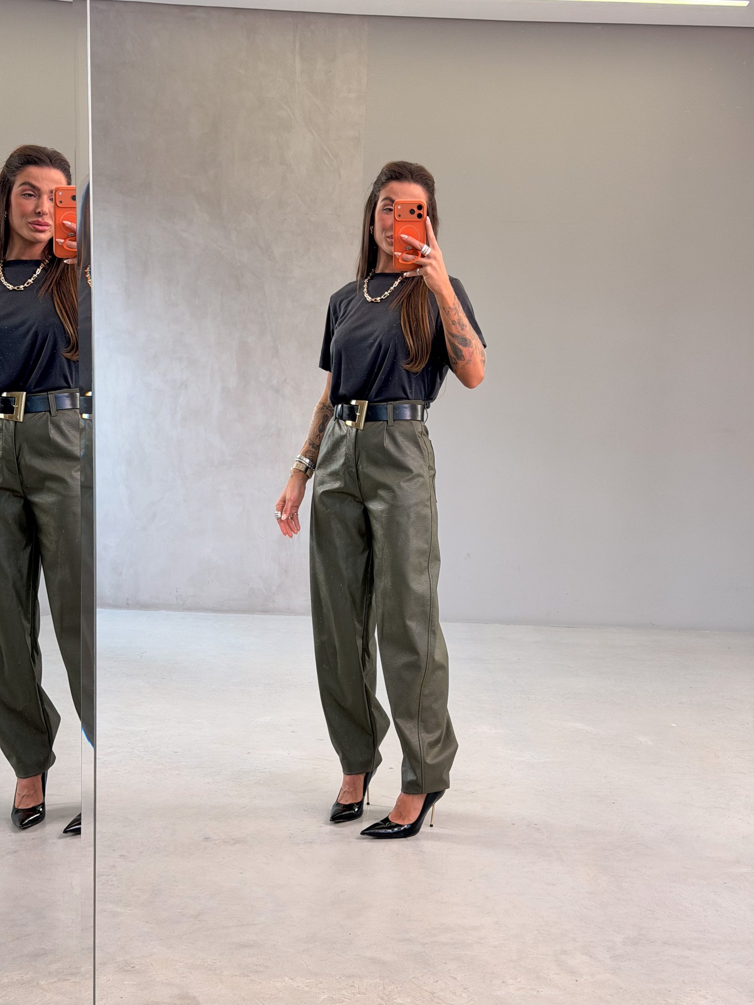 Elegância com atitude. Essa peça é o equilíbrio perfeito entre sofisticação e modernidade — feita para mulheres que gostam de marcar presença. Confeccionada em couro fake premium, a calça possui modelagem reta levemente ampla, com cintura alta que valoriza a silhueta e proporciona um caimento impecável.