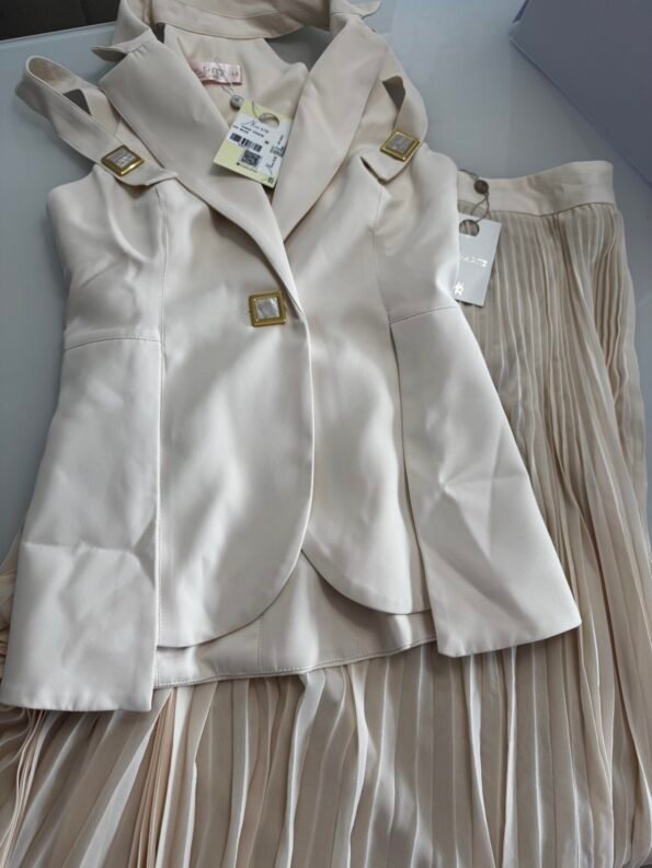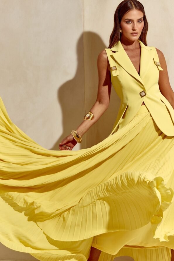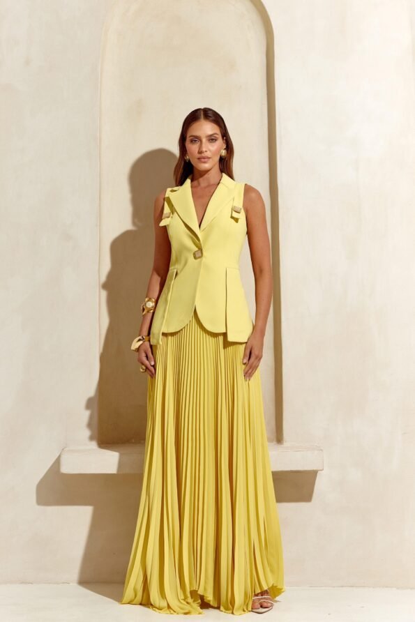 Conjunto de crepe ocre com saia de pregas e cós alto, perfeito para quem ama uma alfaiataria estruturada.