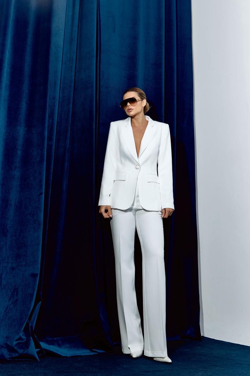 Conjunto Pietra é o epítome de elegância atemporal, um verdadeiro clássico que merece um lugar de destaque no guarda-roupa de toda mulher. O blazer, com ombreiras altas e marcadas, oferece um toque de poder e sofisticação, enquanto o decote acentuado com gola smoking confere um ar de sensualidade discreta.