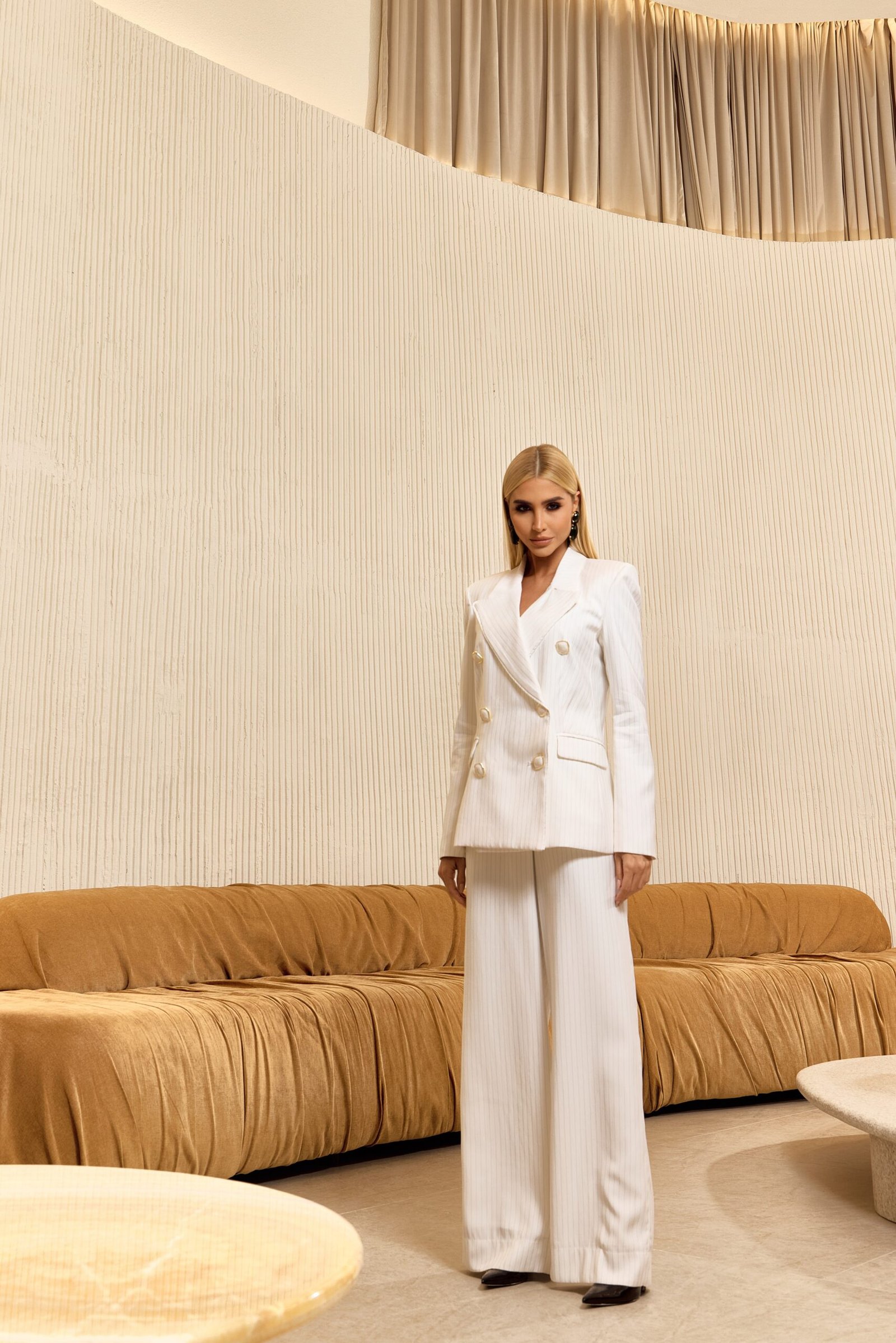Conjunto Pietra é o epítome de elegância atemporal, um verdadeiro clássico que merece um lugar de destaque no guarda-roupa de toda mulher. O blazer, com ombreiras altas e marcadas, oferece um toque de poder e sofisticação, enquanto o decote acentuado com gola smoking confere um ar de sensualidade discreta.