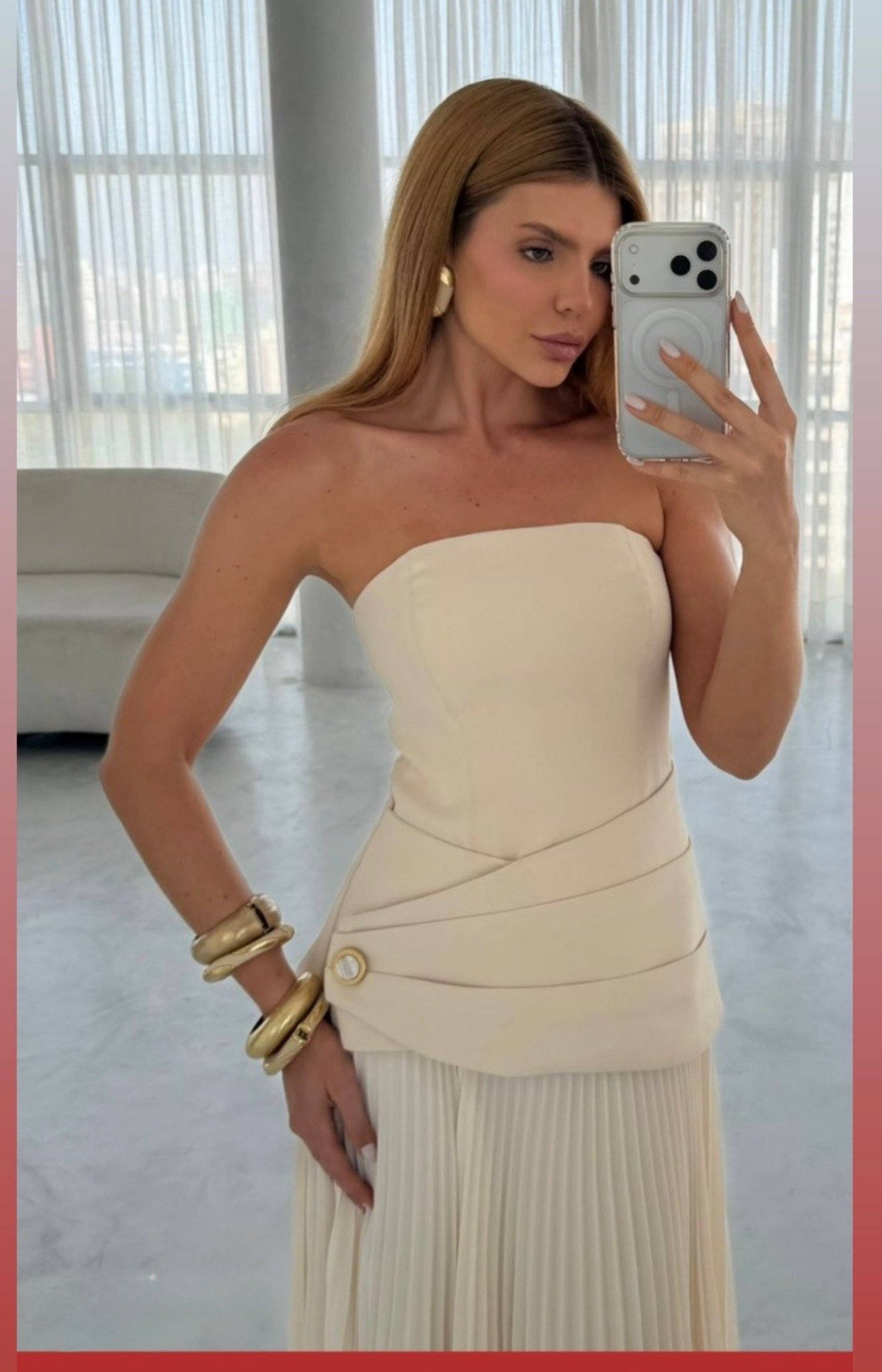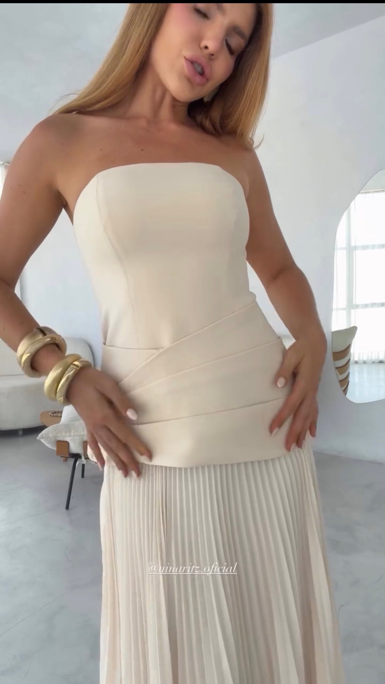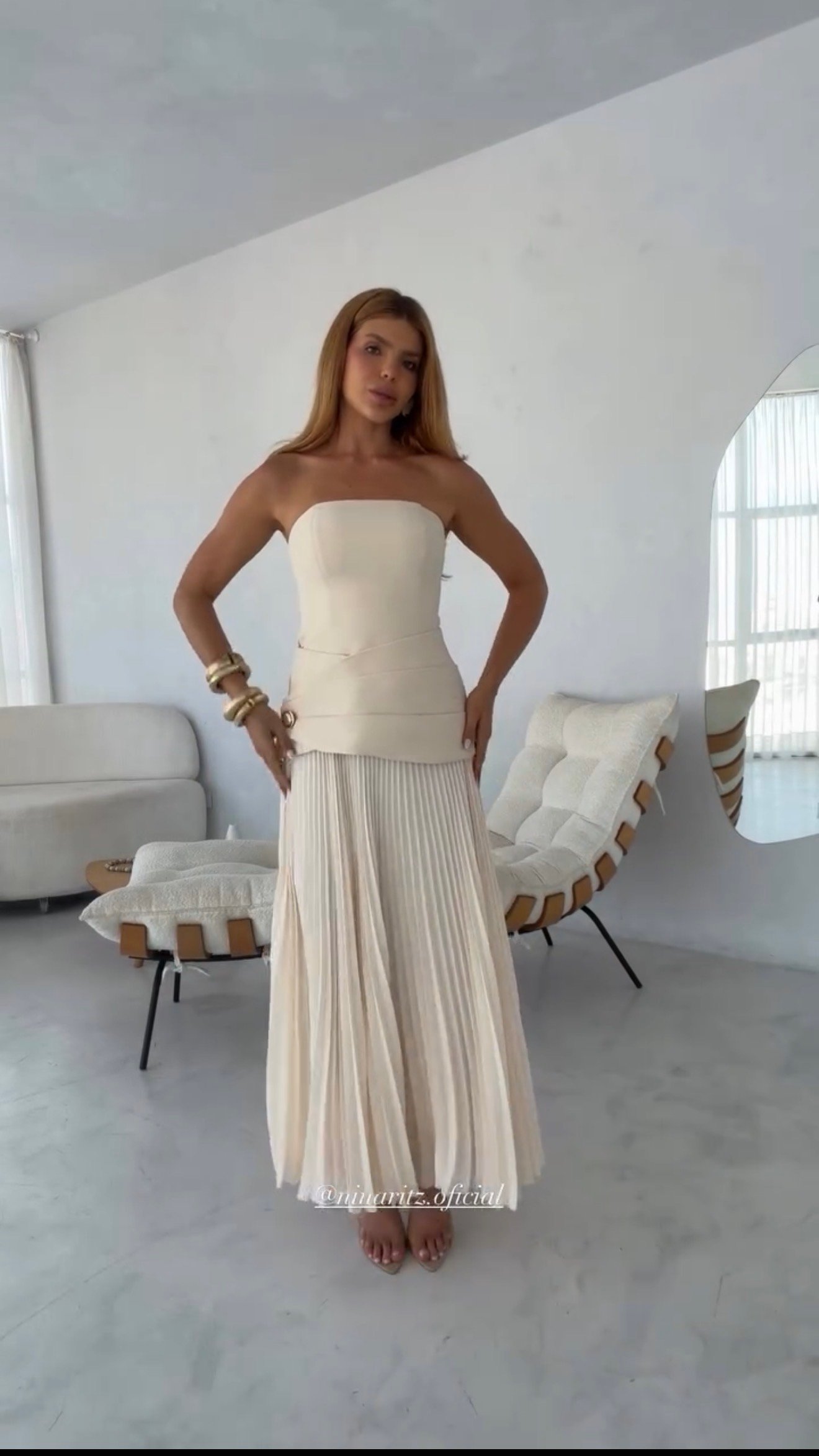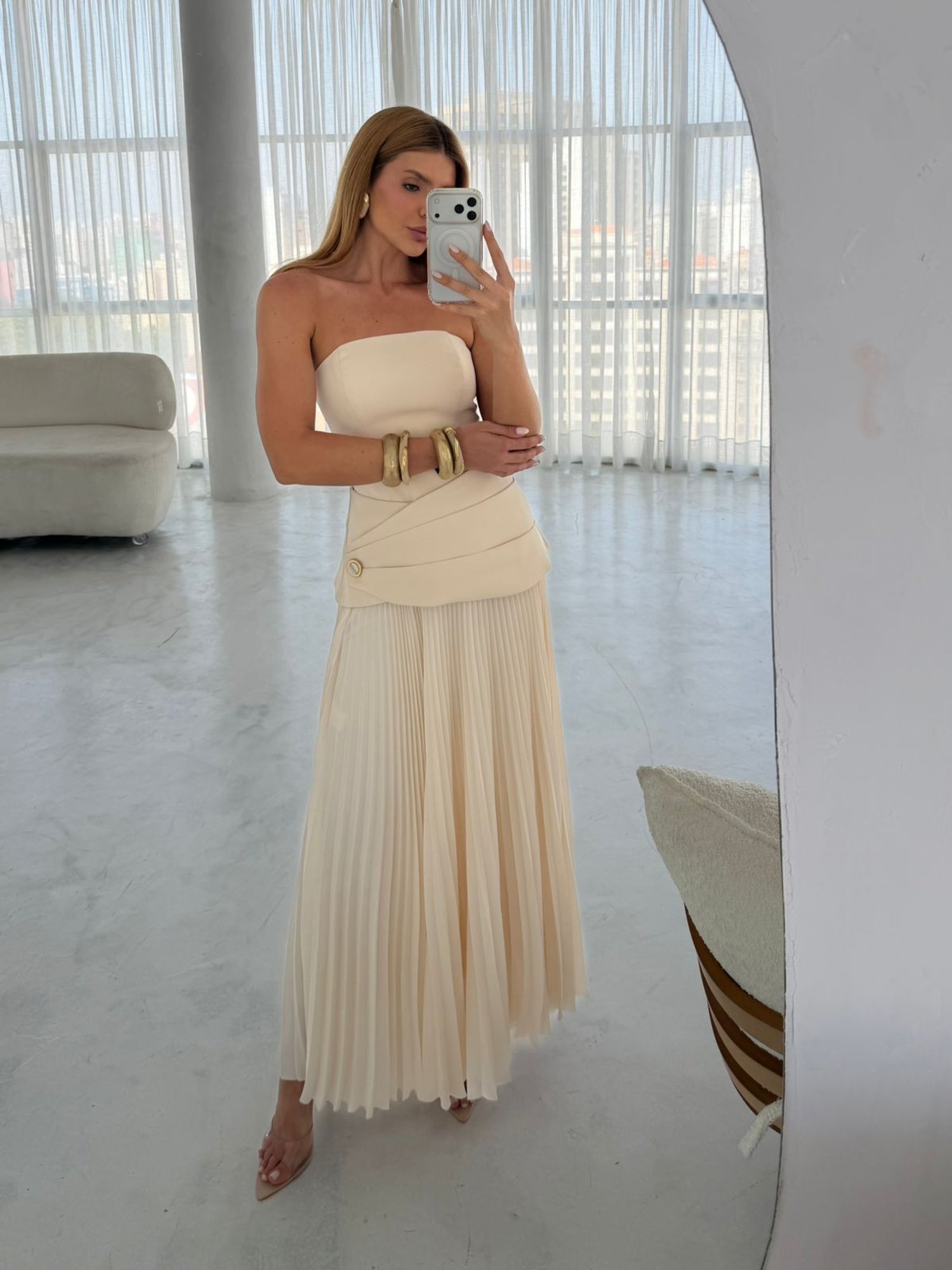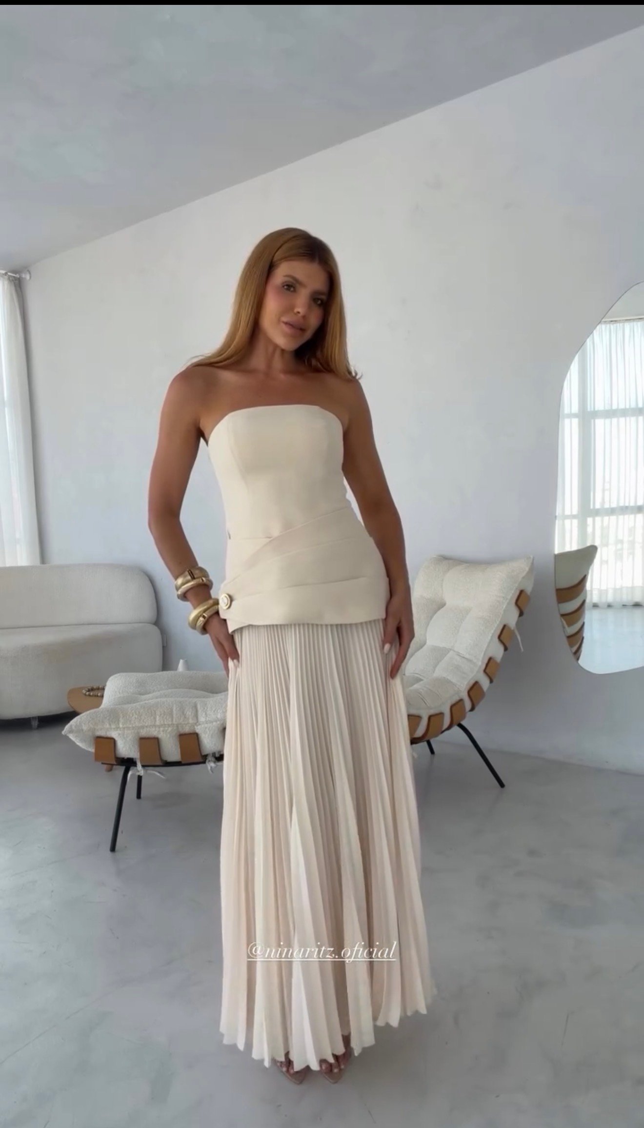 Vestido midi de organza bege: sofisticado e elegante, o vestido apresenta bordado em dourado, decote em “A” Limonada Pink