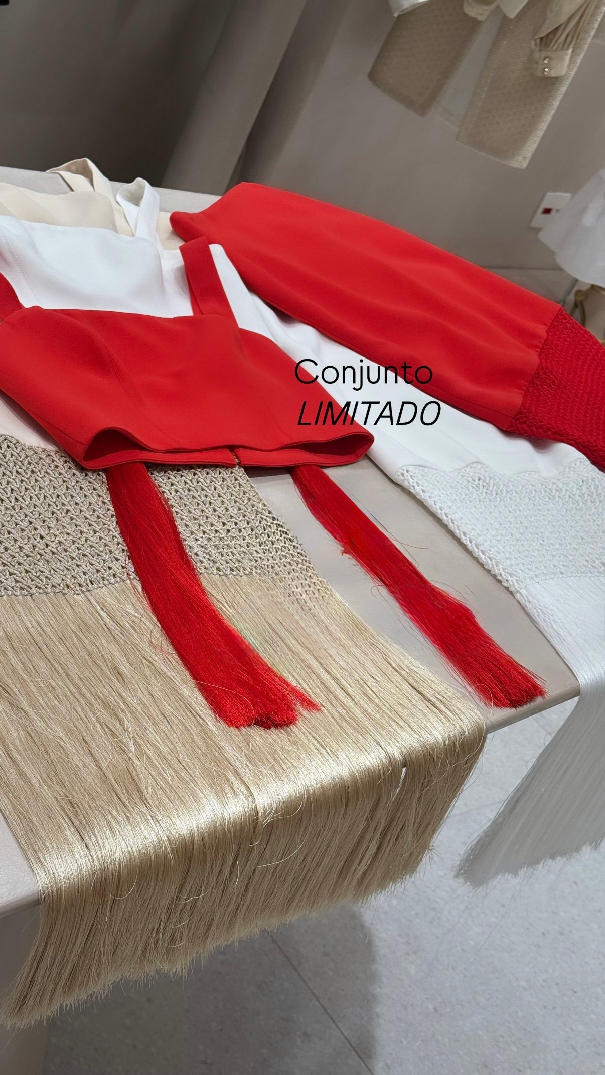 Um conjunto perfeito para eventos, festas e ocasiões especiais. Disponível em cores: vermelho, off white e nude.