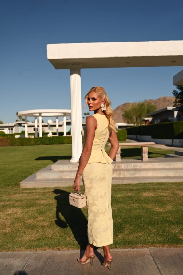 O top em linho estruturado modela o corpo com recortes que valorizam a silhueta e detalhe peplum que traz leveza e movimento.