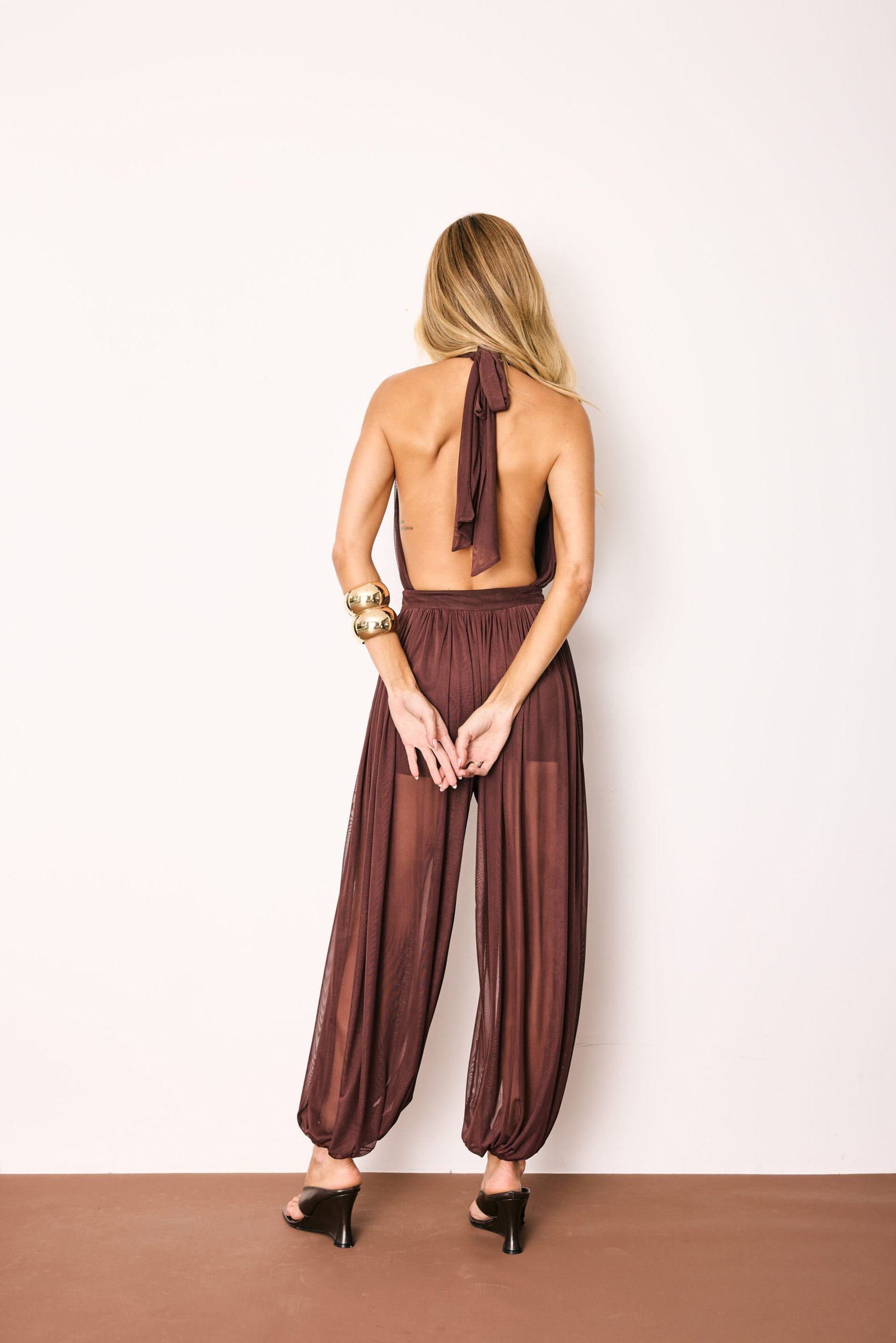 Composto por body em tule com decote profundo e amarração no pescoço, ele valoriza o colo e deixa as costas completamente à mostra, criando um visual elegante e marcante na medida certa.