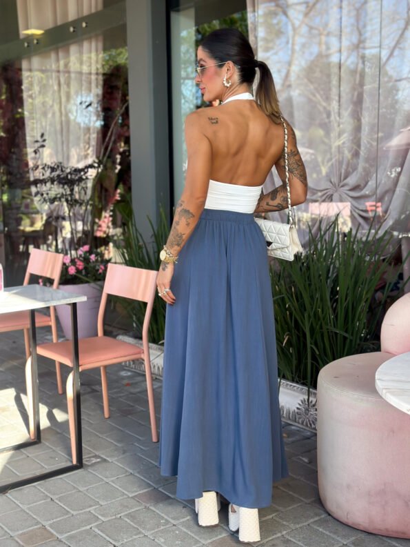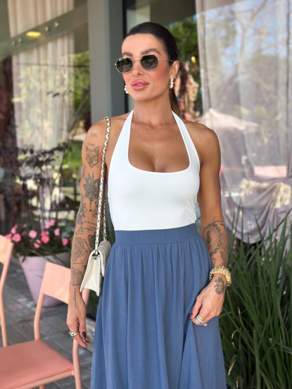 Conjunto Alfaitaria blusa estilo corset e saia risca de giz