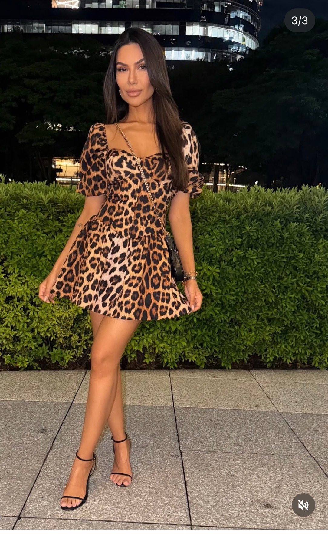 Vestido curto em estampa animal print, com modelagem feminina e extremamente valorizadora. Possui decote estruturado no busto, que garante melhor encaixe e sustentação, além de mangas curtas levemente bufantes, trazendo um toque romântico e sofisticado.