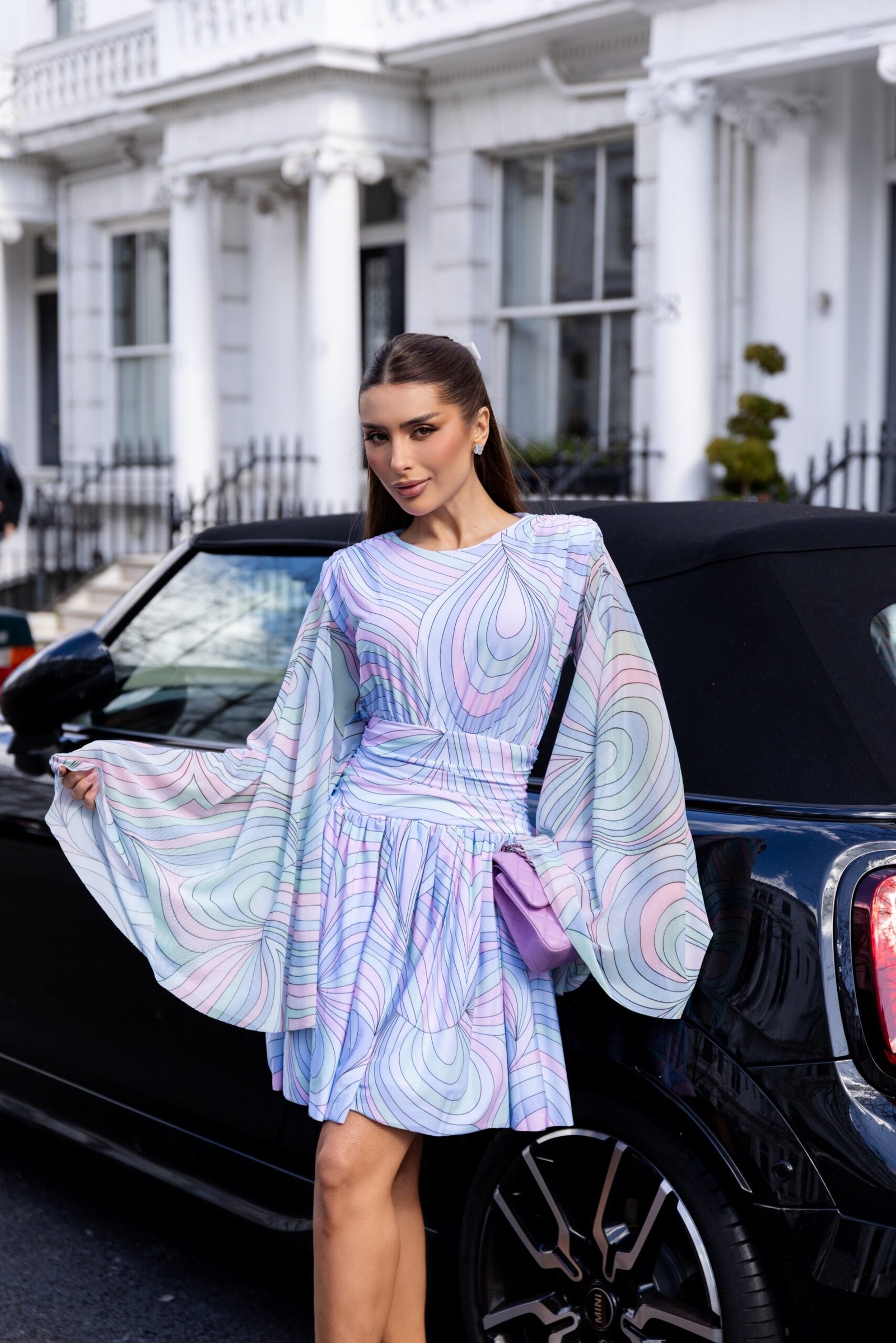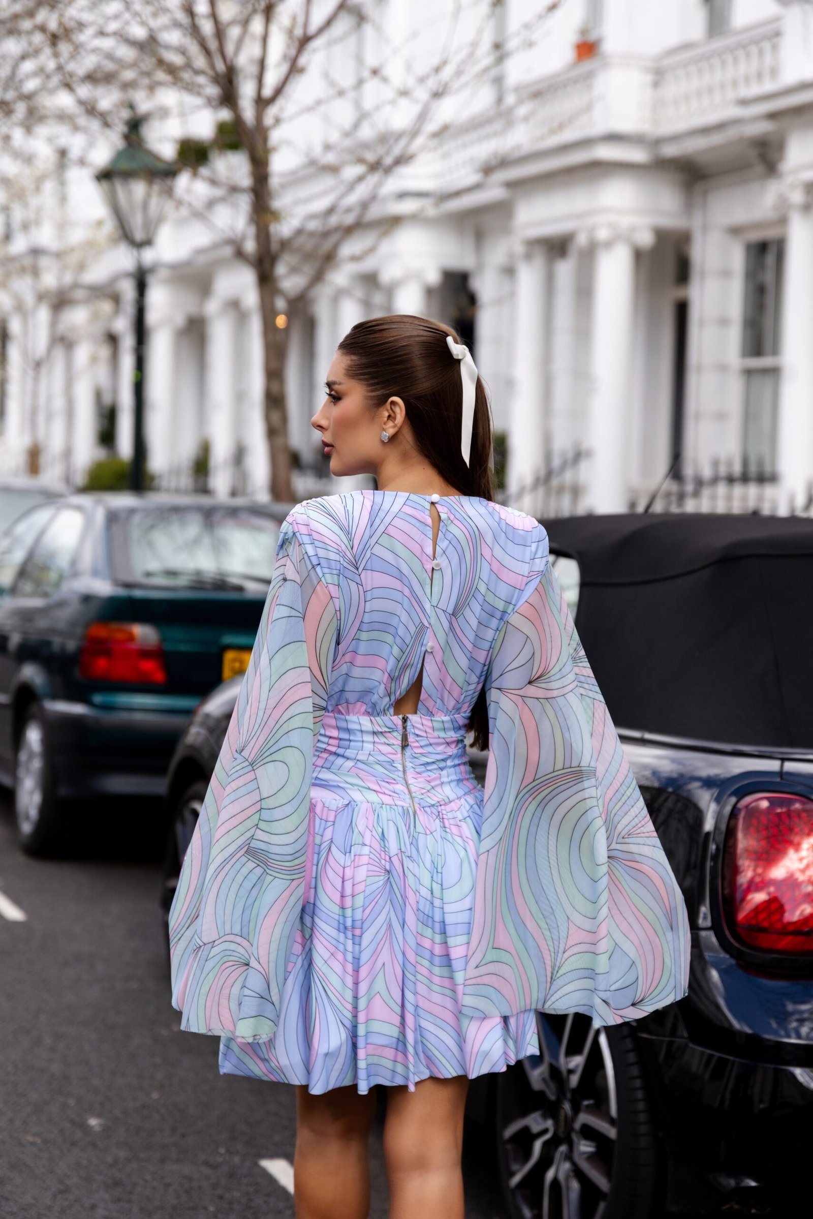 Vestido curto em tule com elasticidade, com modelagem ajustada na cintura e saia com volume que cria movimento. O modelo possui mangas amplas e fluídas que trazem leveza à produção, além de estampa exclusiva em tons suaves com efeito gráfico que adiciona um toque contemporâneo. A silhueta valoriza o corpo com fluidez e feminilidade. Fechamento posterior por zíper de metal.