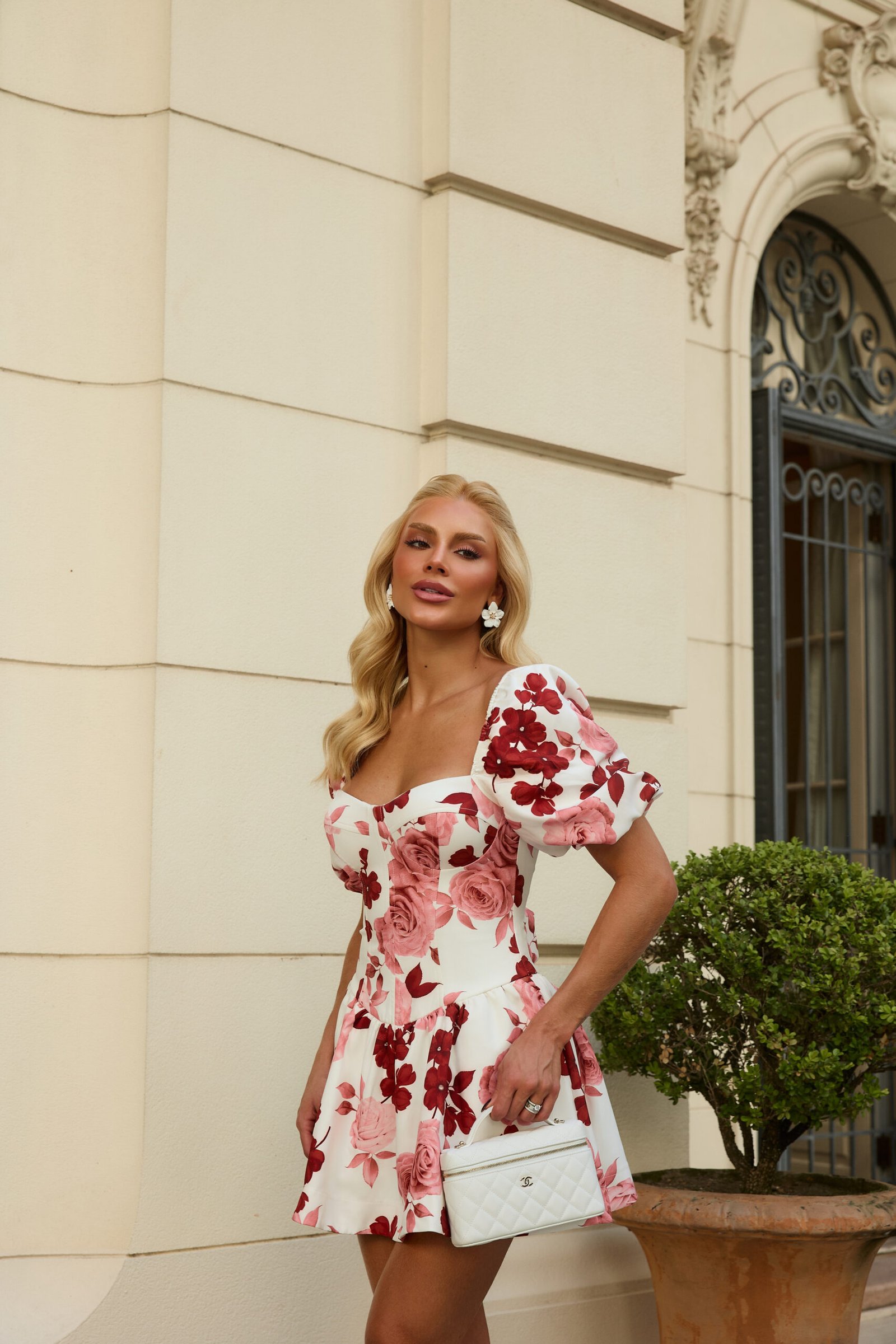 Vestido curto em crepe alfaiataria premium, estampa exclusiva floral em tons de rosa e vermelho sobre fundo off-white, modelagem acinturada com saia levemente rodada, mangas bufantes e ajuste lace-up nas costas.