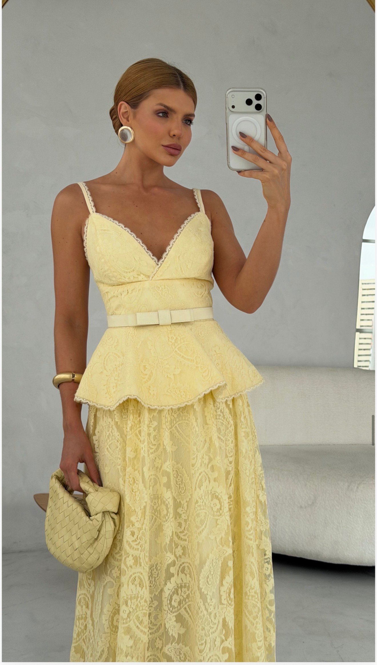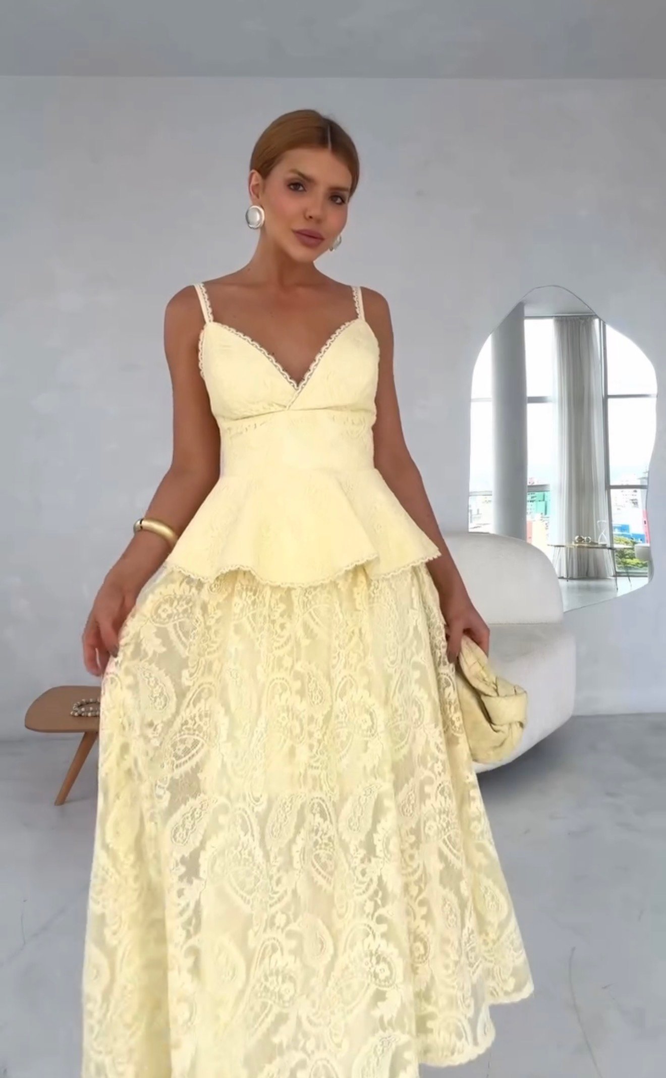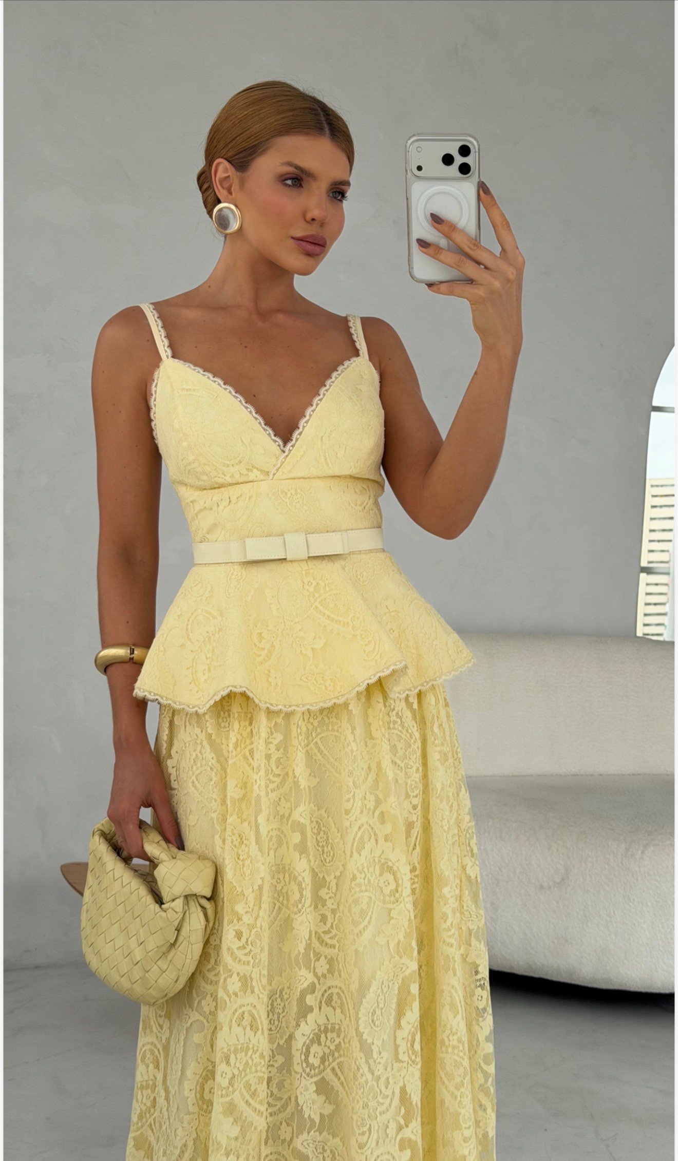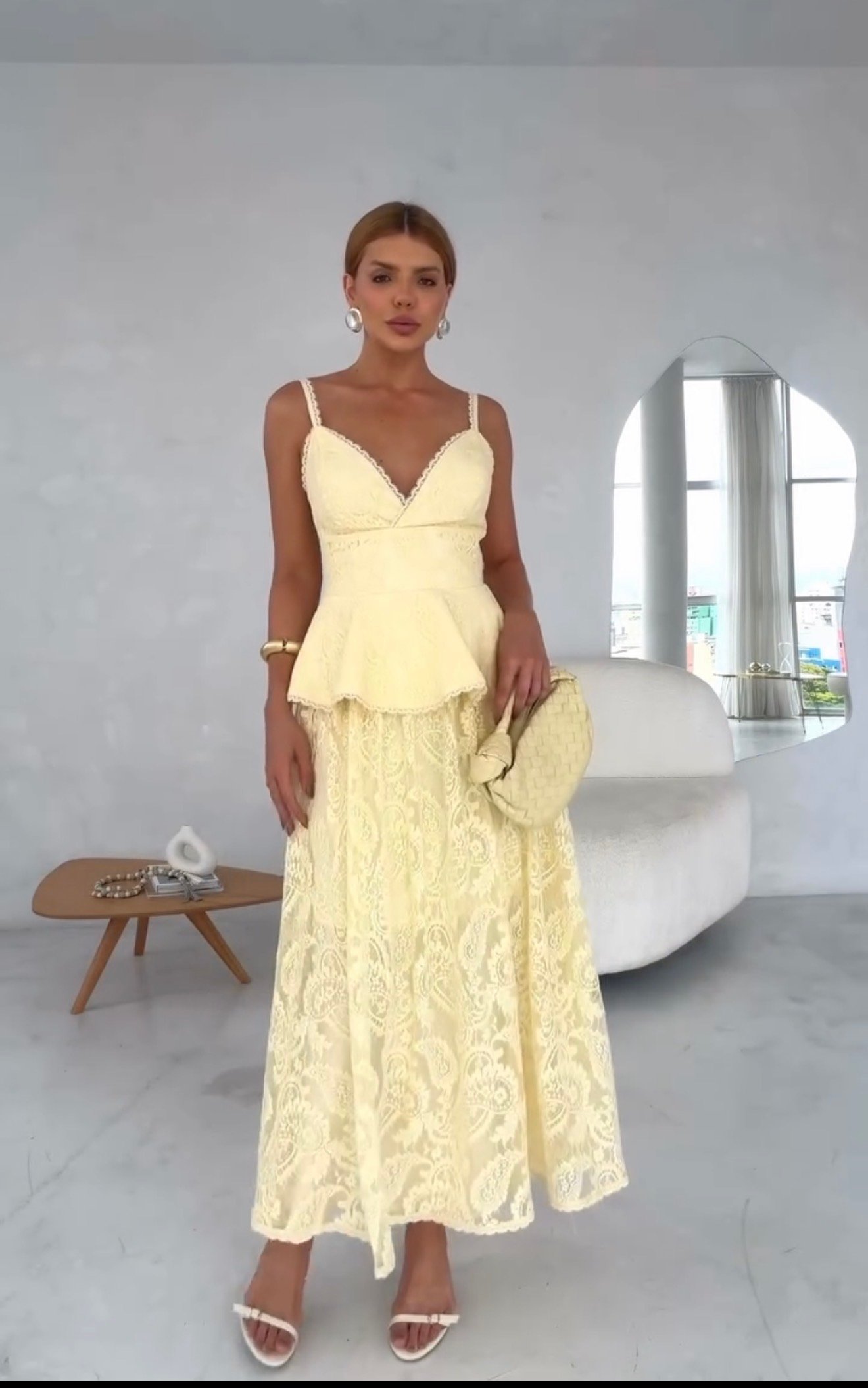 Vestido longo de renda off-white com forro no mesmo tom. Tem recortes e