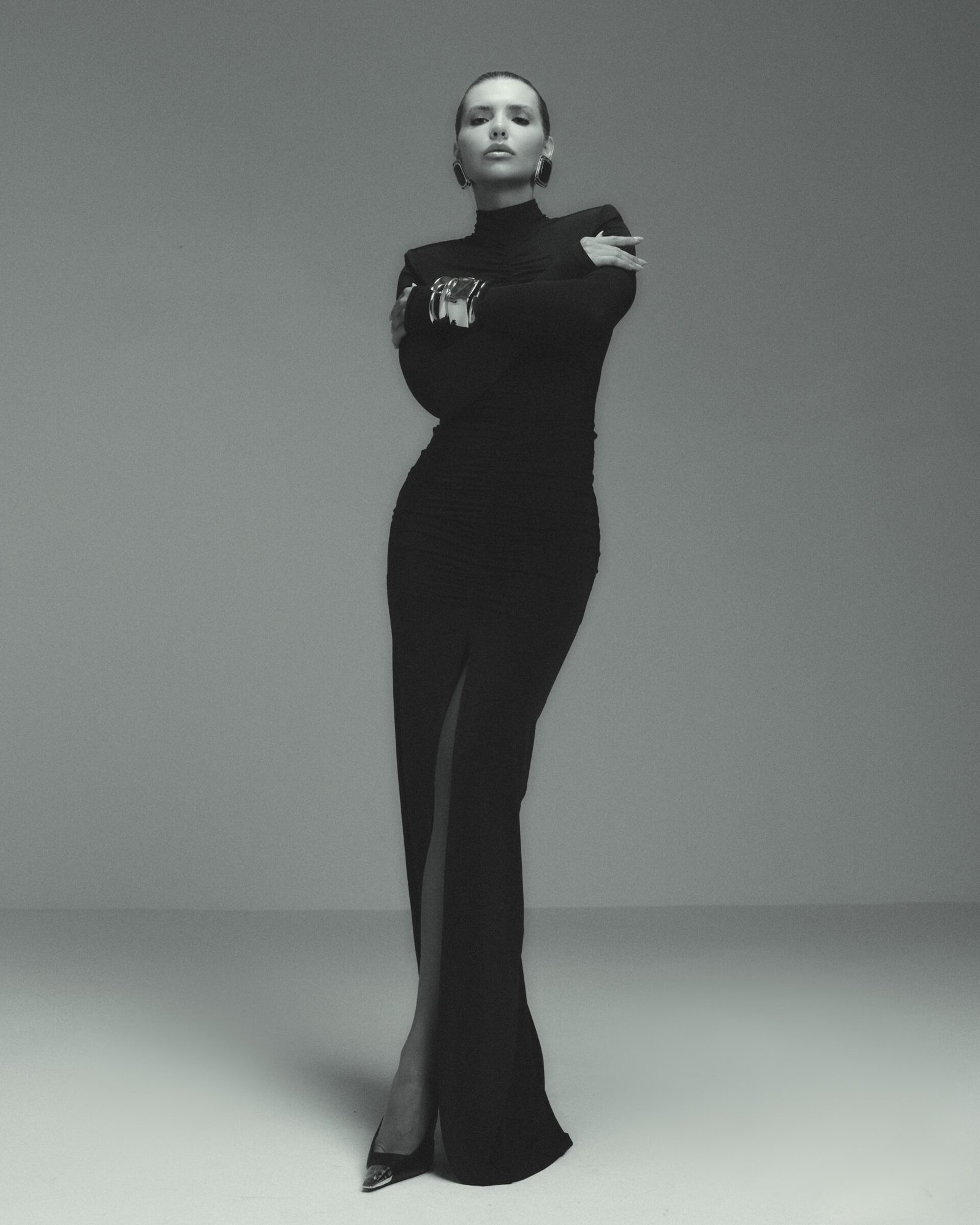 Vestido midi de crepe. Tem modelagem justa com fenda frontal e decote princesa com mangas drapeadas.