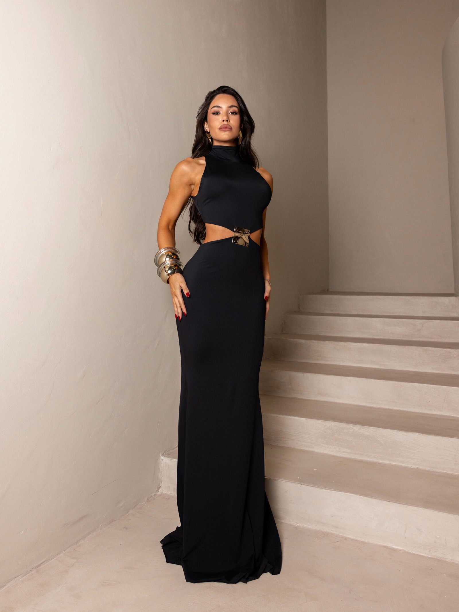 Vestido Longo Fenda Lateral com Recortes Metálicos Um modelo que exala elegância e poder.