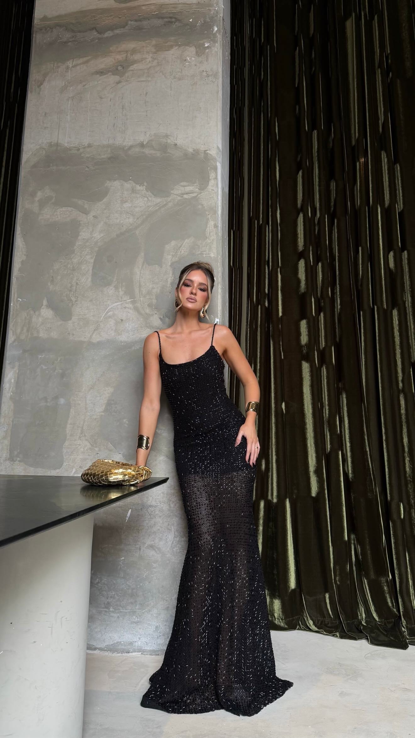 O vestido longo preto perfeito para quem quer um look poderoso, moderno e extremamente sofisticado. Com modelagem reta que acompanha o corpo e abre levemente na barra, ele alonga a silhueta e garante um visual elegante em qualquer ângulo.