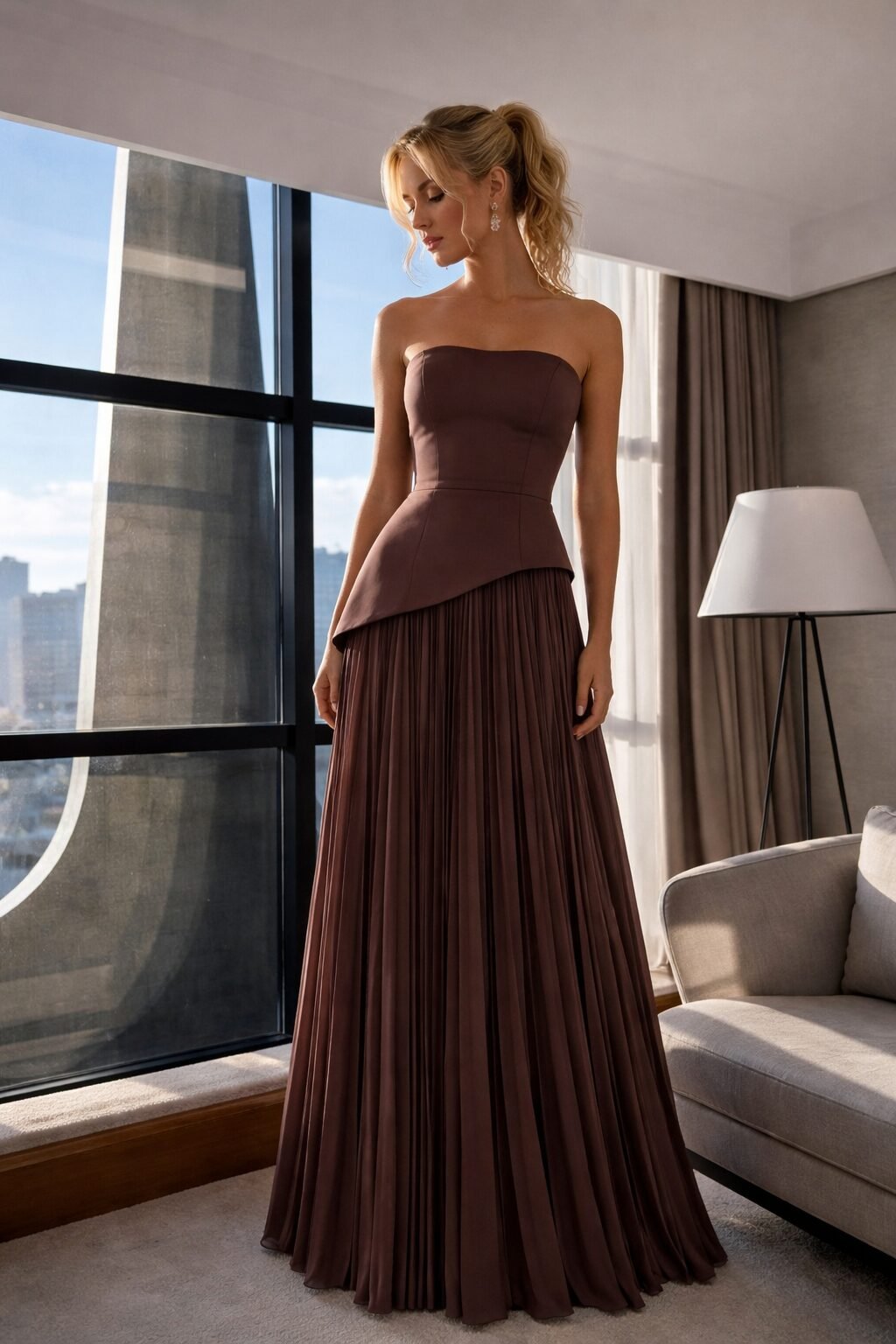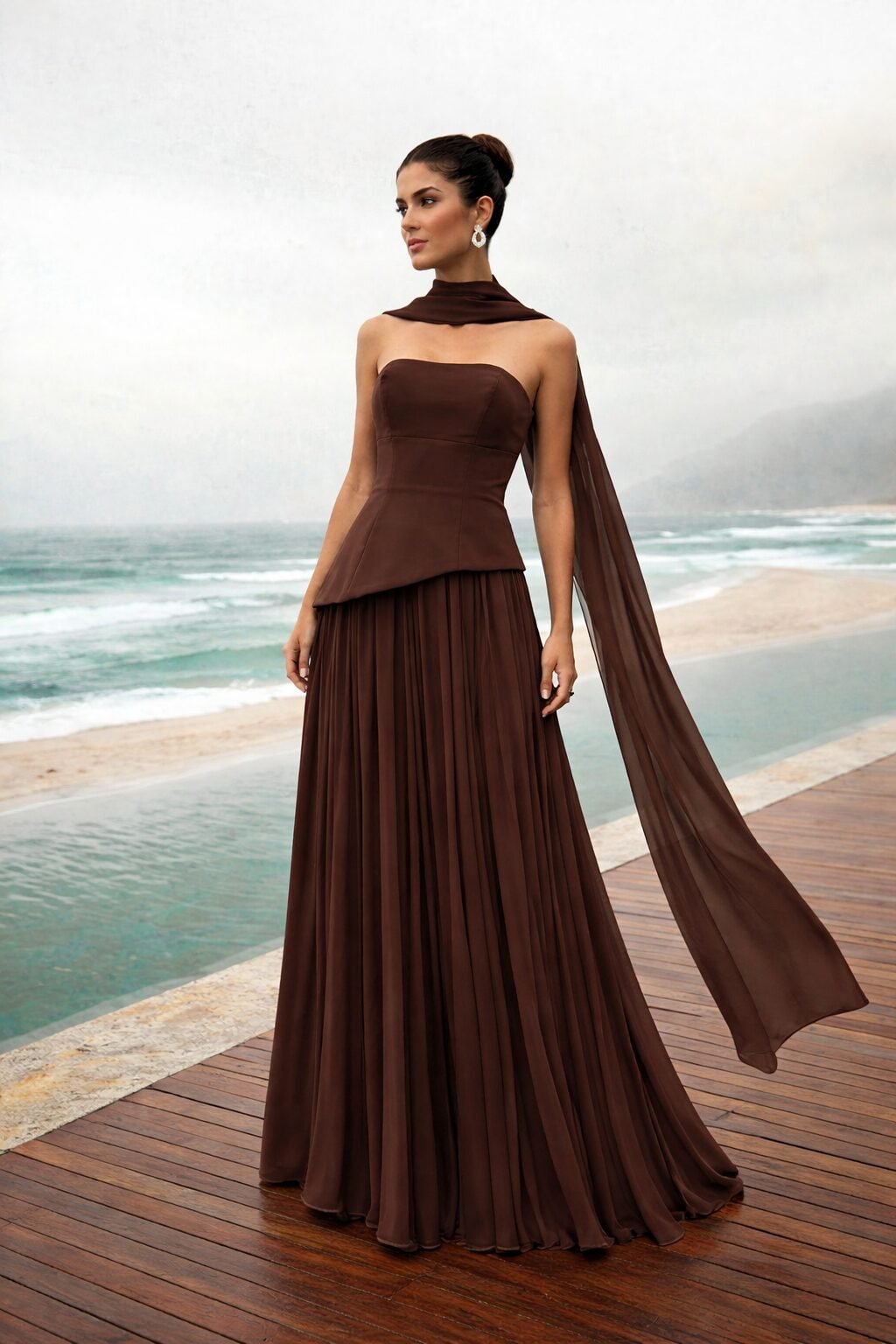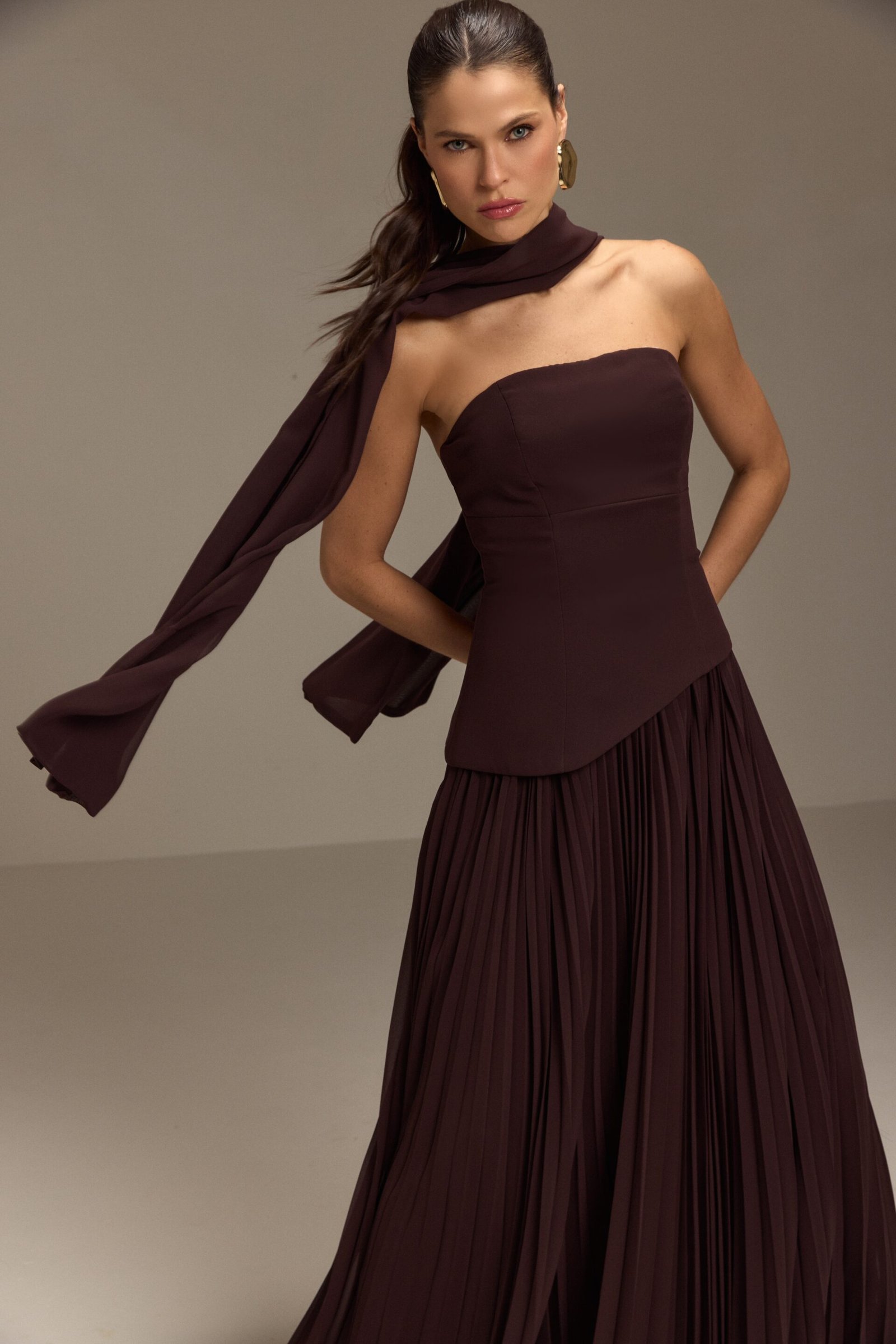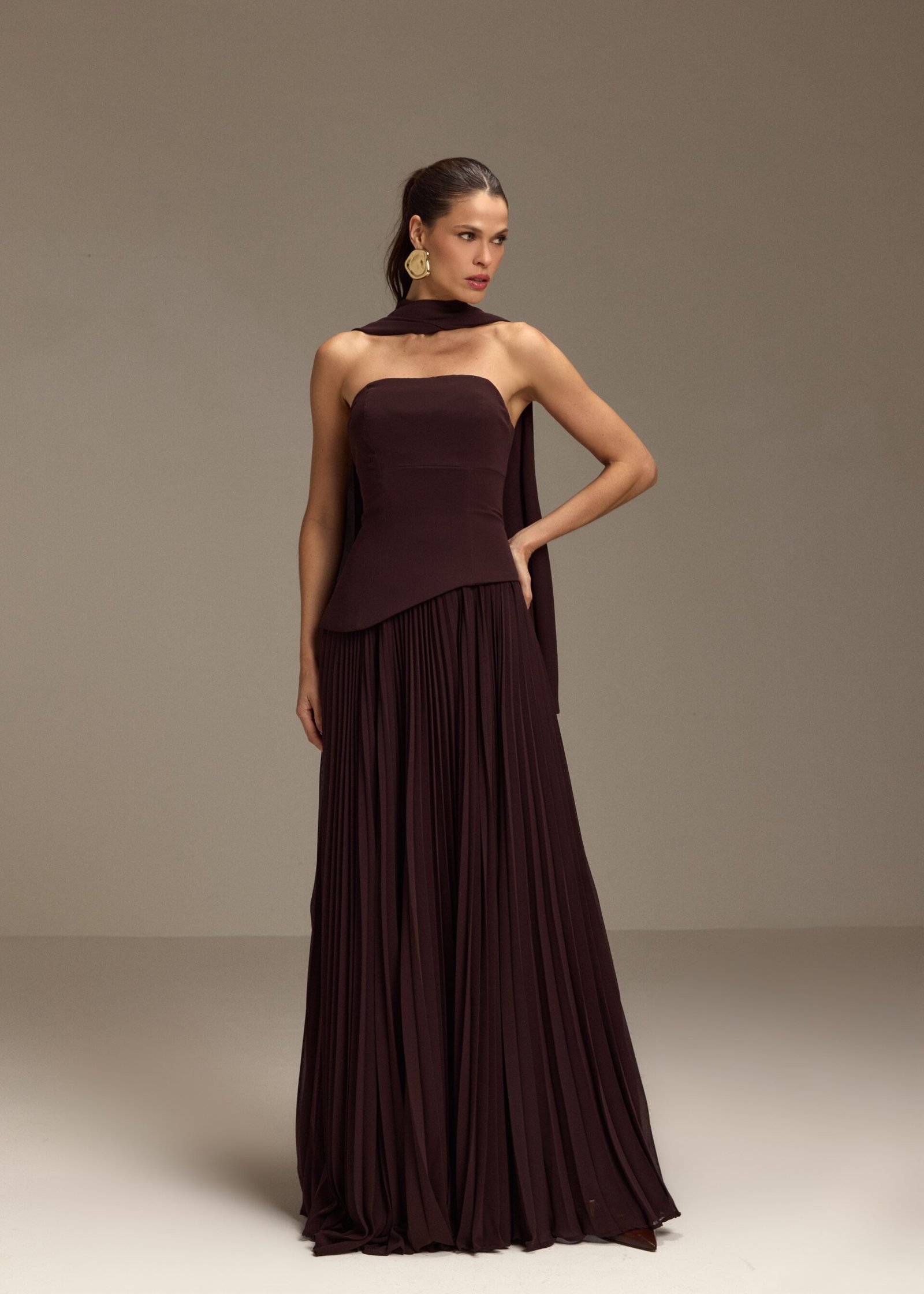 Vestido Longo Plissado com Echarpe – Marrom Café Elegante, sofisticado e com um caimento impecável, o Vestido Longo Plissado com Echarpe é a escolha perfeita para mulheres que buscam um look marcante e atemporal. Em um tom marrom café extremamente refinado, ele traduz modernidade com classe, valorizando a silhueta com leveza e presença.