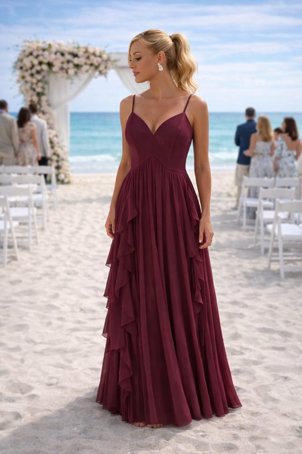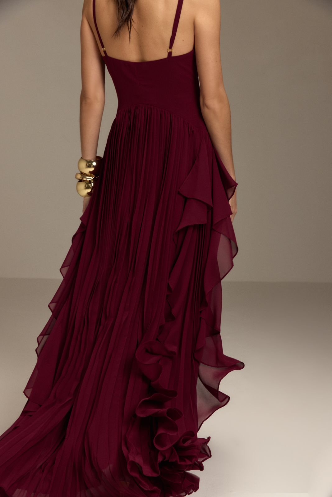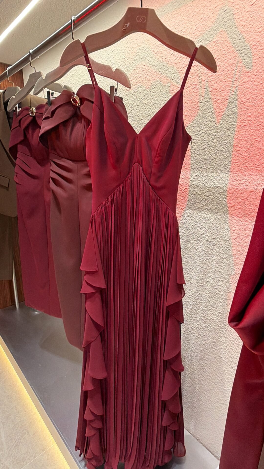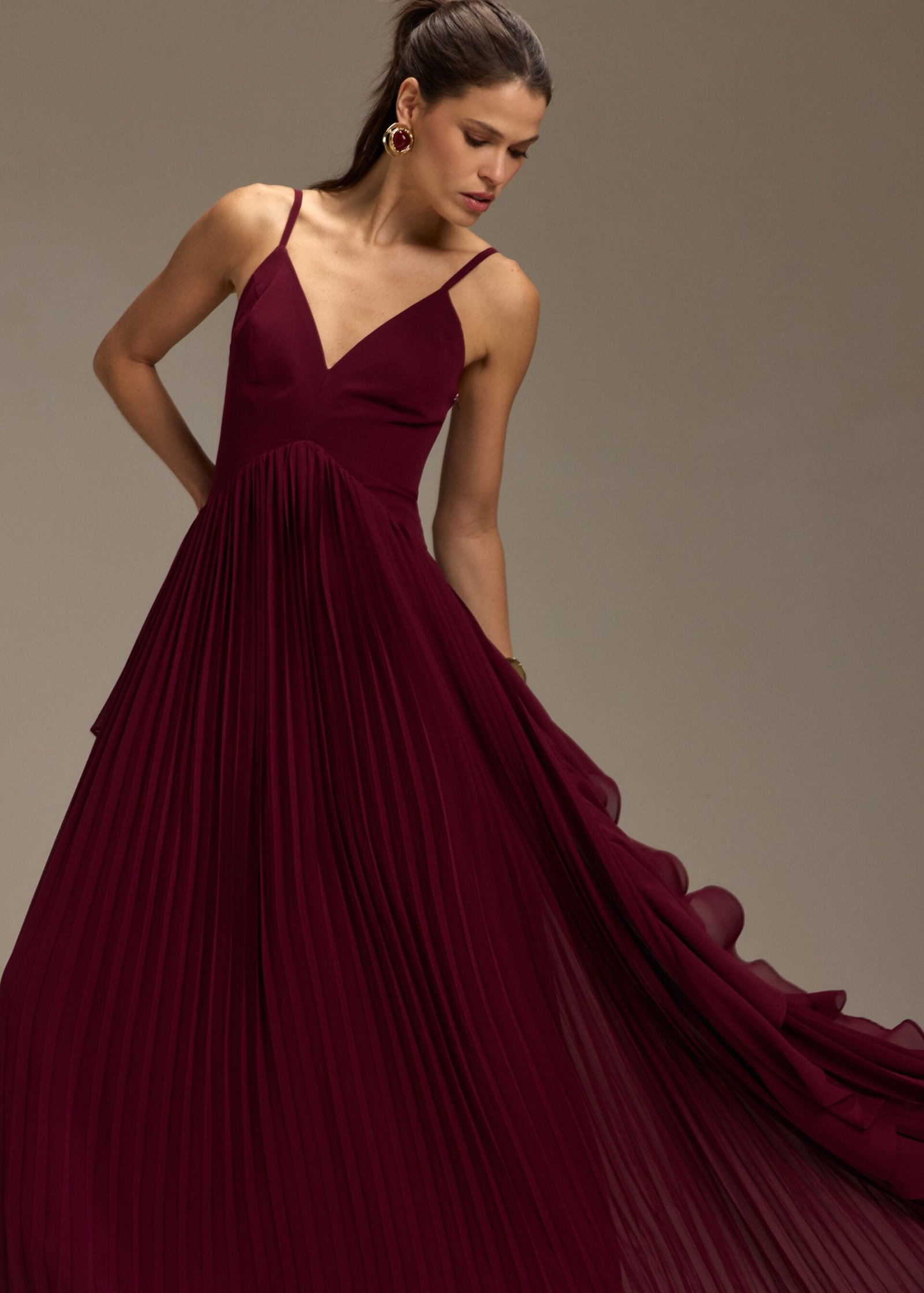 Vestido Longo Marsala Plissado Um vestido que combina leveza, movimento e sofisticação