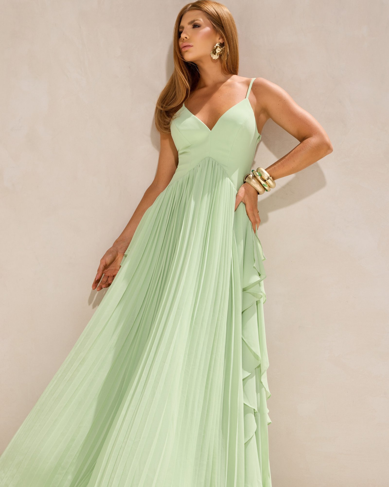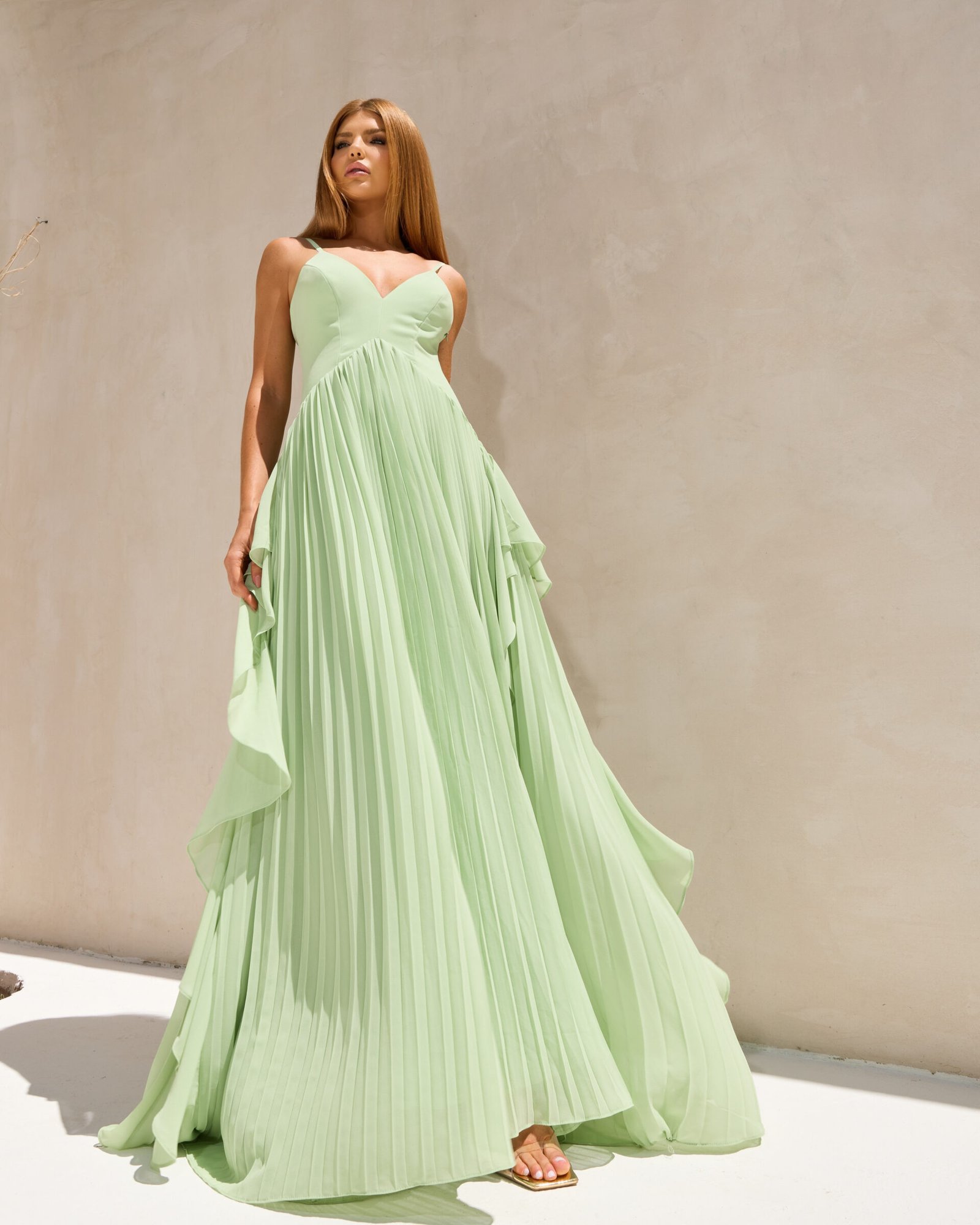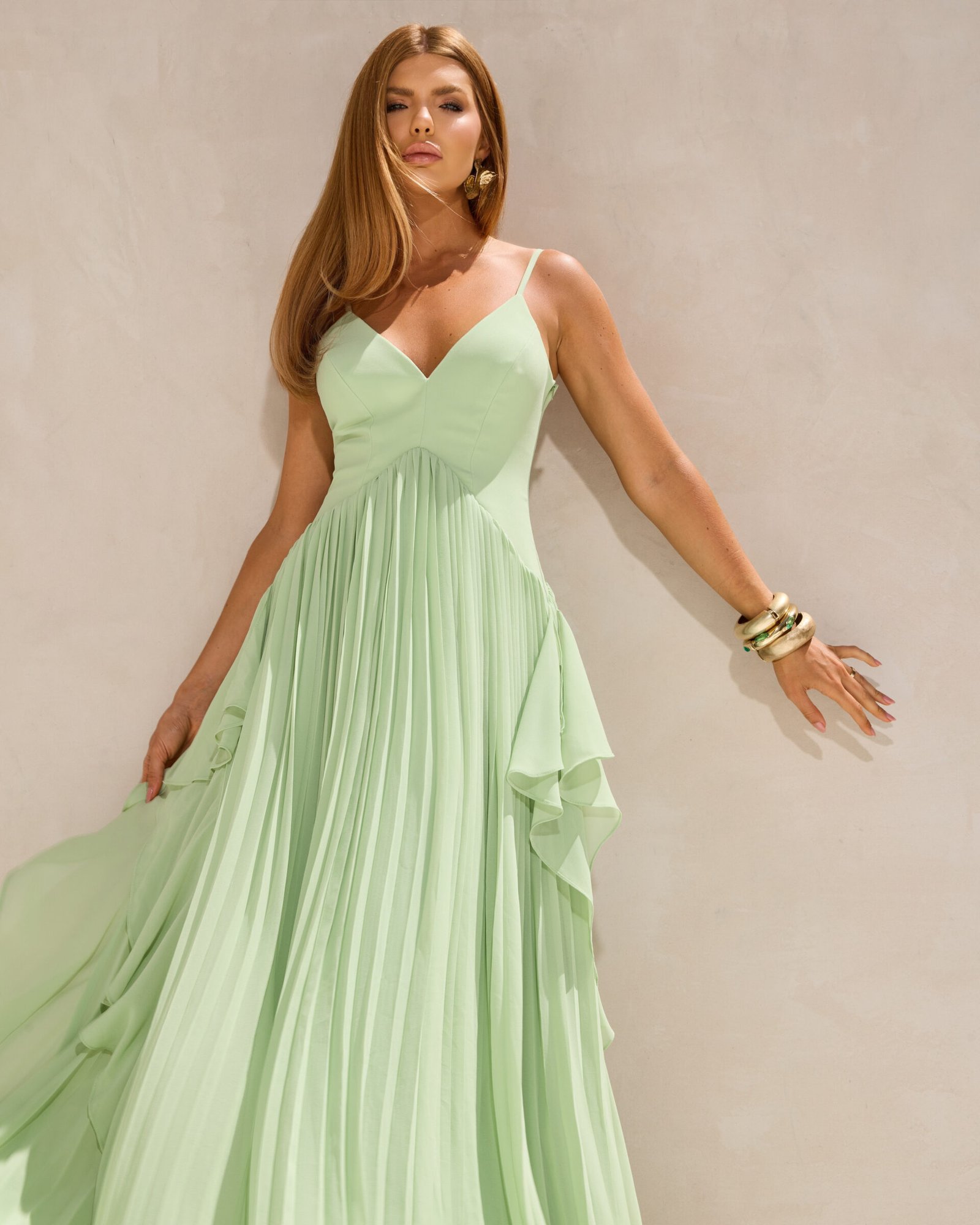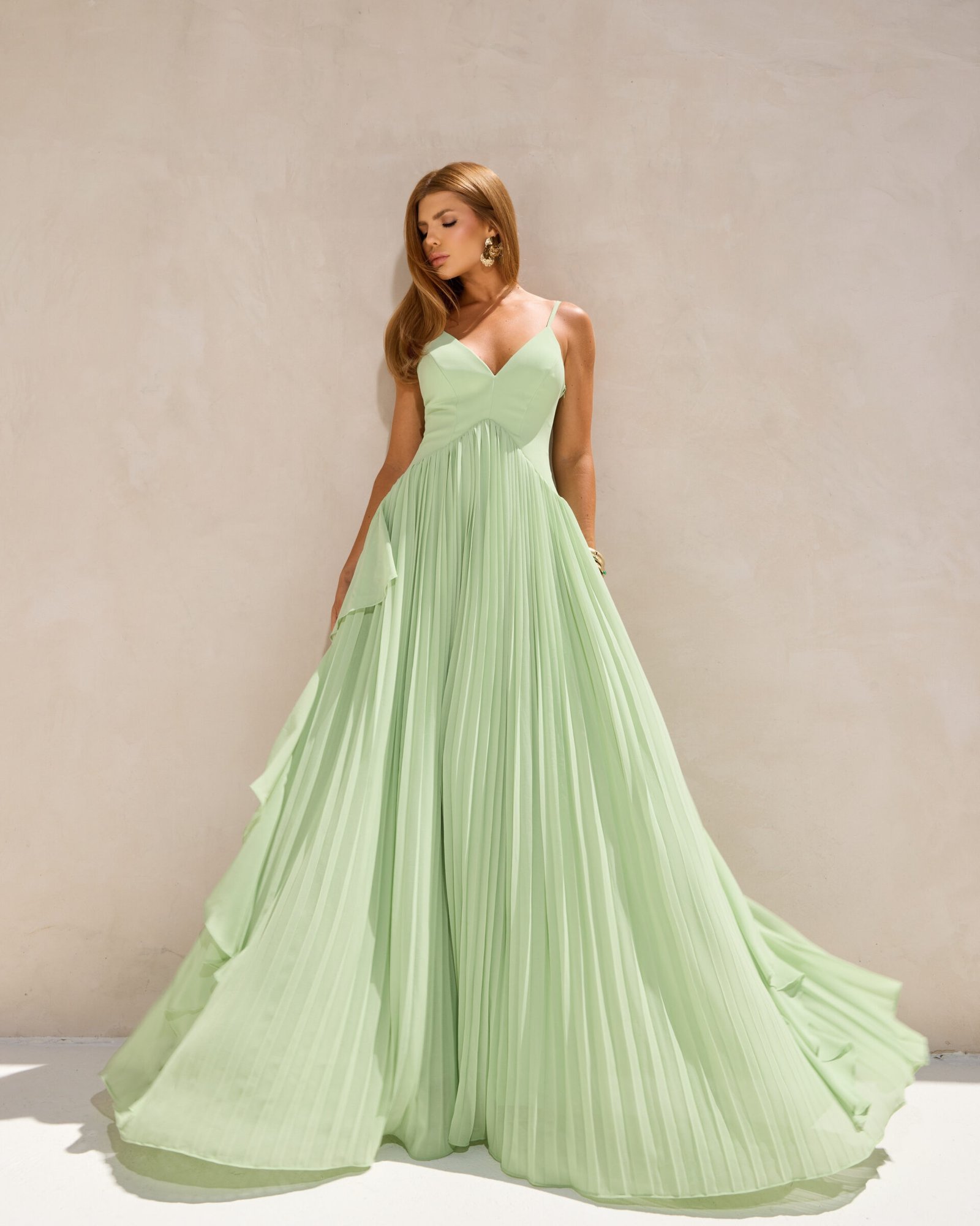 Vestido Longo Verde Pistache Plissado Um vestido que combina leveza, movimento e sofisticação