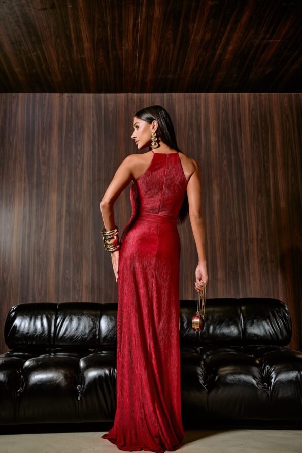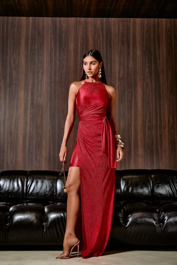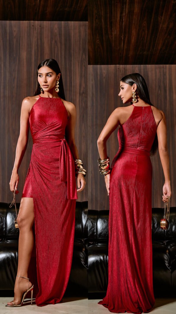 VESTIDO LONGO VERMELHO METALIZADO COM FENDA