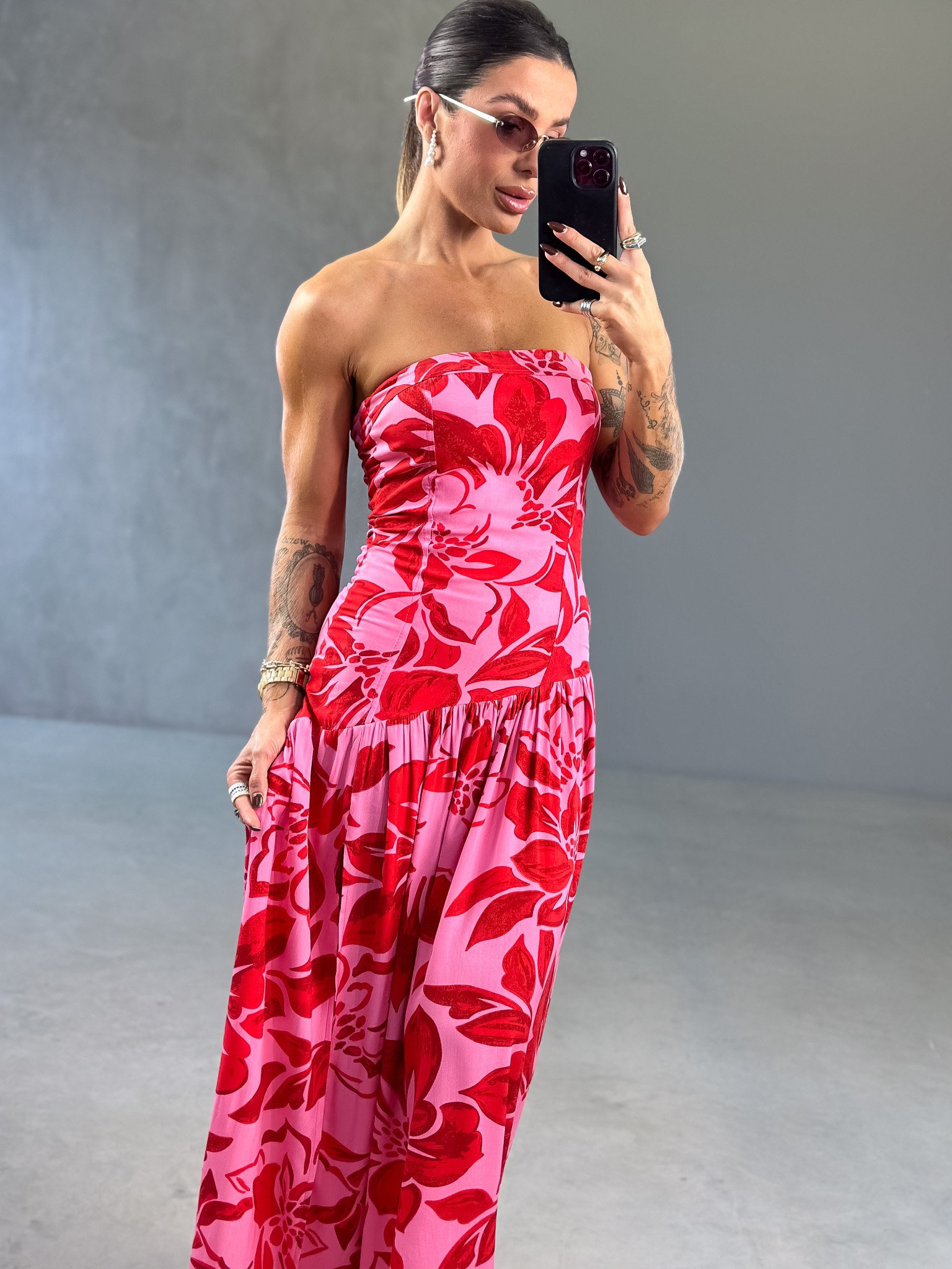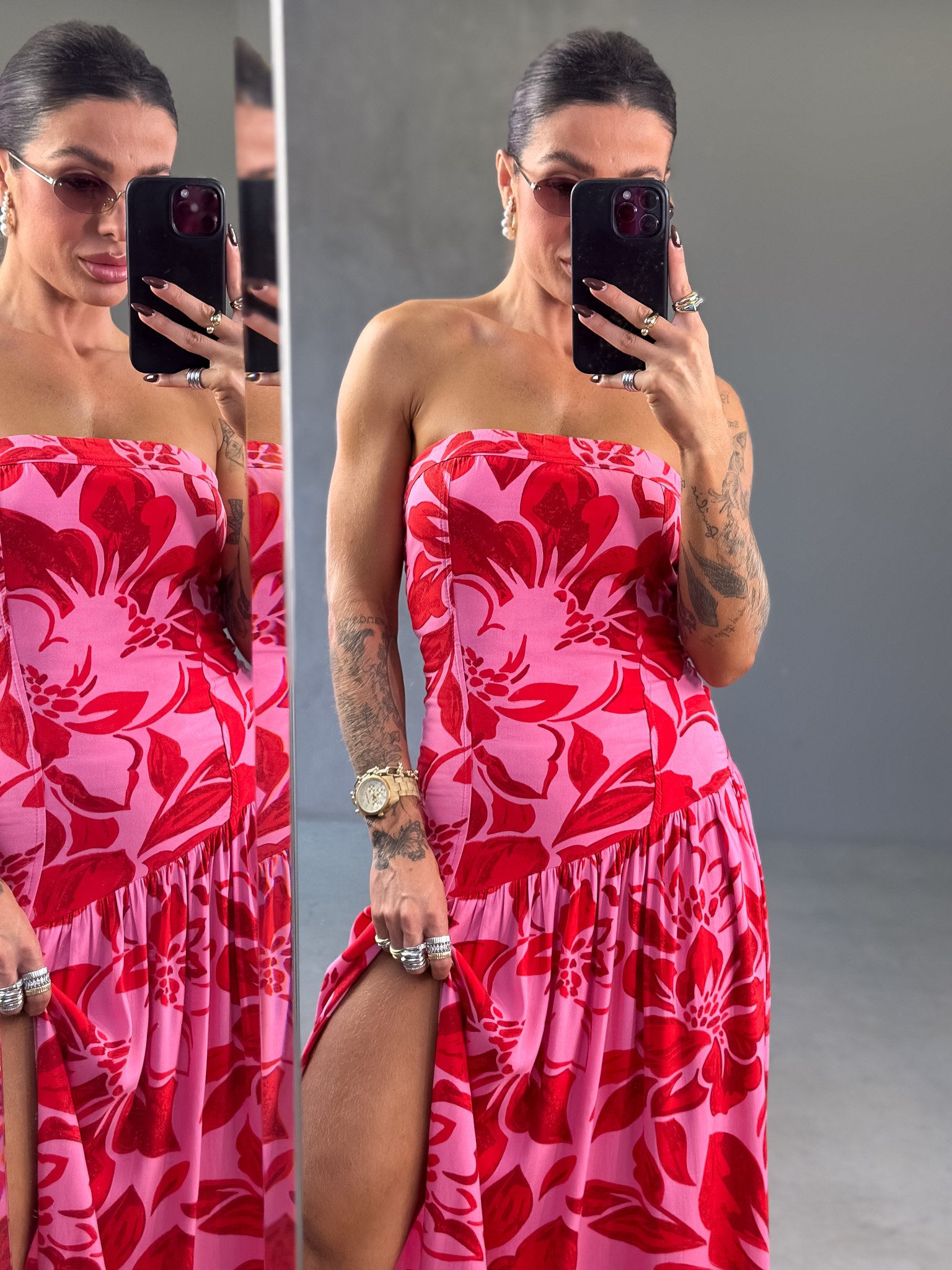 Com estampa floral em tons de pink e vermelho, o modelo tomara que caia valoriza o colo e traz um visual moderno e marcante. Possui fenda lateral que adiciona leveza e sensualidade na medida certa, além do caimento fluido que garante movimento e conforto.