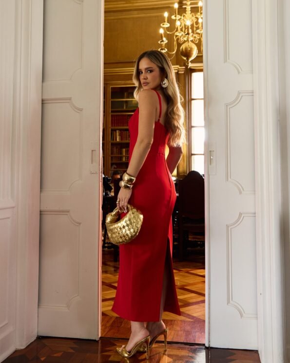 Elegância e poder em cada detalhe. O Vestido Midi Alfaiataria Corset Vermelho é confeccionado em tecido estruturado de alfaiataria premium, que modela o corpo com perfeição e oferece caimento impecável.