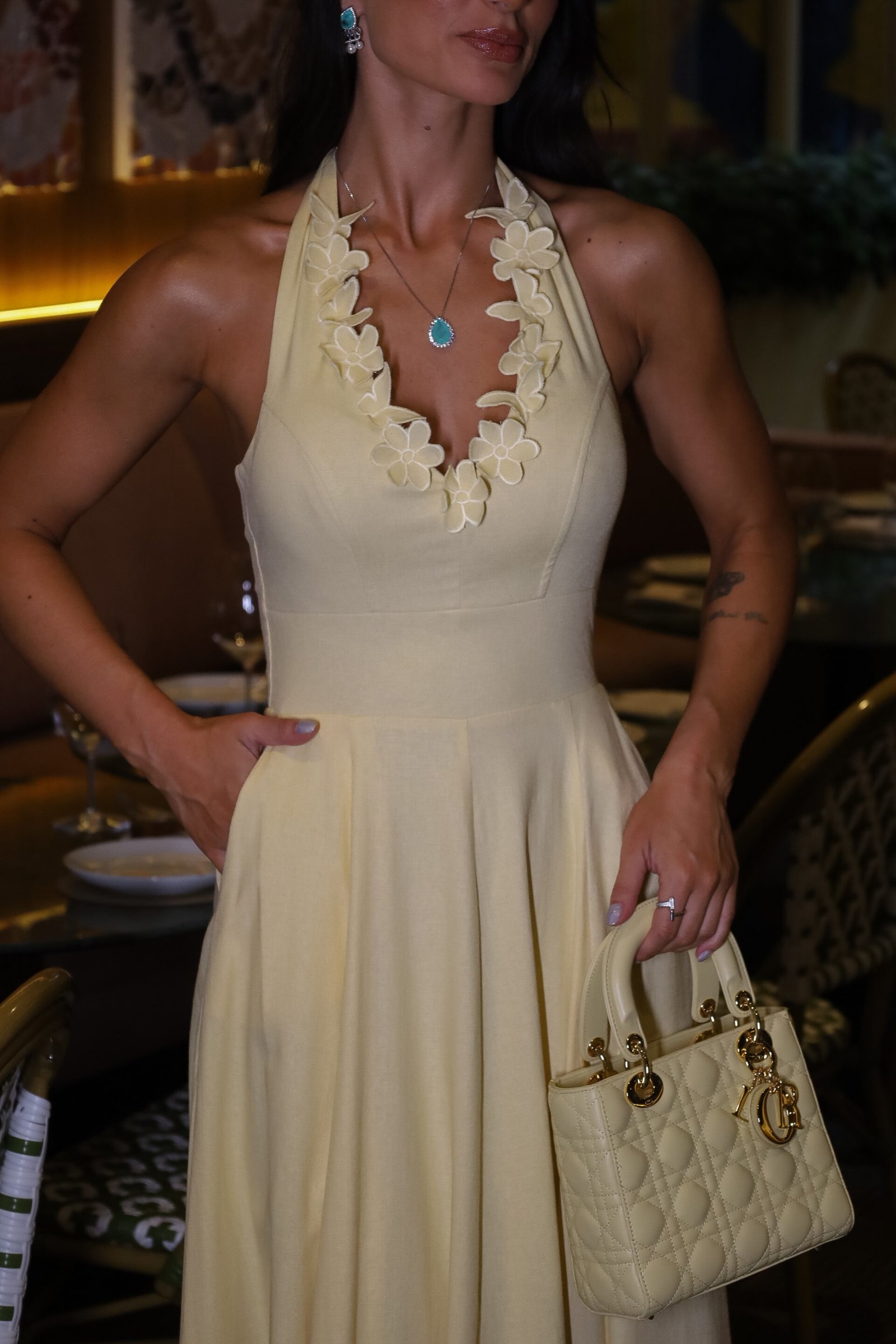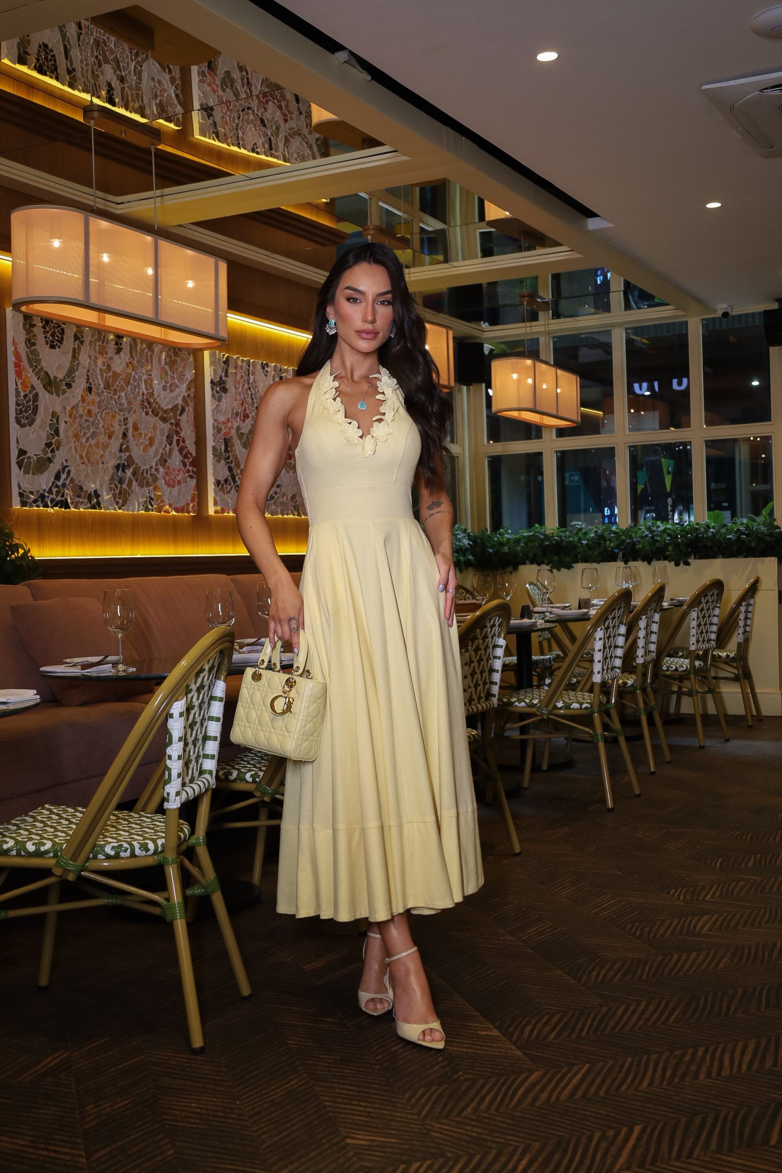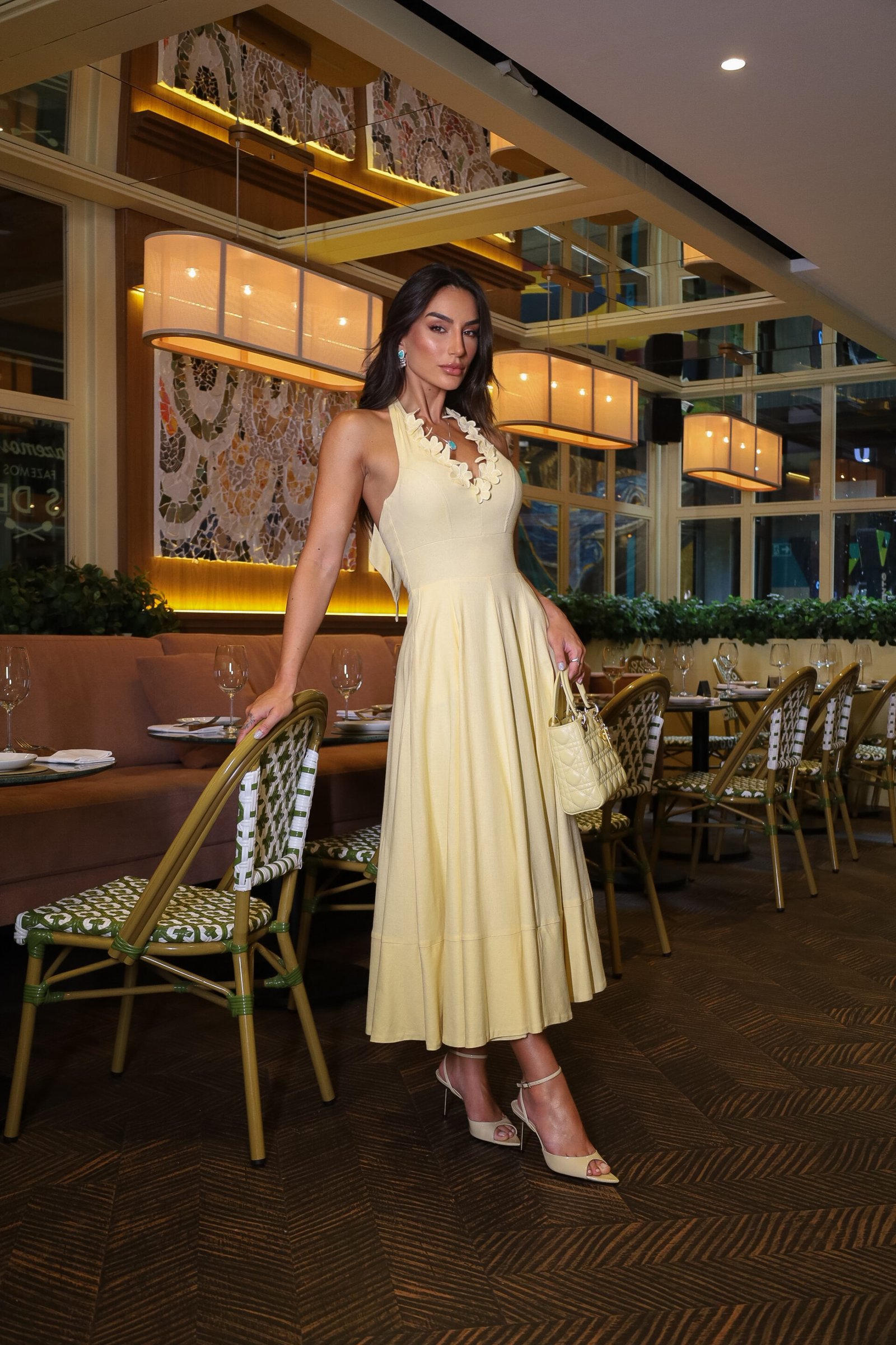 Vestido midi em amarelo manteiga, com decote halter, recorte no busto e saia ampla que garante leveza e movimento. O viscolinho traz frescor e estrutura, acompanhando a tendência dos tons suaves e do romantic summer, em destaque no Verão 2026.