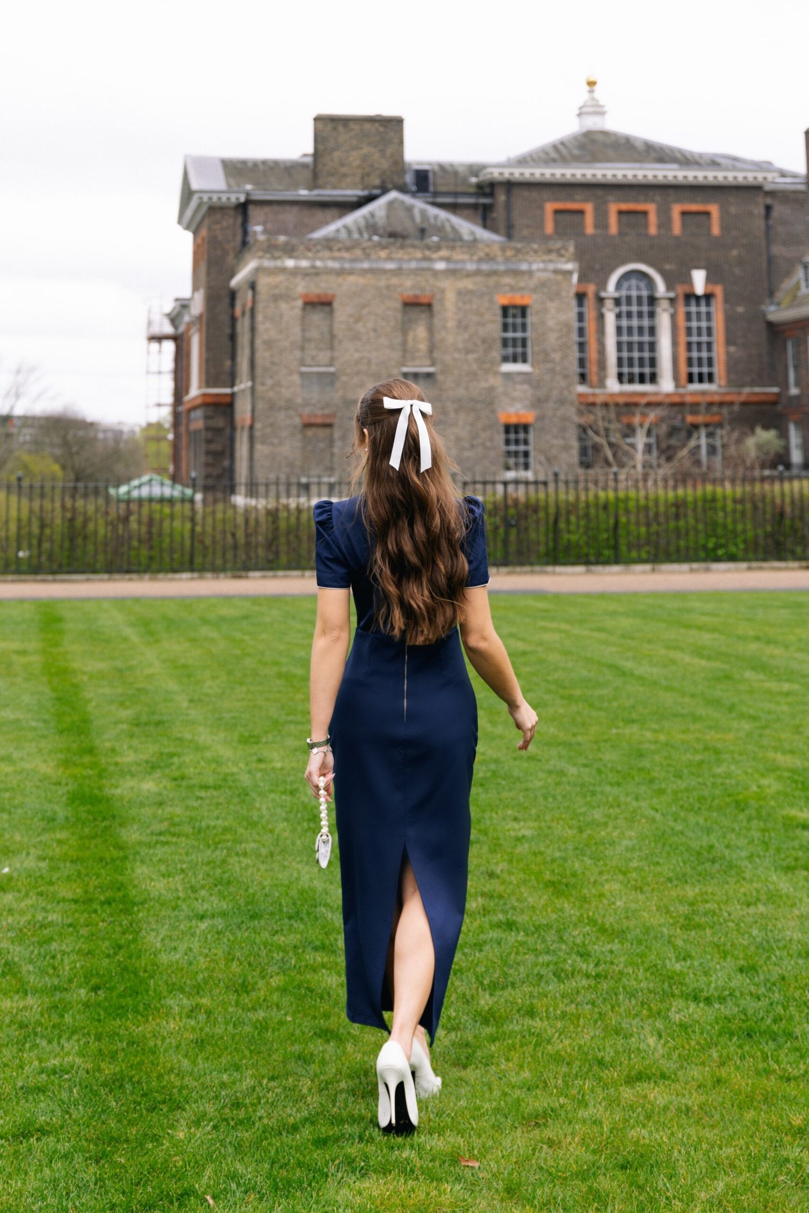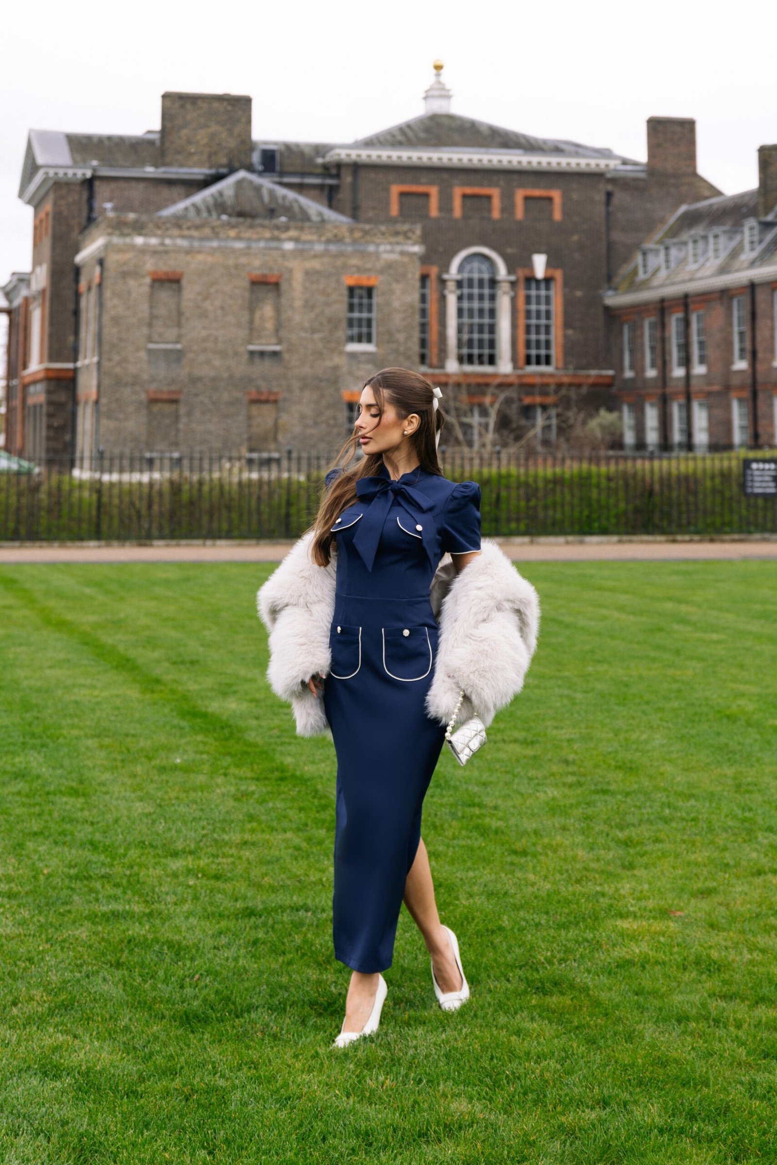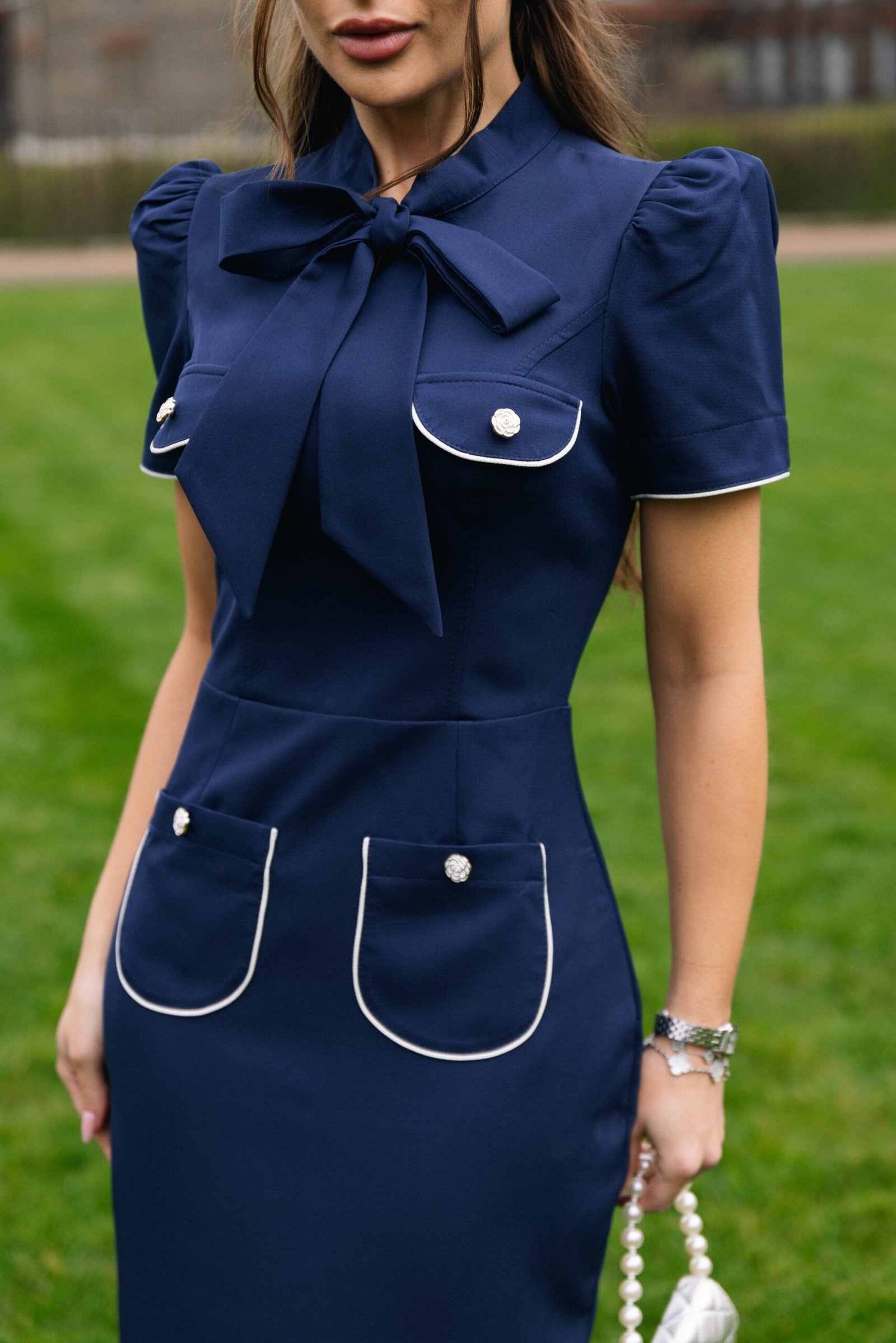 Vestido midi em crepe com elasticidade na cor azul marinho, com modelagem ajustada que valoriza a silhueta. Possui mangas com leve volume, laço aplicado na gola e bolsos frontais com viés contrastantes que destacam o design. A fenda posterior garante mobilidade e adiciona um toque sofisticado à peça. Fechamento posterior por zíper de metal.