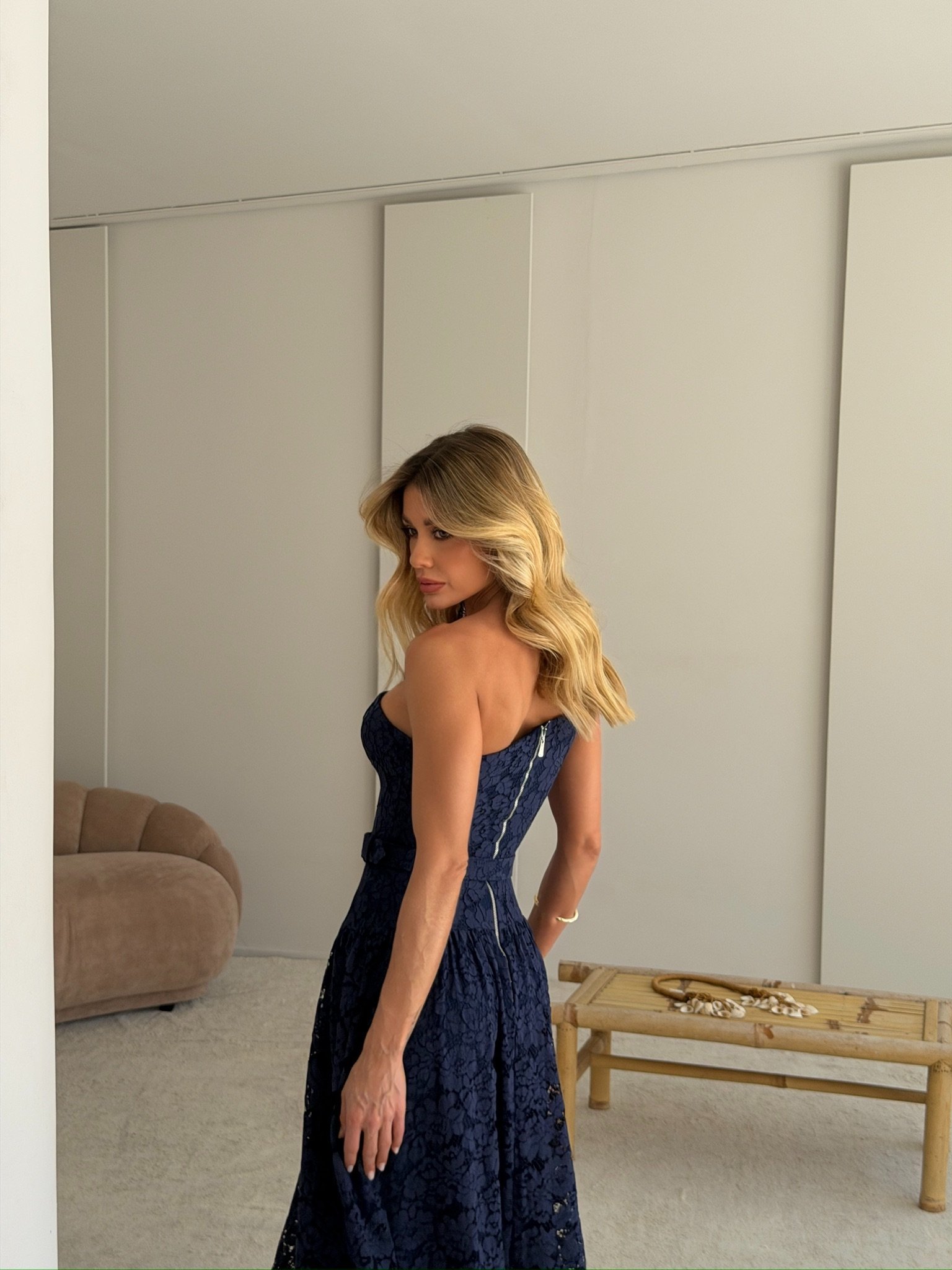 Vestido midi em renda azul marinho, com decote assimétrico, modelagem ajustada no corpo e saia fluida. A aplicação de flor feita artesanalmente no ombro valoriza o design e traz sofisticação à peça. A renda rica em textura acompanha a tendência do romantic couture, em destaque no Verão 2026. Um vestido elegante e marcante, ideal para eventos especiais e ocasiões que pedem um visual refinado. Zíper de metal nas costasVestido midi em off white, com alças finas, recortes laterais e bordados contrastantes que valorizam a silhueta. O viscolinho traz leveza e caimento fluido, alinhado à tendência resort chic e ao romantic summer, destaque no Verão 2026.