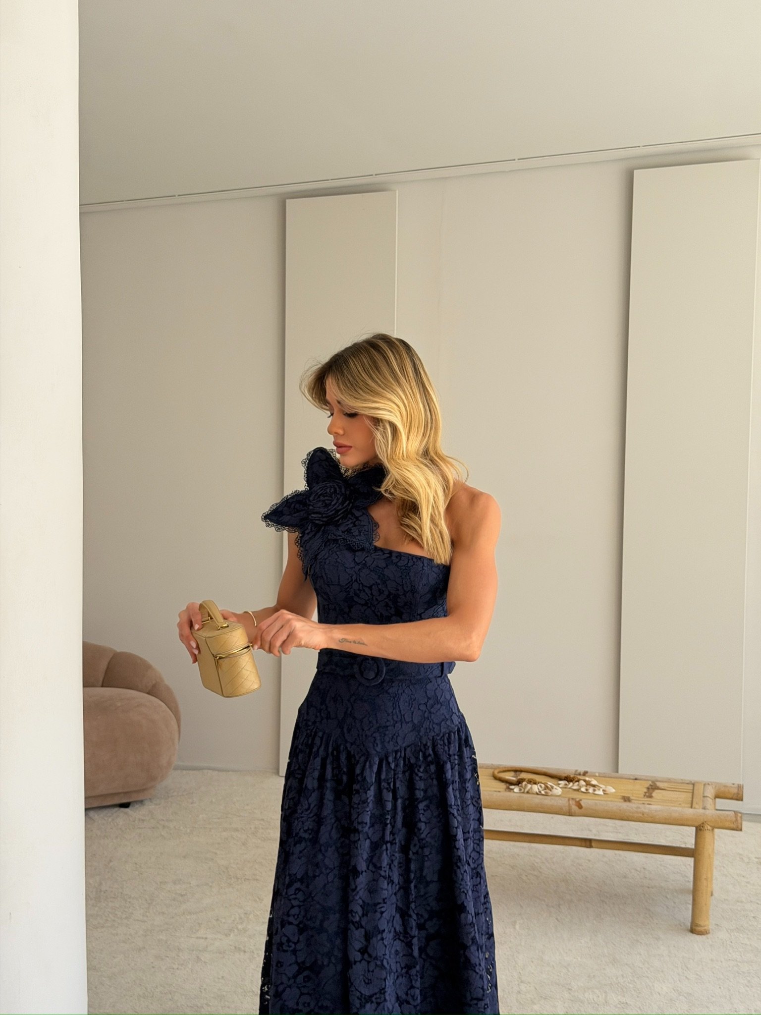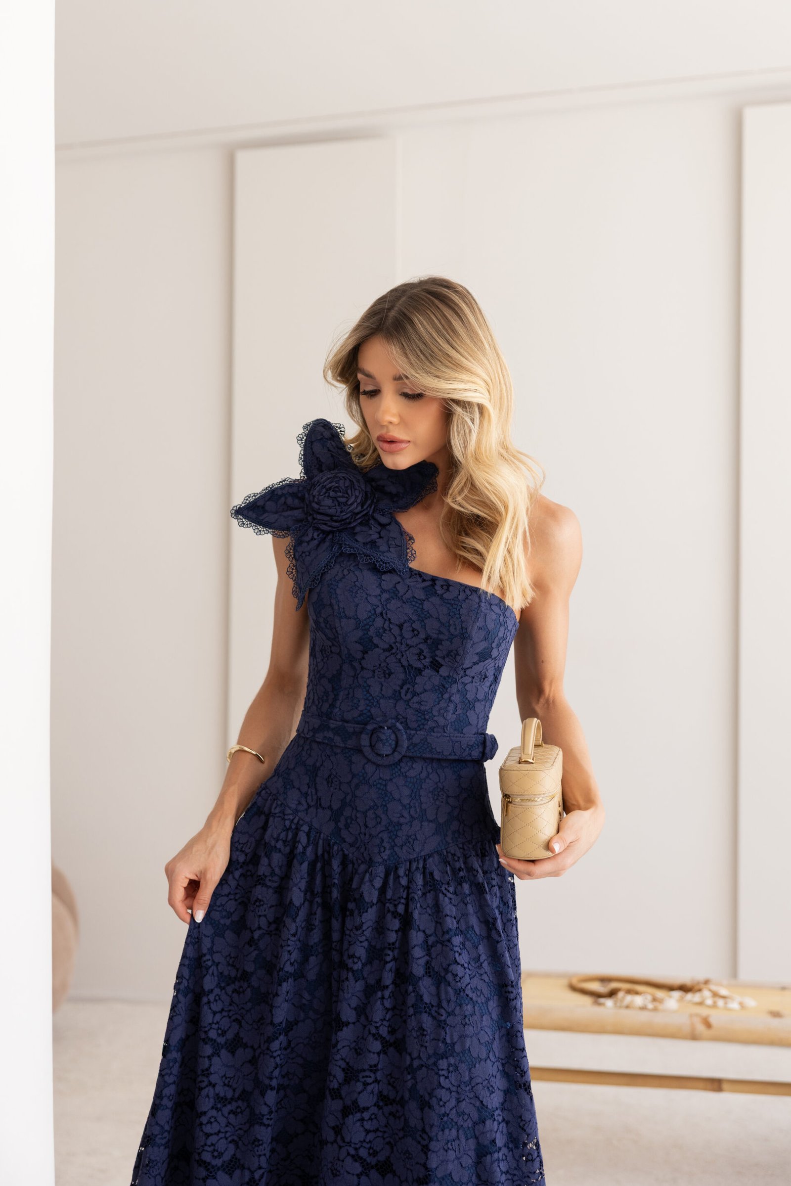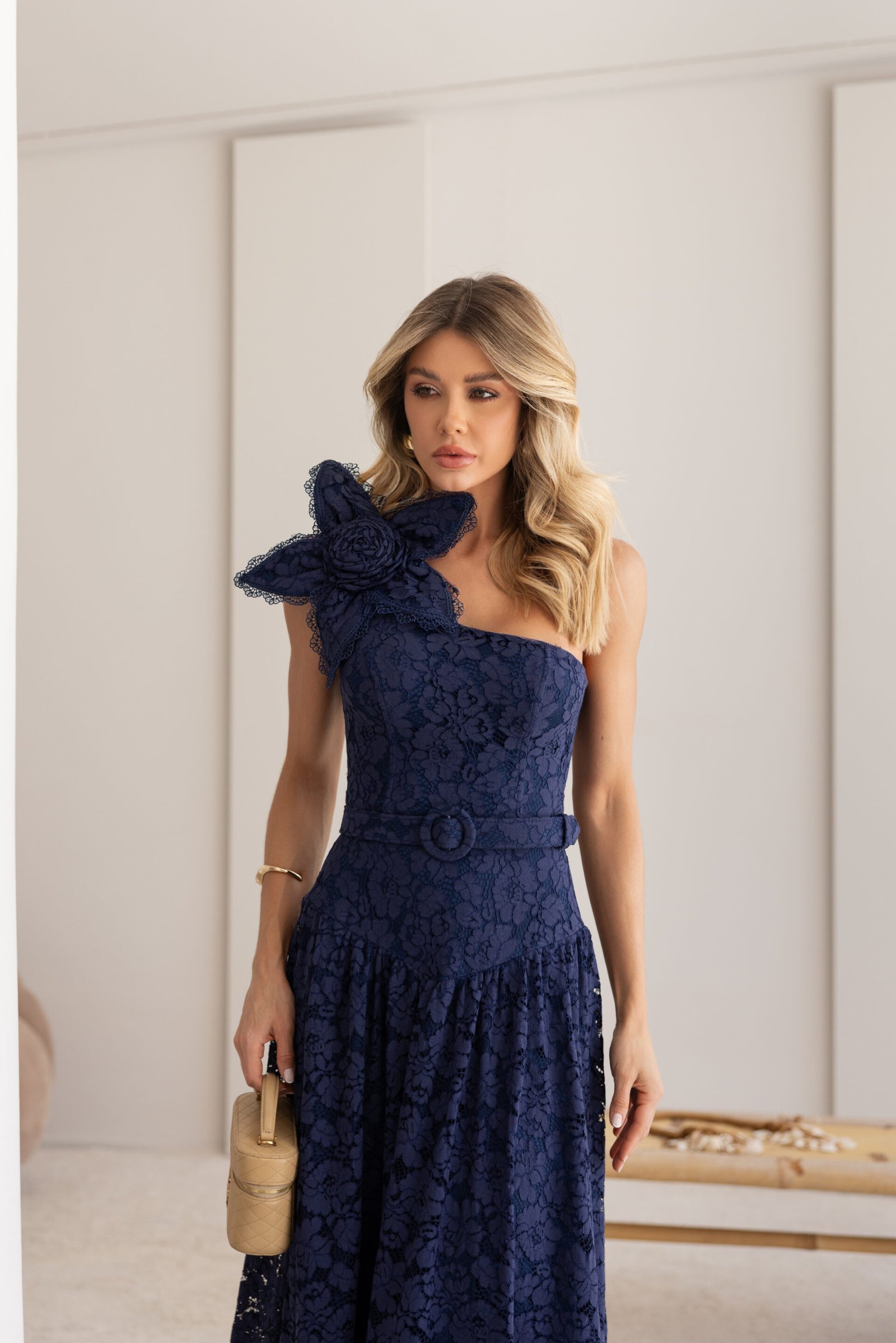 Vestido midi em renda azul marinho, com decote assimétrico, modelagem ajustada no corpo e saia fluida. A aplicação de flor feita artesanalmente no ombro valoriza o design e traz sofisticação à peça.