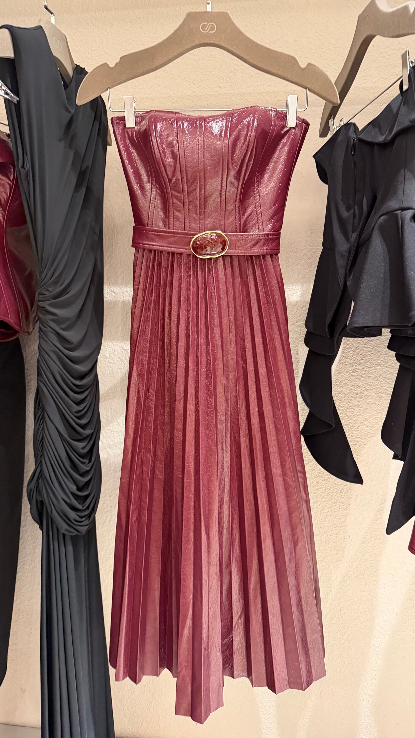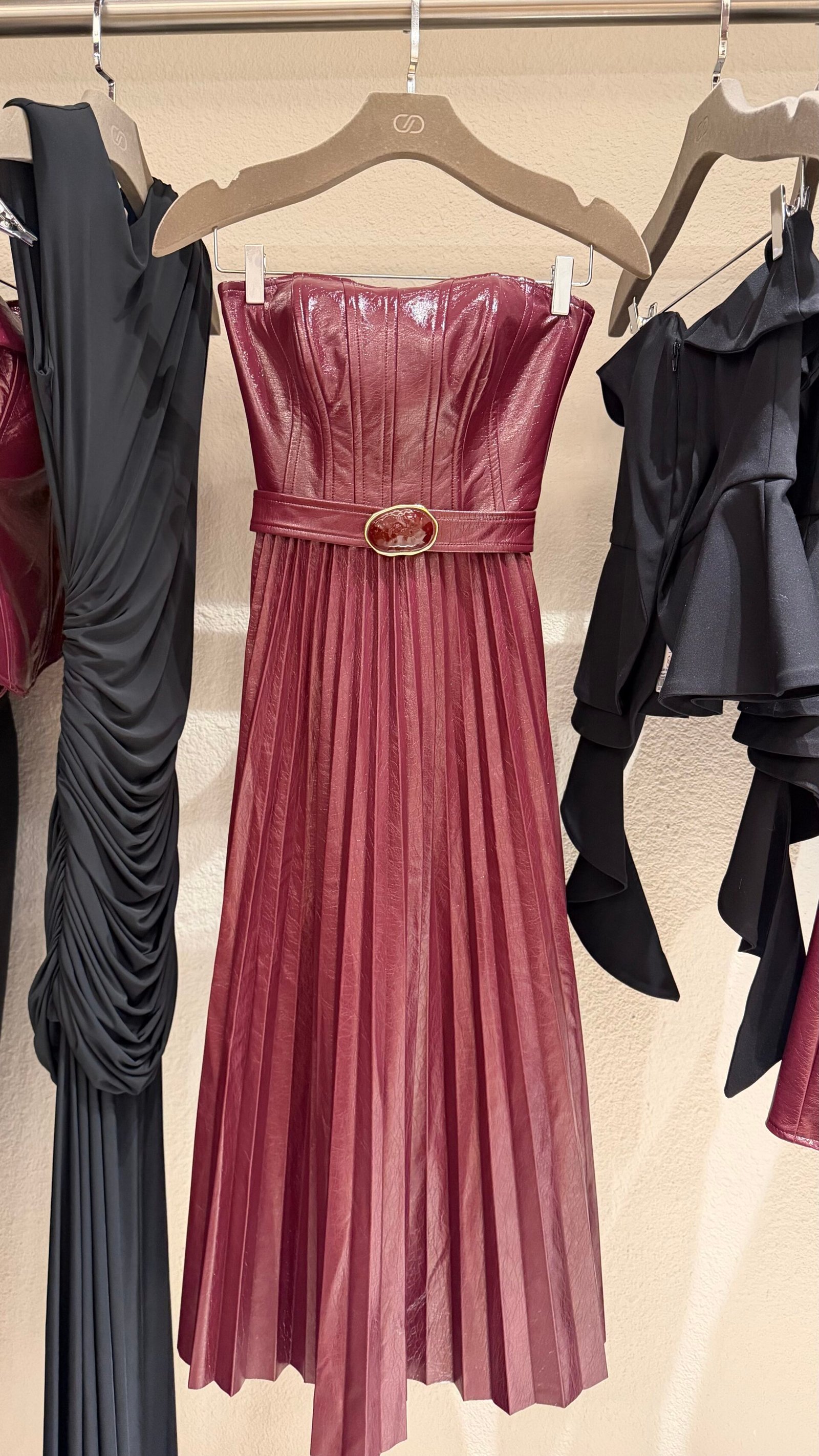 Vestido Midi Plissado Tomara que Caia – Marrom & Marsala | Alfaiataria Premium Um vestido elegante e impactante, que une estrutura e fluidez na medida perfeita.