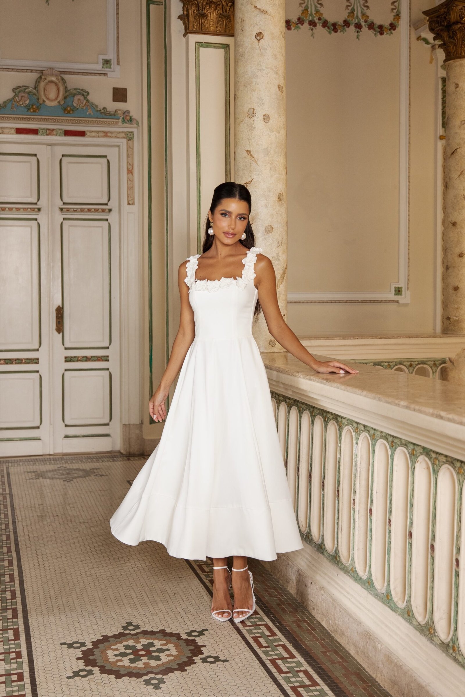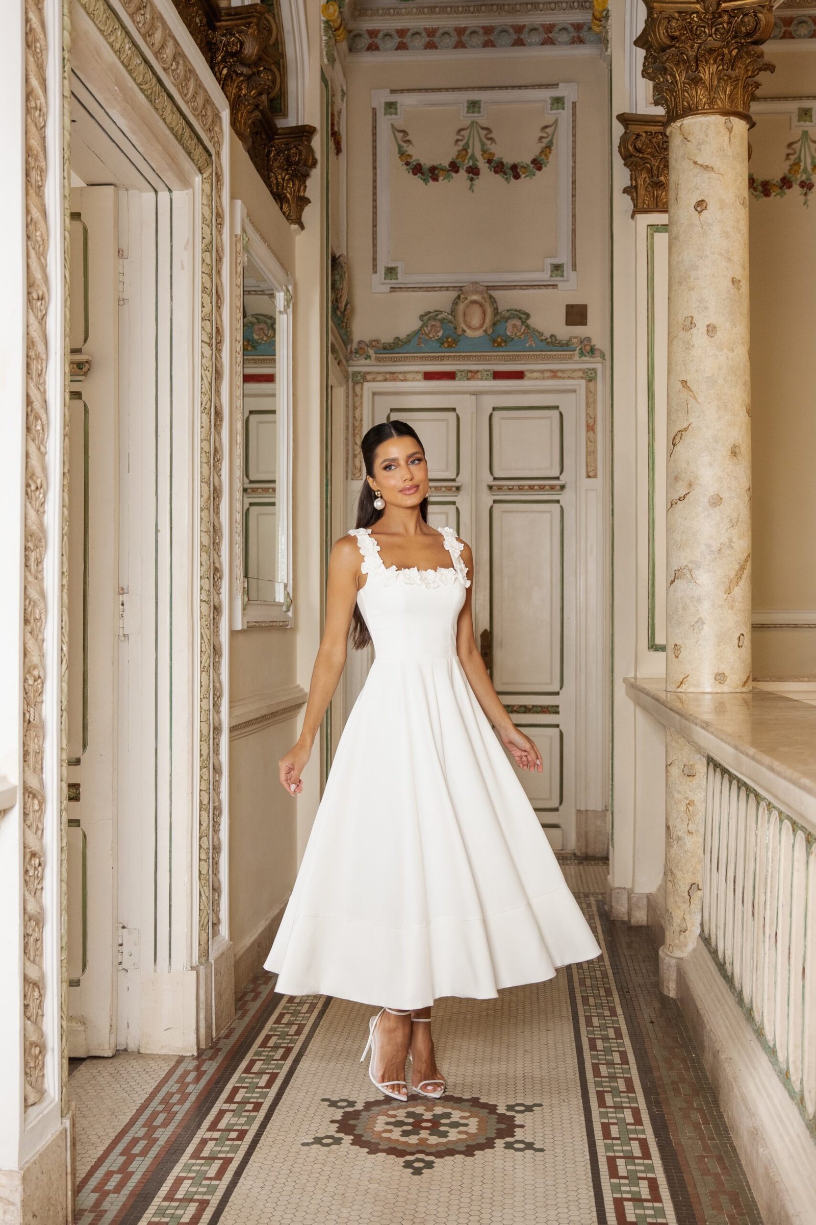 Vestido midi em crepe branco com modelagem acinturada e saia evasê de caimento elegante.