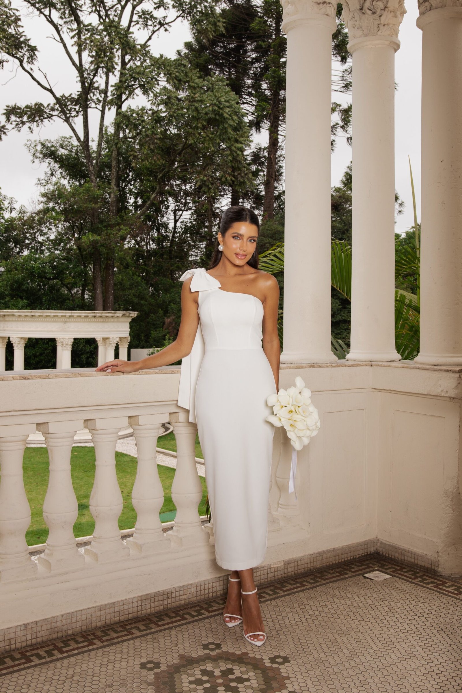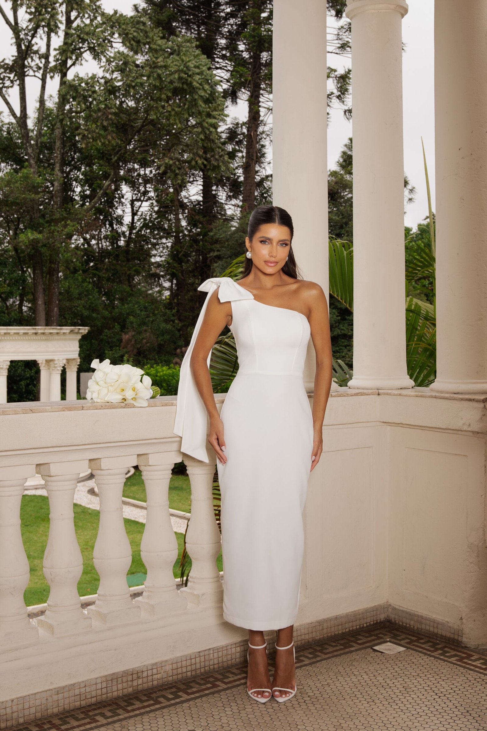 Vestido midi em crepe alfaiataria off white com modelagem ajustada que valoriza a silhueta. O busto estruturado apresenta decote assimétrico de um ombro só com laço aplicado e faixa longa que cria movimento elegante à peça.