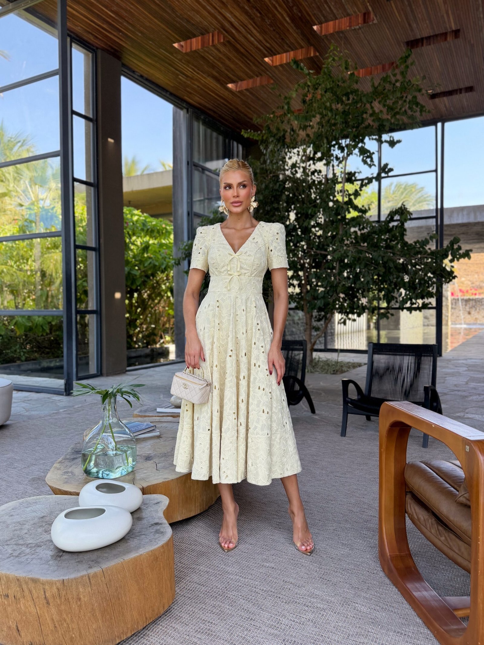 Vestido com detalhes em flor no busto, todo drapeado um charme.