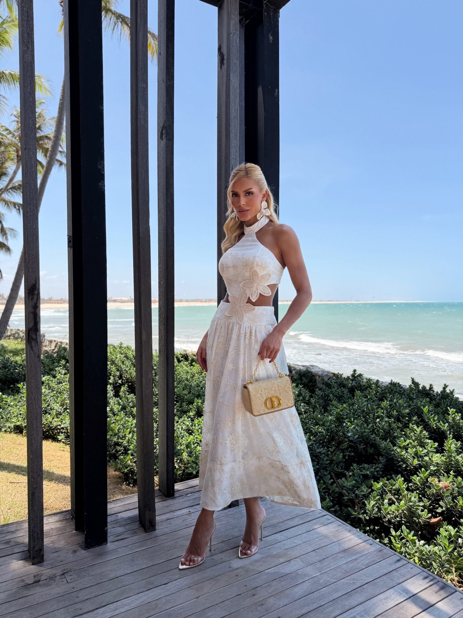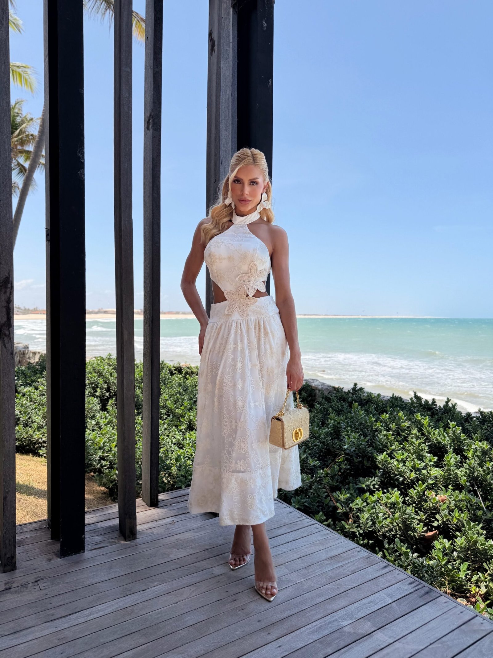 O destaque fica por conta dos recortes laterais com aplicações de flores em renda, criando um visual leve e feminino. O decote halter com amarração nas costas valoriza o colo e garante um toque de sensualidade elegante, enquanto a saia fluida com caimento impecável completa o visual com charme e movimento.