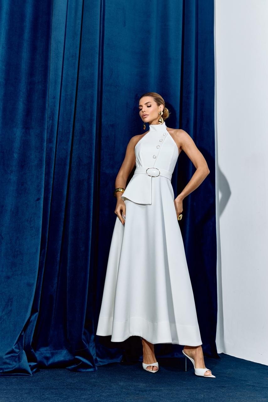 Vestido longo de renda off-white com forro no mesmo tom. Tem recortes e