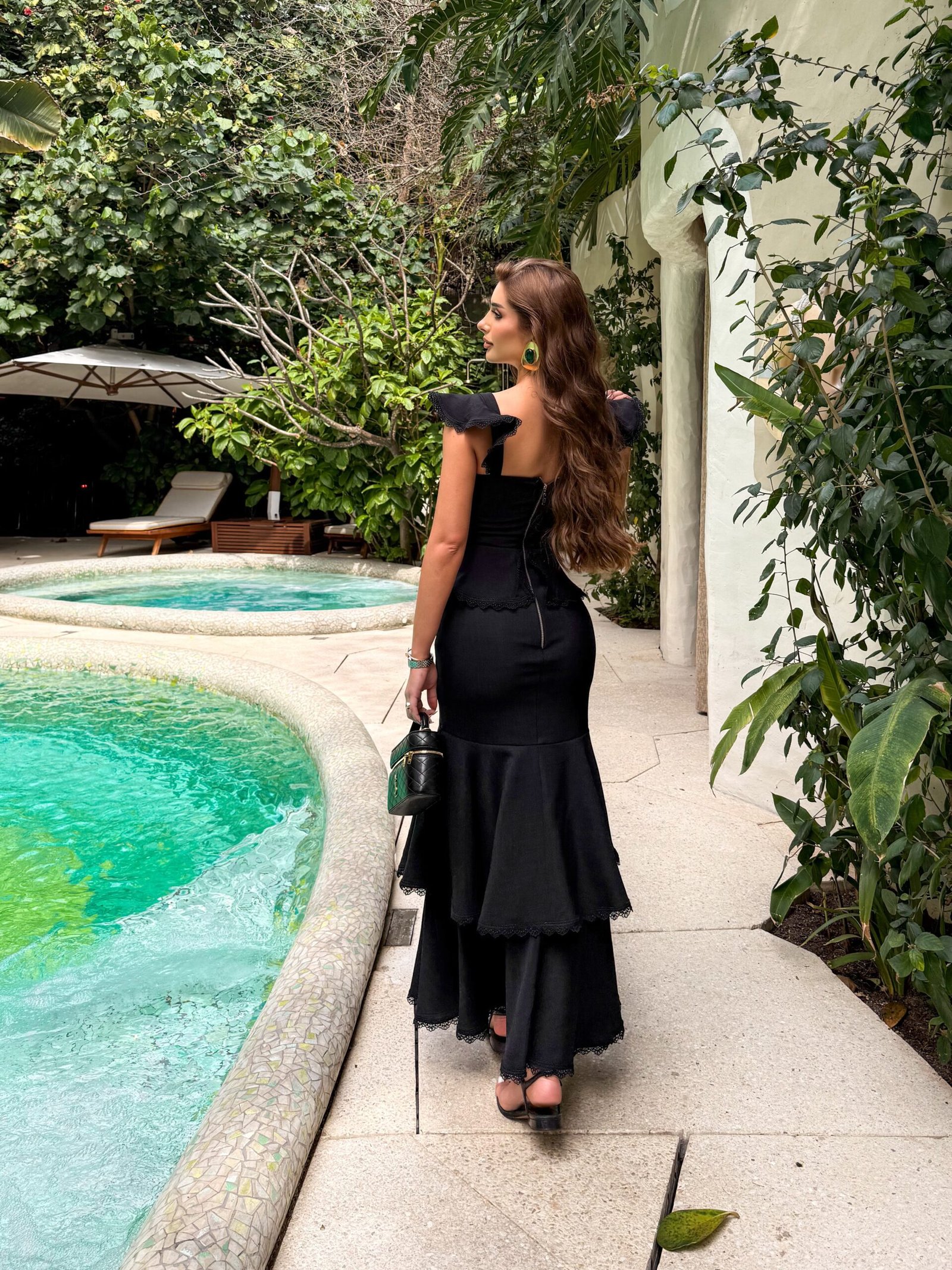 O Vestido Fresh Ravena é um clássico elegante em preto. Confeccionado em crepe ravena estruturado, possui decote em V com acabamento em renda delicada e alças médias com babado, que adicionam feminilidade à peça.