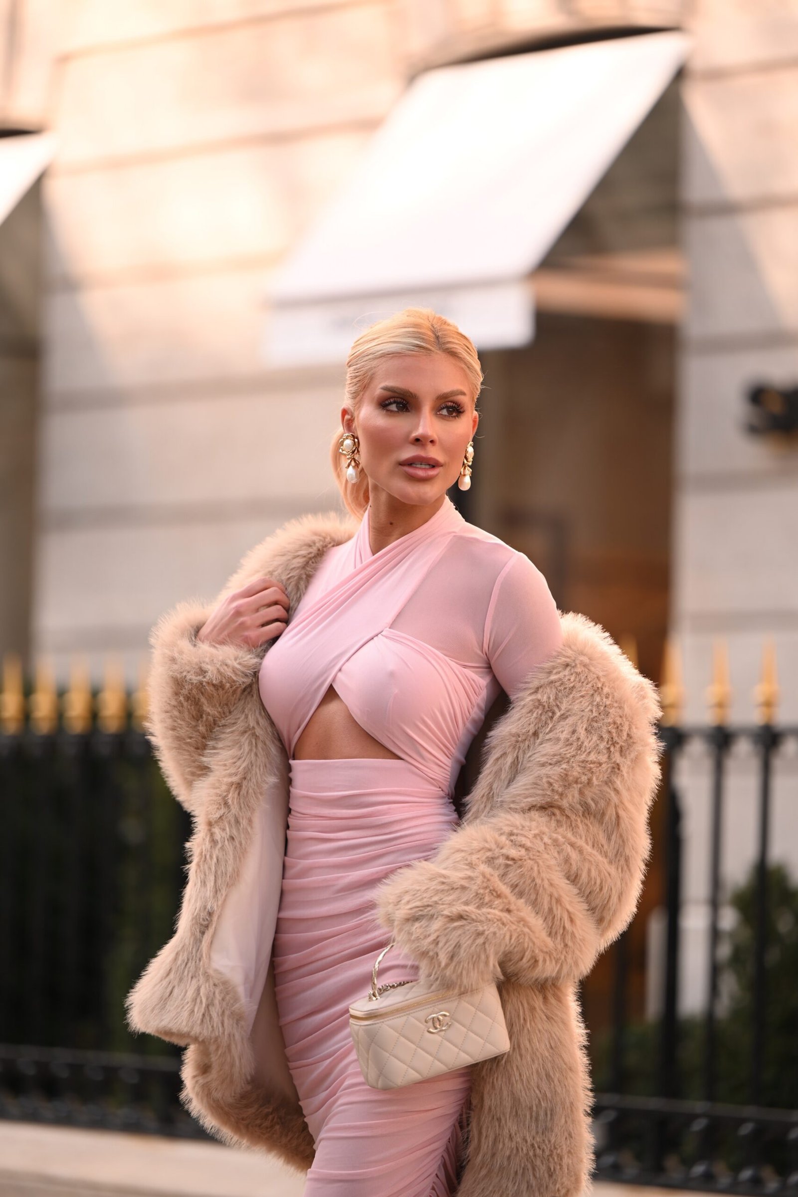 Vestido midi de organza bege: sofisticado e elegante, o vestido apresenta bordado em dourado, decote em “A” Limonada Pink