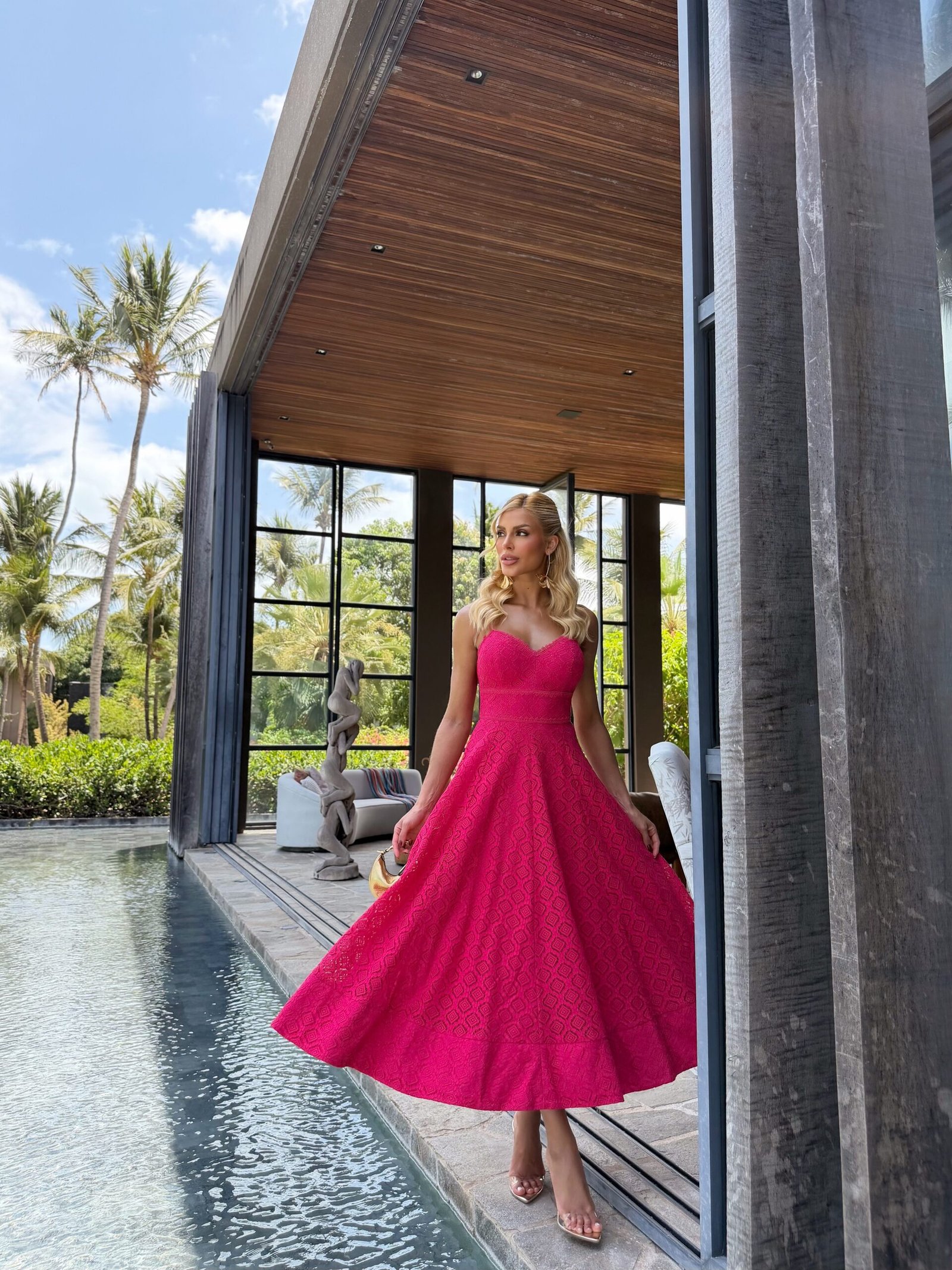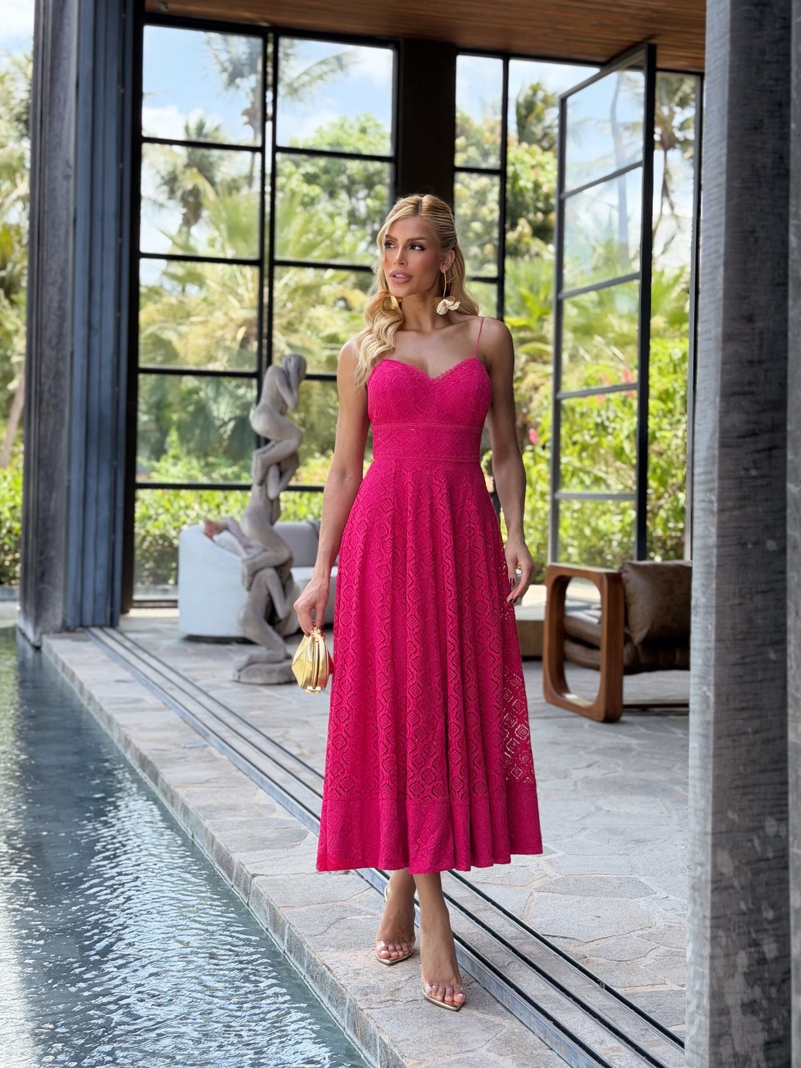O vestido midi em renda pink é perfeito para quem ama um look romântico, moderno e cheio de presença.