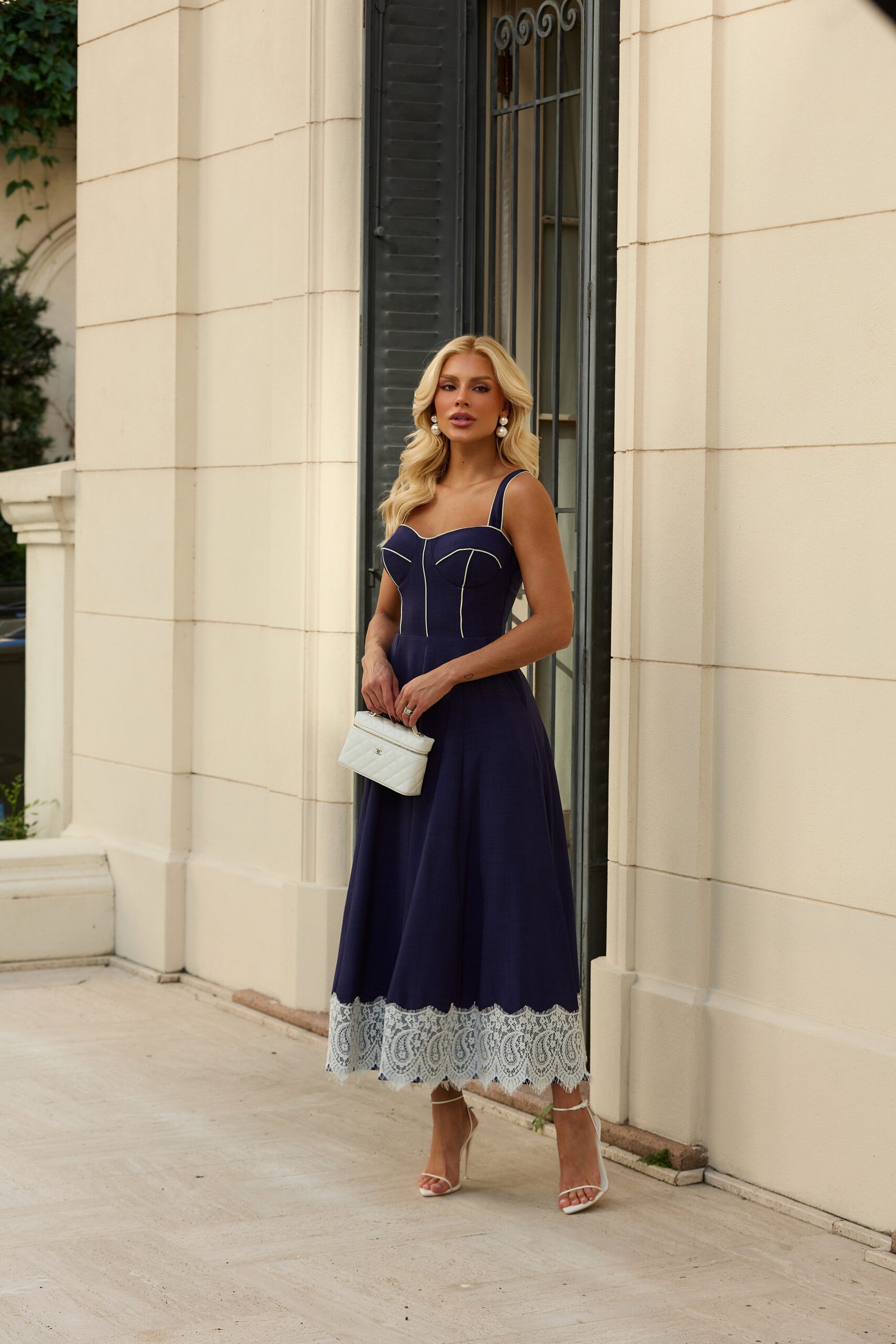 Vestido midi em textocrepe ravena premium, cor azul marinho, modelagem acinturada com busto estruturado, recortes marcados por vivo off-white e saia ampla com aplicação de renda chantilly na barra.