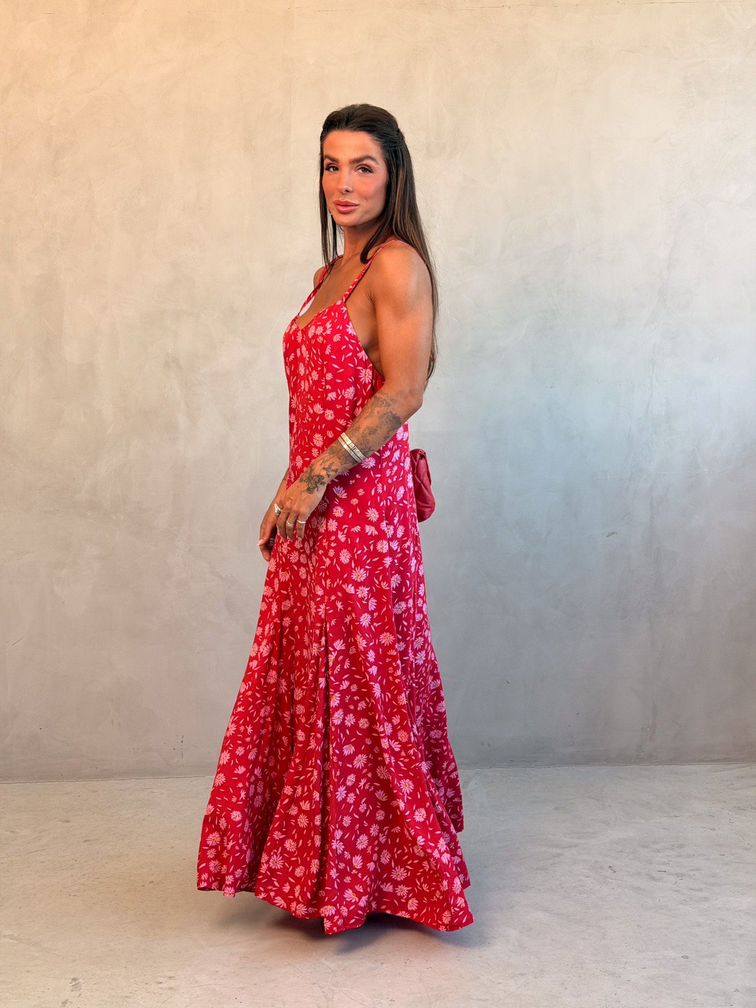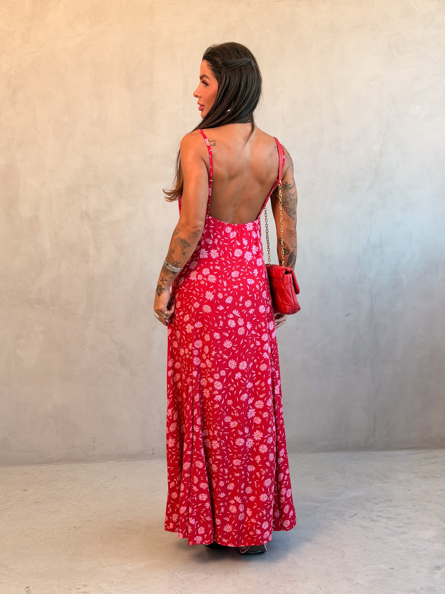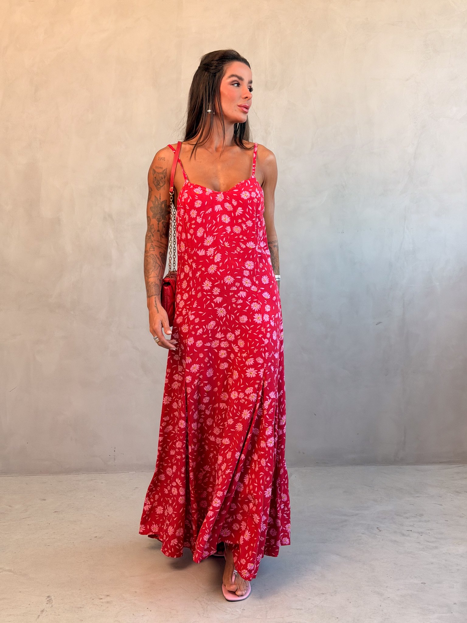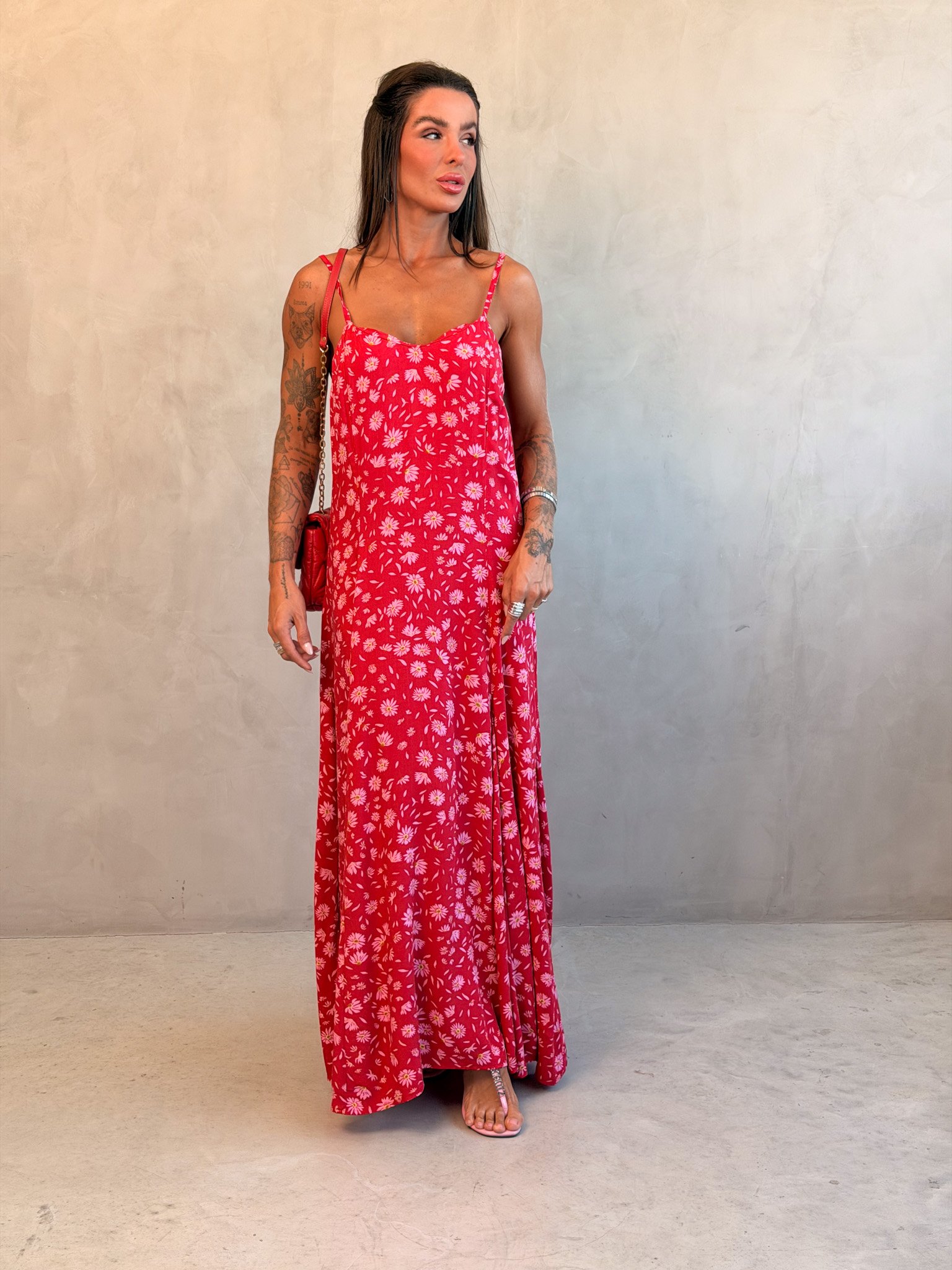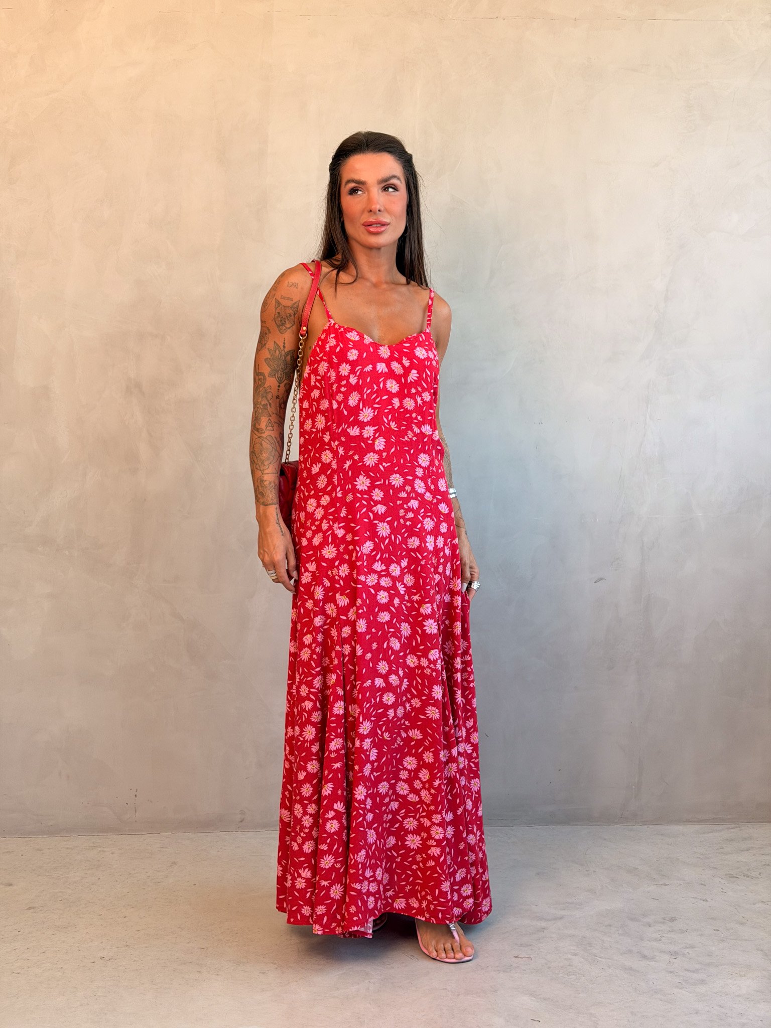 A estampa floral em fundo vermelho é vibrante e elegante, garantindo um visual marcante e ao mesmo tempo romântico. O caimento soltinho proporciona movimento lindo ao caminhar, perfeito para ocasiões especiais ao ar livre.