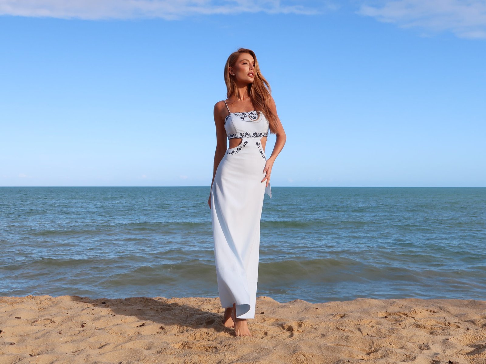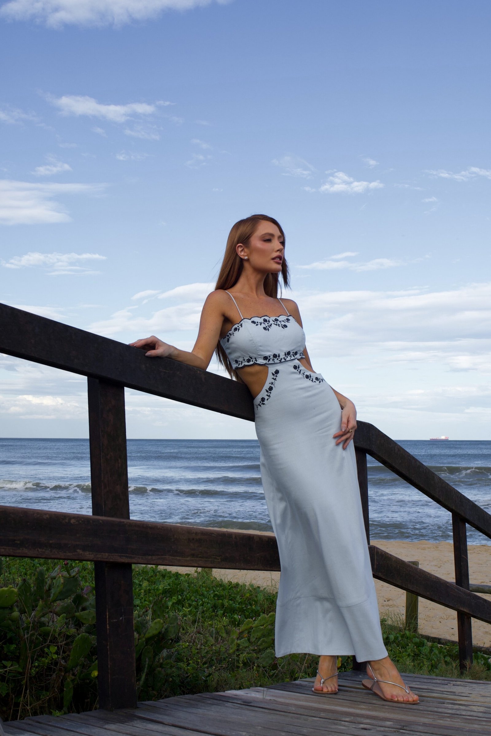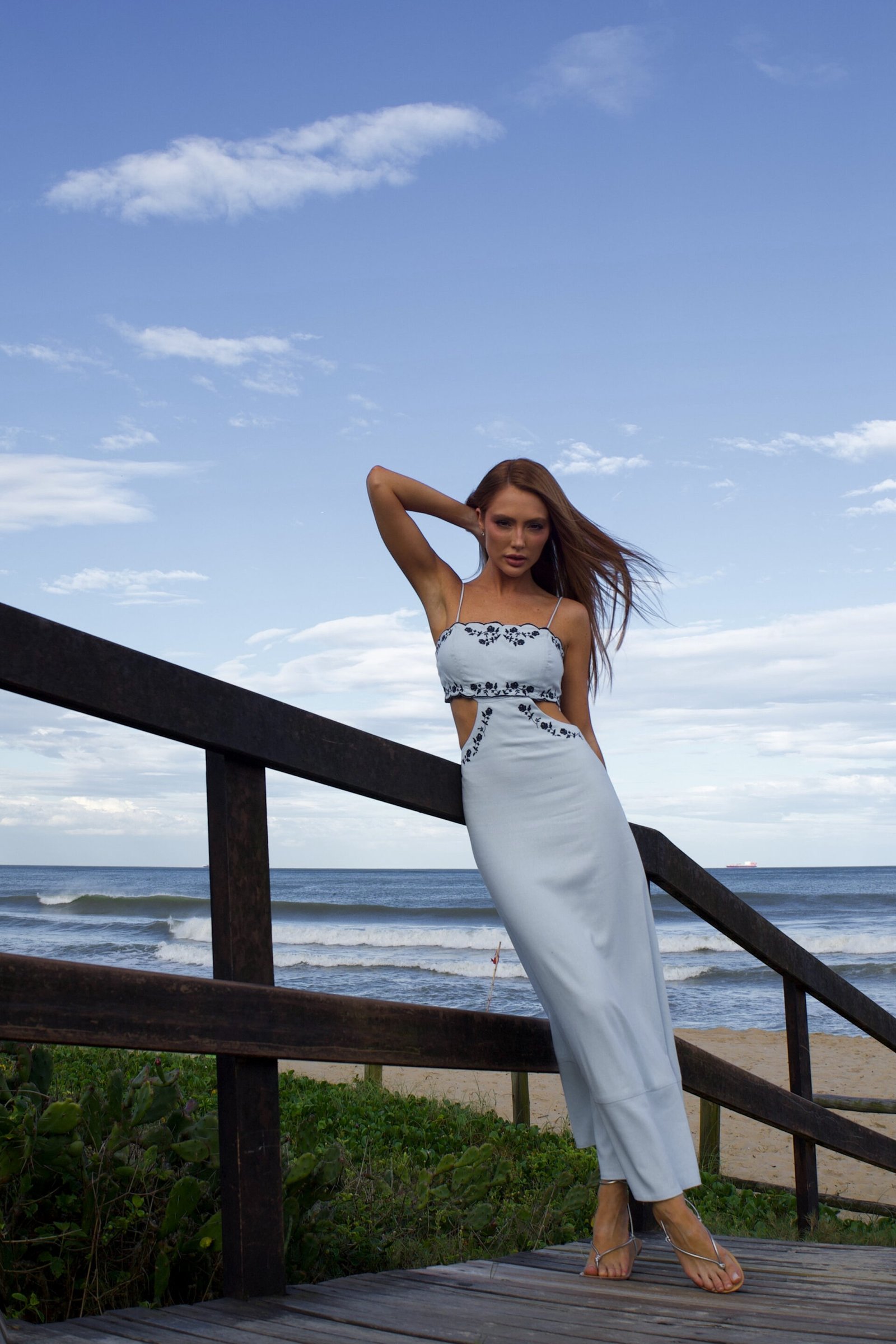 Vestido midi em off white, com alças finas, recortes laterais e bordados contrastantes que valorizam a silhueta. O viscolinho traz leveza e caimento fluido, alinhado à tendência resort chic e ao romantic summer, destaque no Verão 2026.