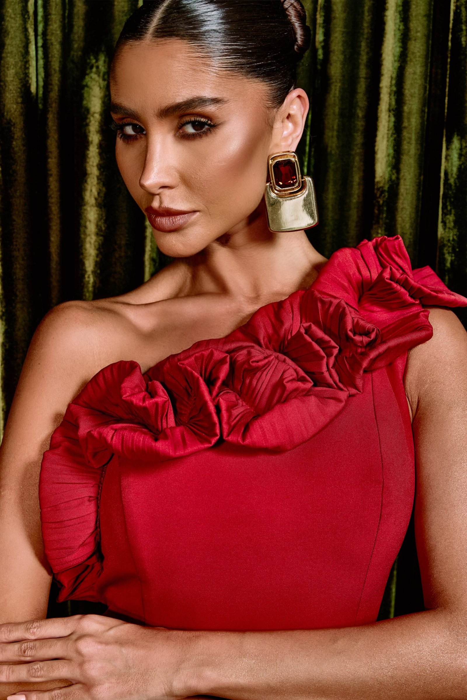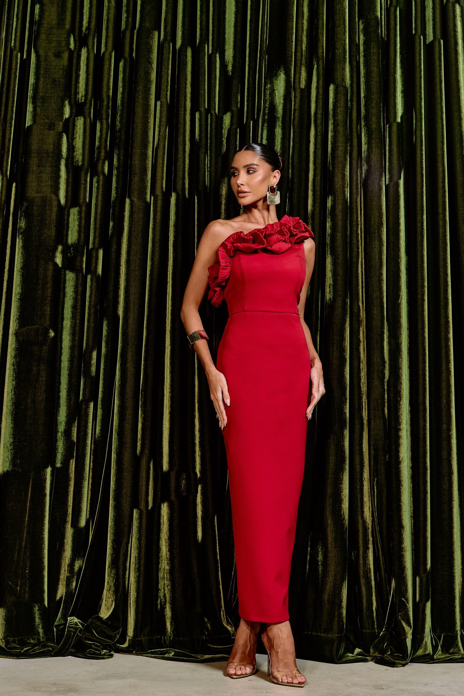 O Vestido Red Desire é a definição de elegância moderna. Com modelagem ajustada que valoriza as curvas femininas e detalhe de babados estruturados em um ombro só, ele traz um toque de drama e luxo na medida certa.
