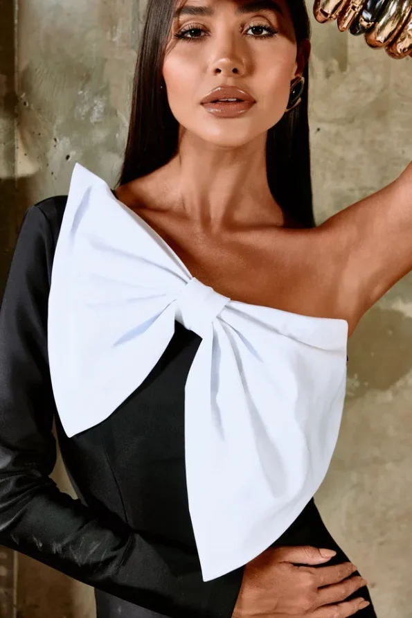 Elegante e marcante, o vestido é confeccionado em malha power, tecido que garante estrutura, conforto e caimento perfeito ao corpo. O design de um ombro só com laço contrastante traz um toque moderno e sofisticado, ideal para produções noturnas que pedem estilo e personalidade.