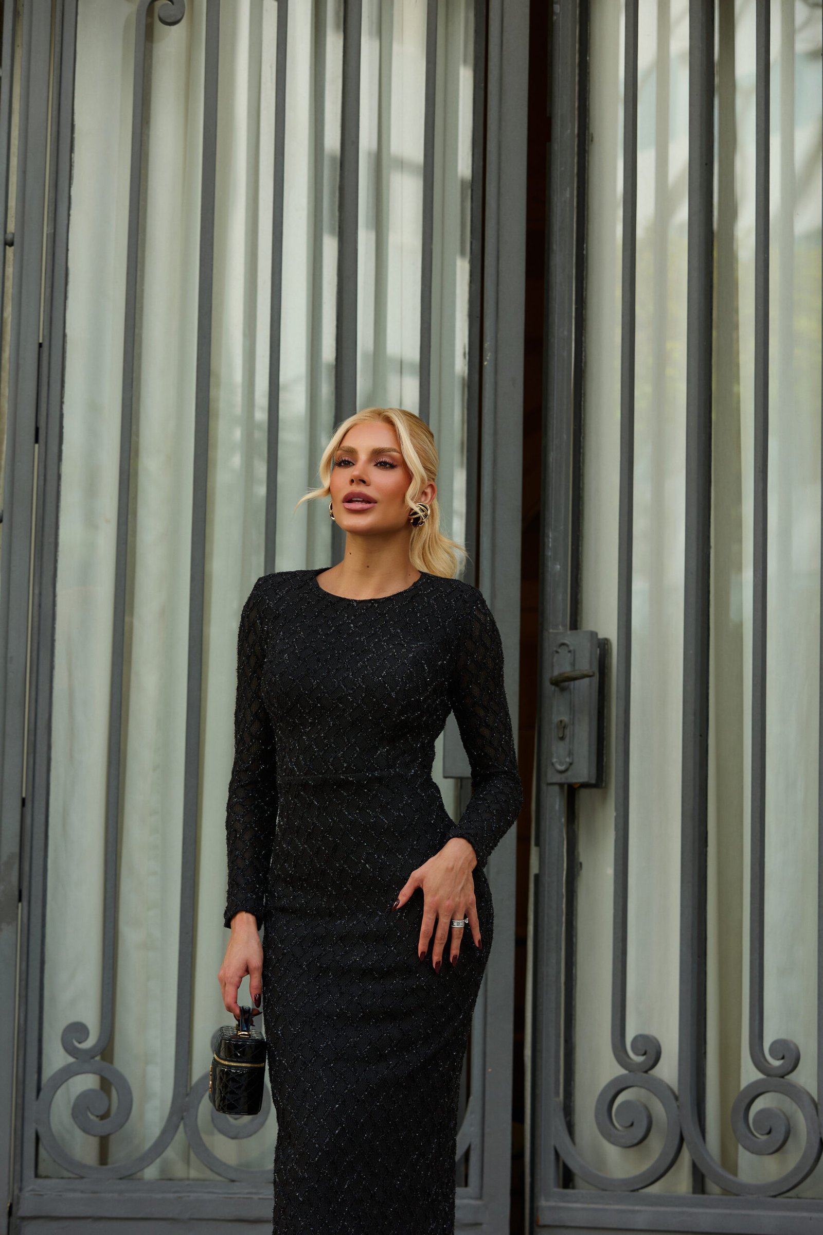 Vestido midi em malha lurex sofisticado, cor preto, modelagem ajustada ao corpo com mangas longas, ombreiras estruturadas e fenda nas costas.