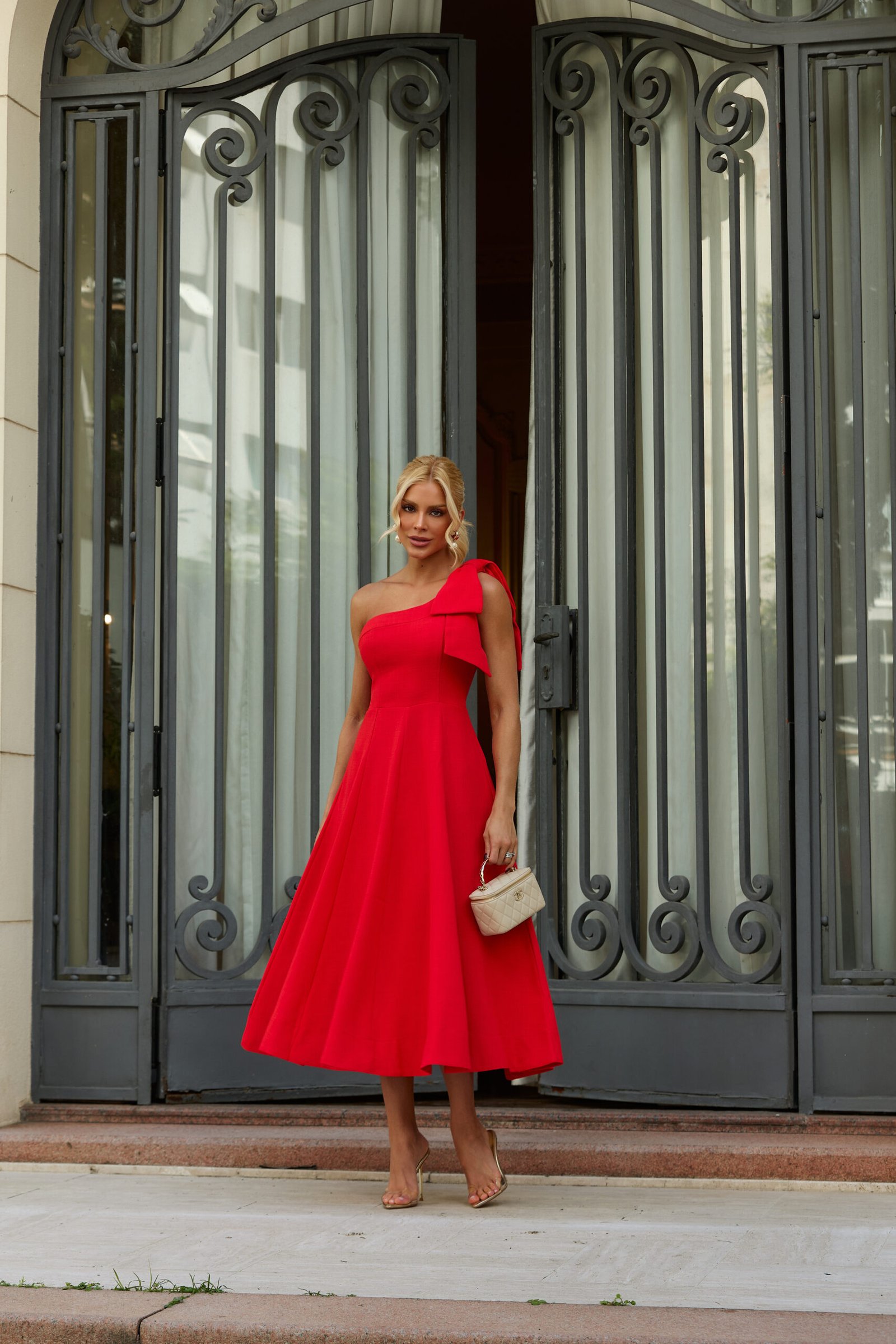 Vestido midi em crepe alfaiataria premium, cor vermelho, modelagem acinturada com saia ampla e fluida, decote um ombro só com aplicação de laço estruturado. Best seller da marca em nova cor.