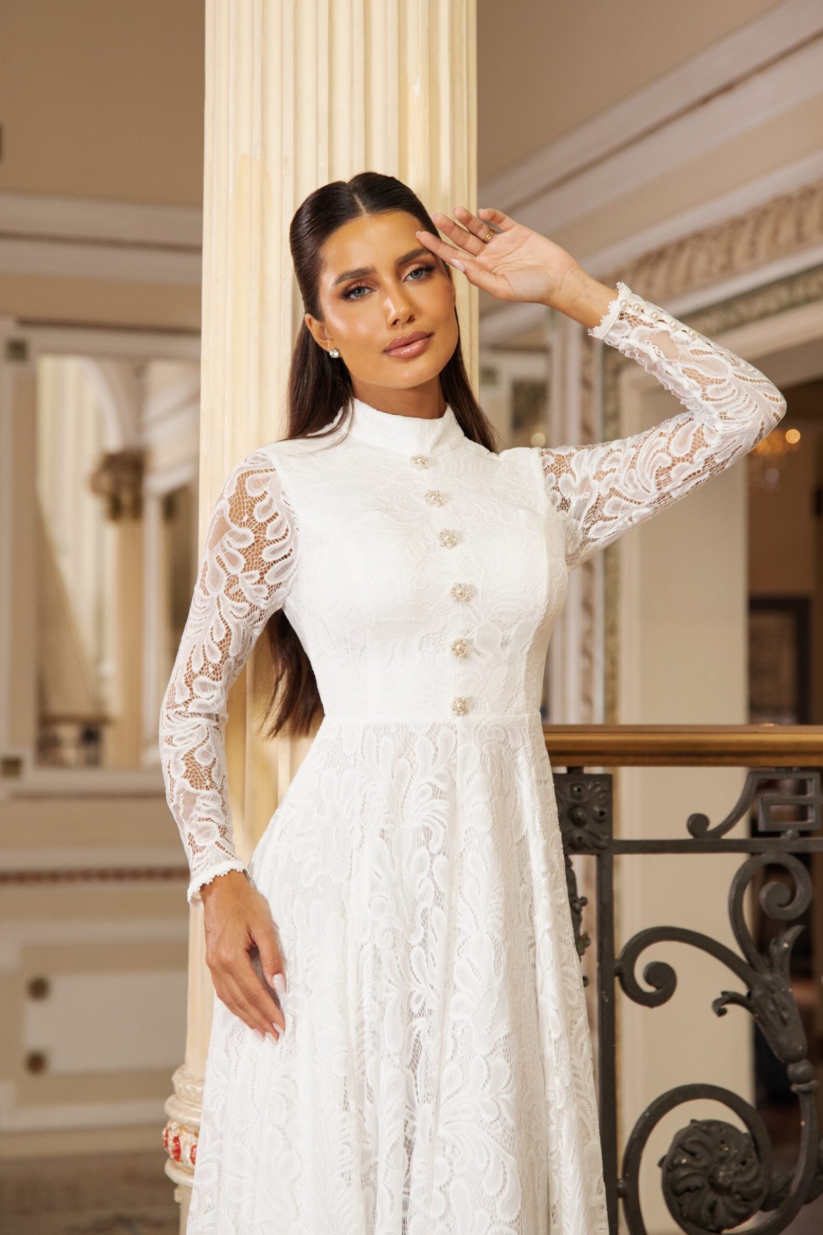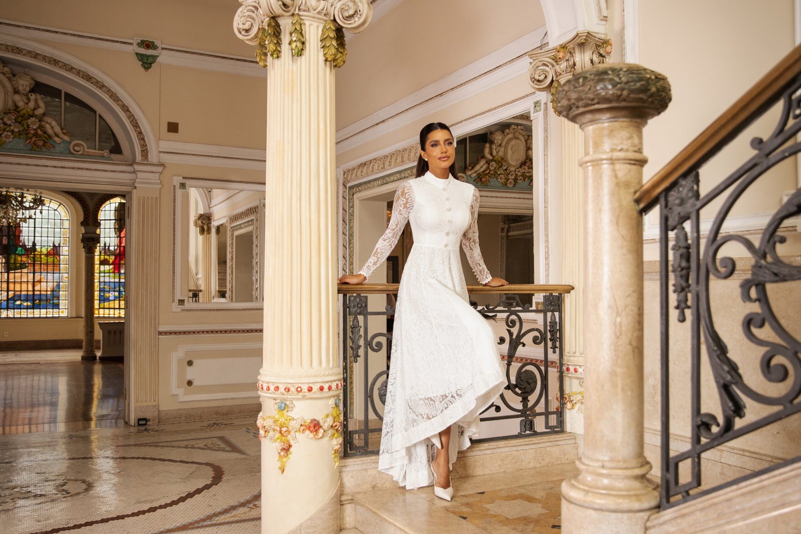 Vestido mullet em renda off white com modelagem acinturada e saia ampla de movimento elegante.