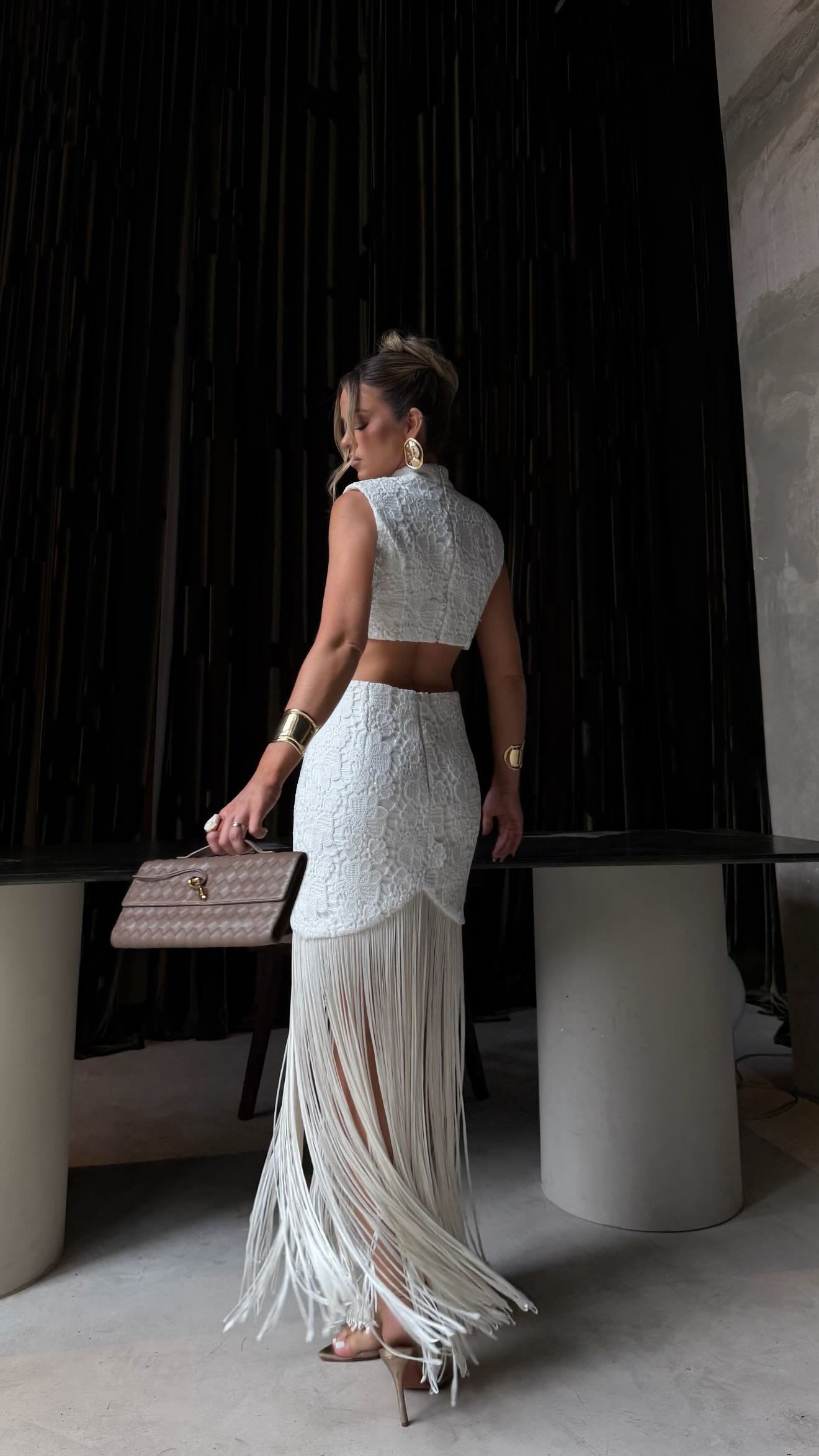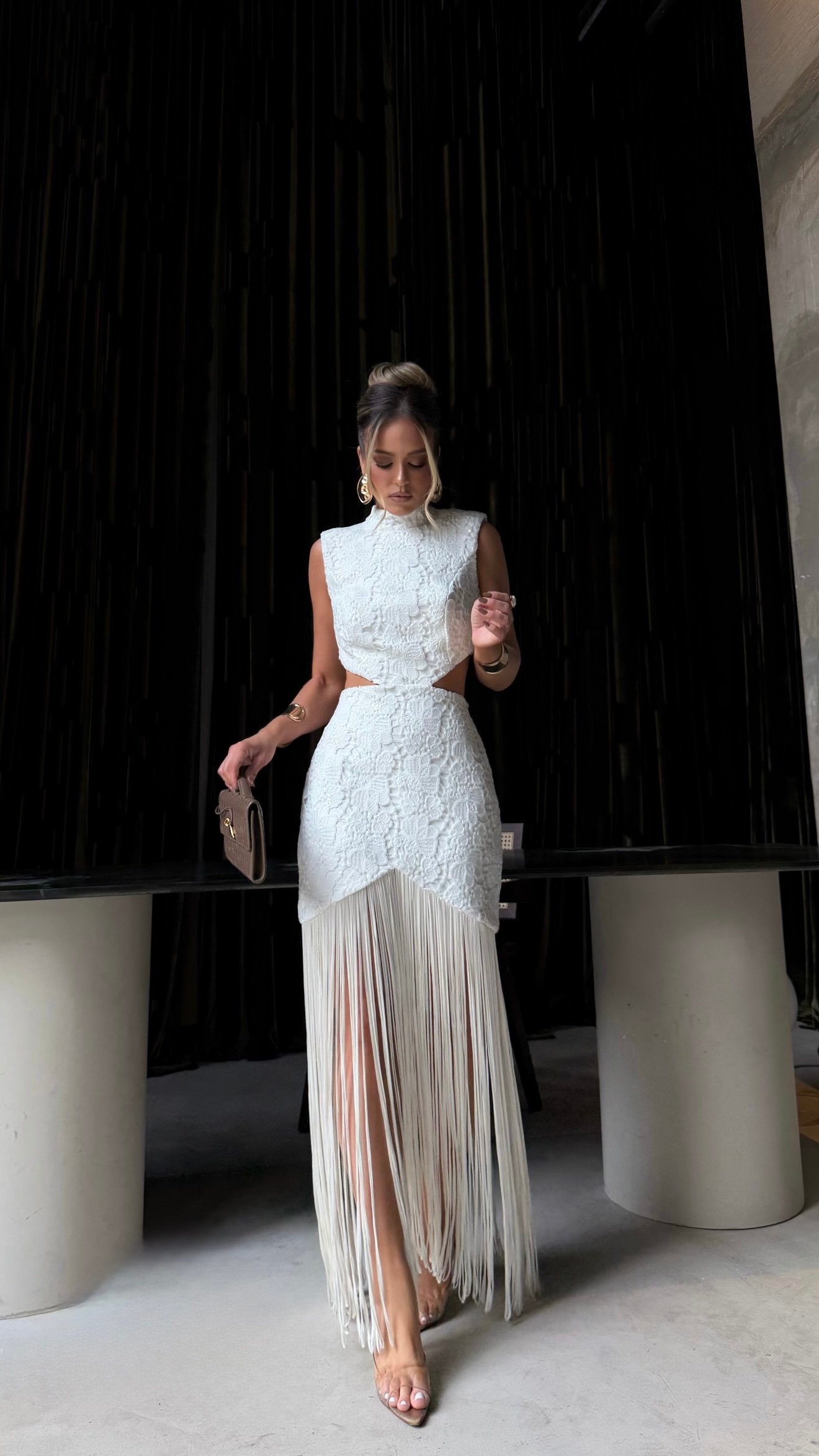 A parte inferior surpreende com uma saia em franjas longas, que cria movimento e leveza a cada passo — resultado perfeito para fotos, vídeos e entradas marcantes.