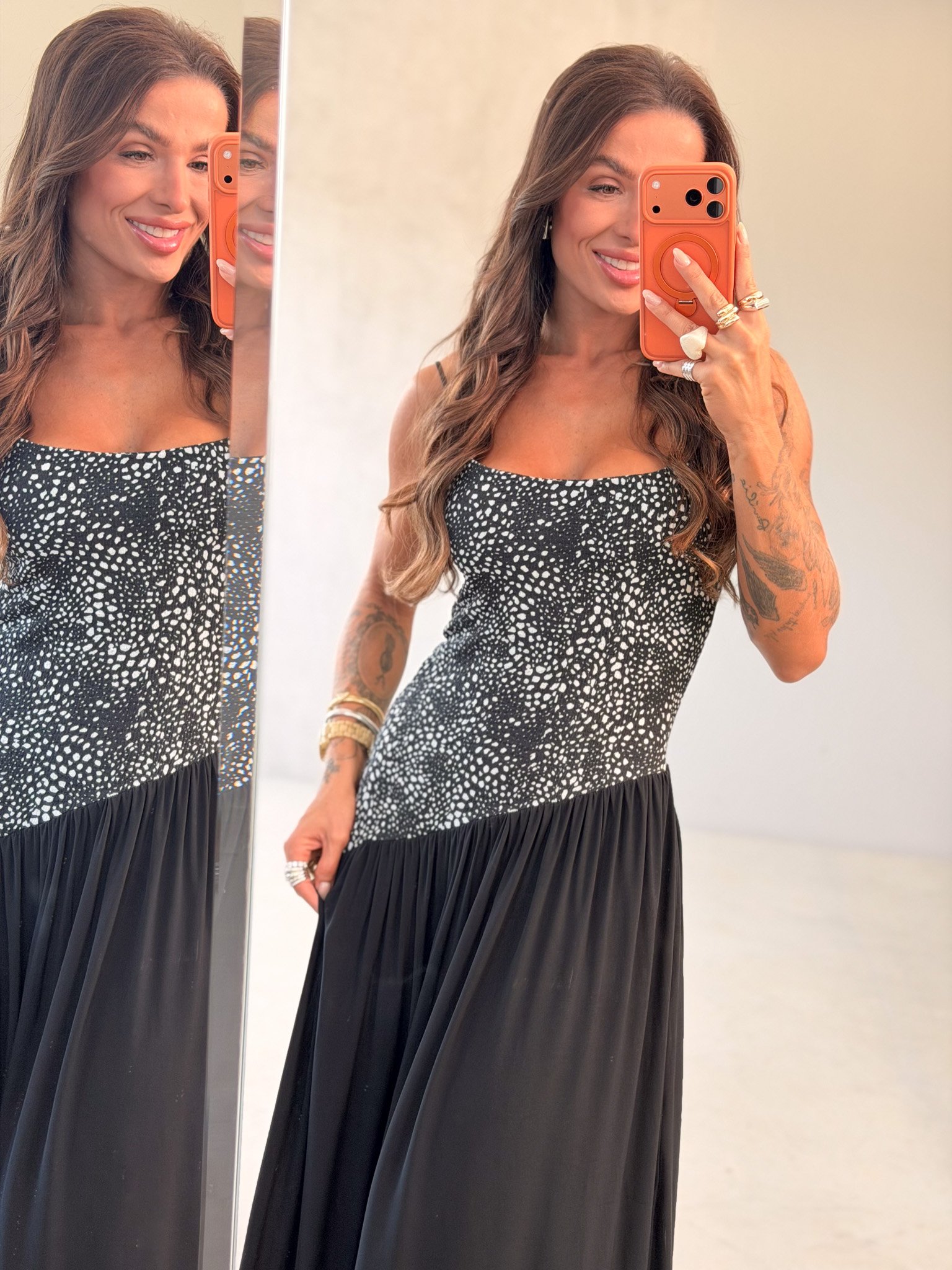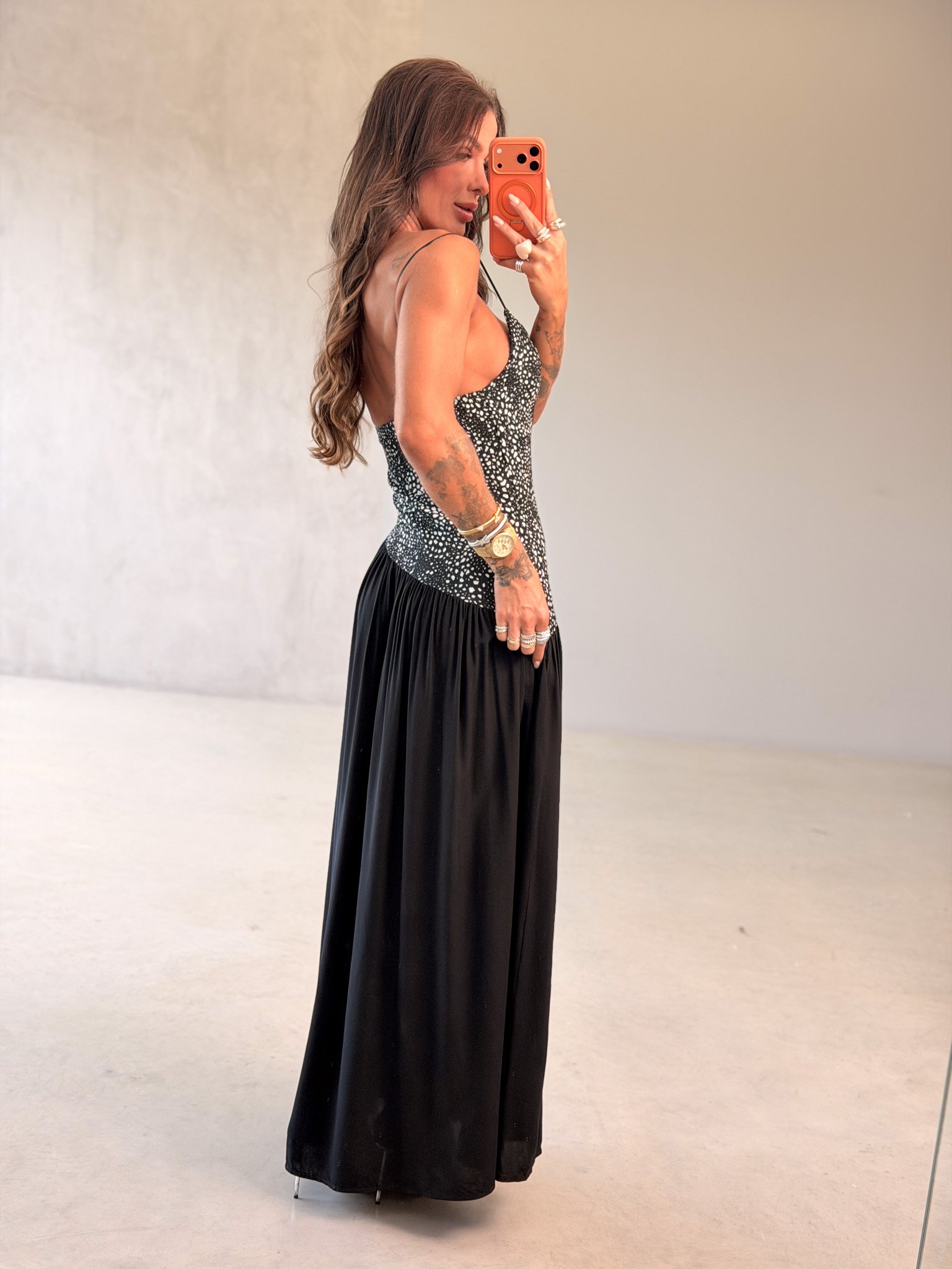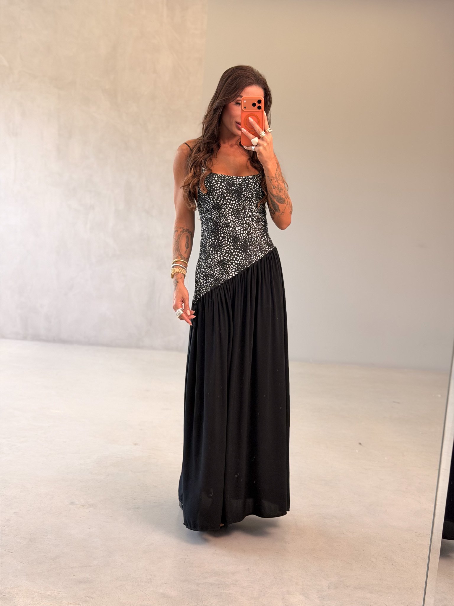 Com alças finas e caimento impecável no corpo, ele valoriza a silhueta com elegância e garante um look poderoso sem esforço. A saia fluida alonga e deixa a produção ainda mais refinada, ideal para eventos noturnos e produções sofisticadas.