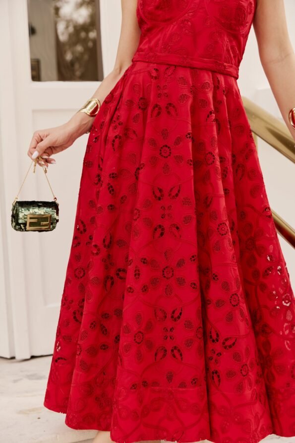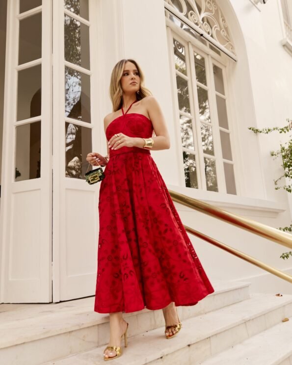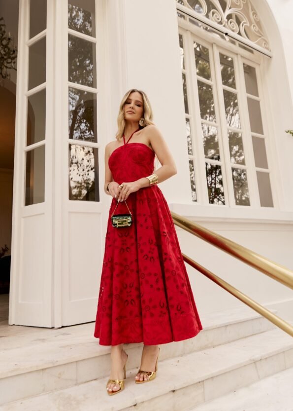 O Vestido Midi Laise Vermelho é confeccionado em laise premium com delicados bordados vazados florais, que trazem textura e elegância à peça.